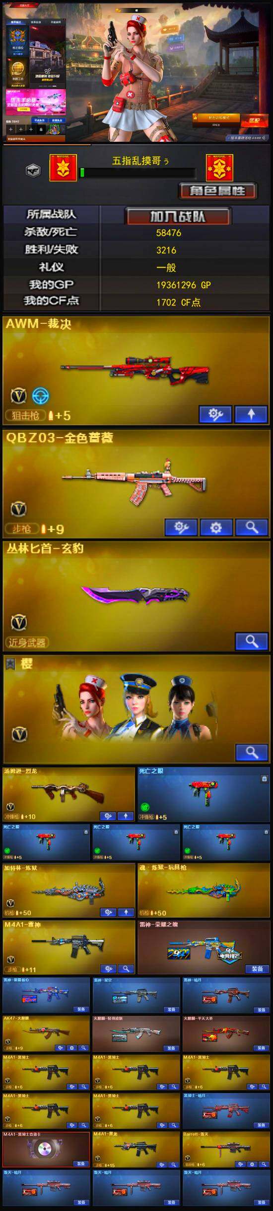 【英雄级武器】:AK47-火麒麟,AK47-麒麟,M4A1-黑龙,M4A1-雷神,M4A1-黑骑士*5,AK47-无影,M4A1-死神,AK12-天启,AK47-机械迷城,无影-神兵利器,QBZ03-金色蔷薇,AK-47-猩红传说*4,AK47-B-战神,AWM-天龙,Barrett-毁灭,Barrett-极光,AWM-裁决,加特林-炼狱,汤姆逊-烈龙,沙鹰-修罗,沙鹰-天神*2,屠龙*2,龙啸,擎天*3,麒麟刺,丛林匕首-玄豹,高爆手雷-玄豹,闪光弹-玄豹,烟雾弹-玄豹*2