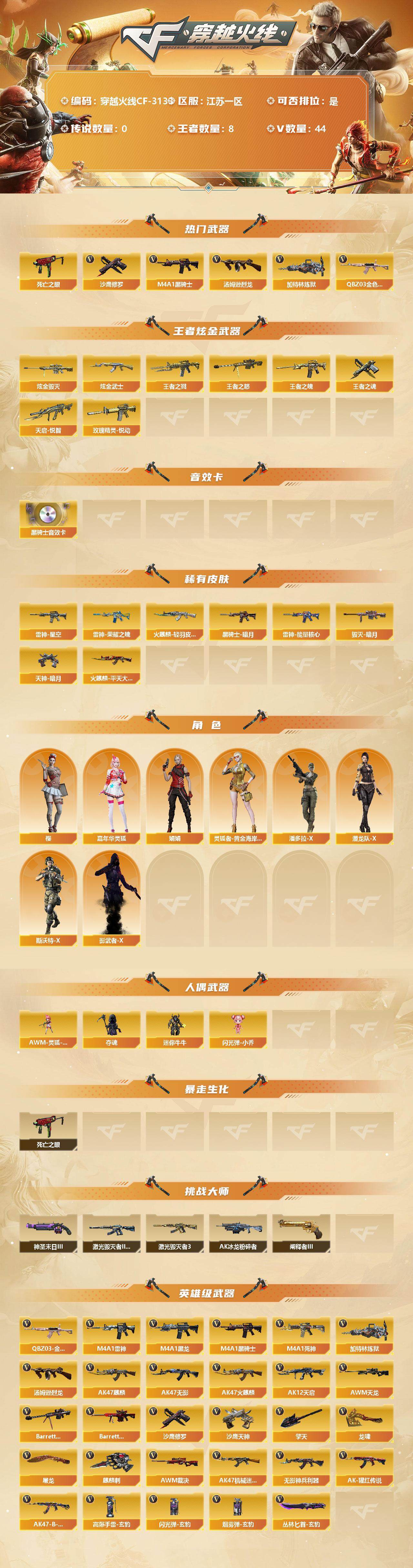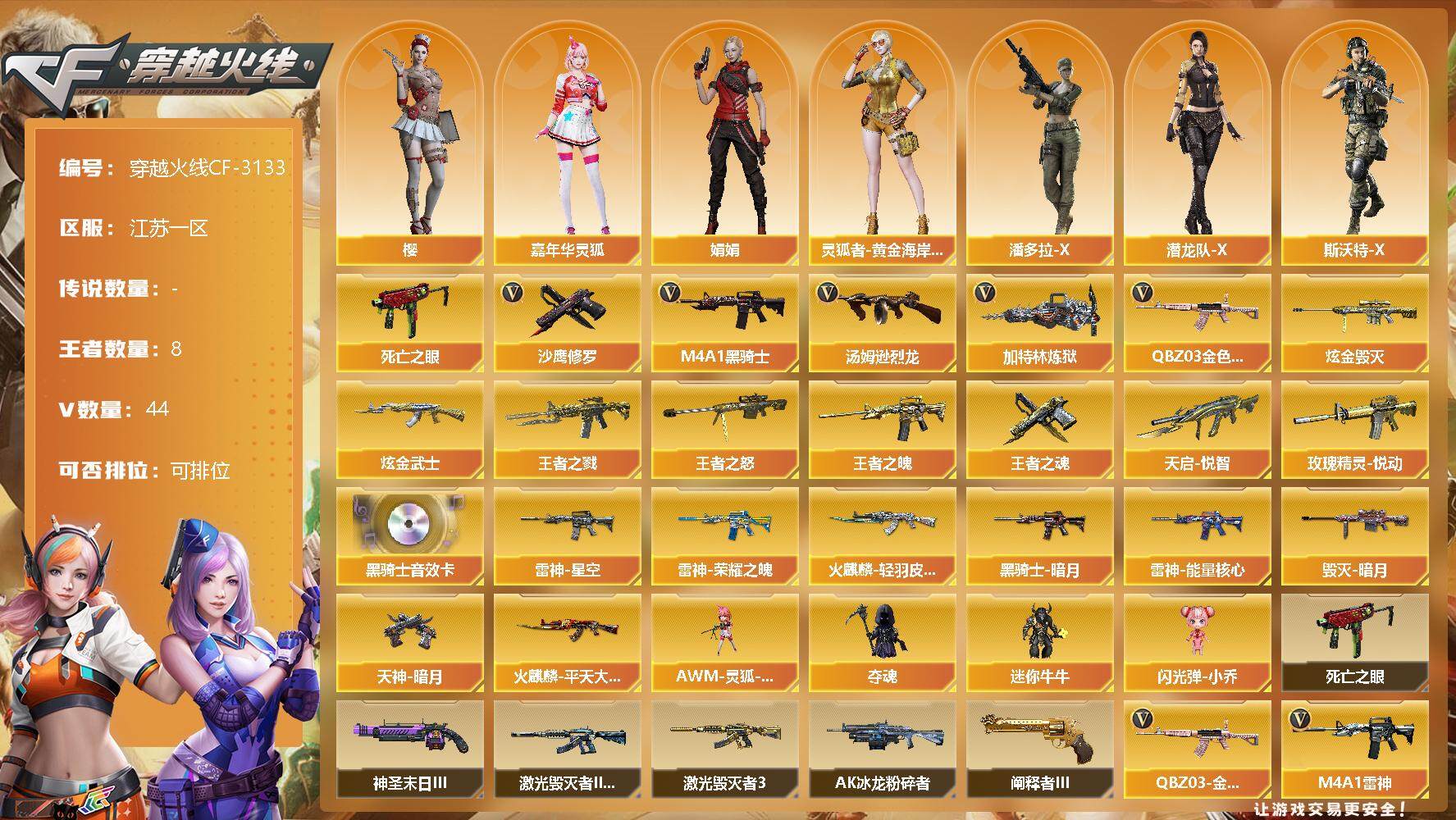 [13202777]江苏一区-44V-8王者-3炫金 【热门武器】:QBZ03-金色蔷薇,死亡之眼*4,M4A1-黑骑士*5,汤姆逊-烈龙,加特林-炼狱,沙鹰-修罗 【王者炫金武器】:王者之戮,天启-悦智,玫瑰精灵-悦动,王者之魄,王者之怒*2,王者之魂,炫金毁灭*2,炫金武士 【音效卡】:M4A1-黑骑士音效卡 【皮肤】:雷神-暗月,雷神-能量核心,雷神-荣耀之魄,雷神-星空,火麒麟-雷神,火麒麟-轻羽皮肤,火麒麟-平天大圣,毁灭-暗月*3,黑骑士-暗月,无影-暗月,无影-能量核心,死神-秘银,天启-暗月,战神-粉色甜心皮肤*2,战神-紫绶金章皮肤*3,战神-流金岁月皮肤*3,极光-能量核心,修罗-能量核心,天神-暗月*2 【角色】:樱,嘉年华灵狐,娟娟,灵狐者-黄金海岸,潘多拉-X,潜龙队-X,斯沃特-X,影武者-X 【人偶武器】:AWM-灵狐-15周年嘉年华,夺魂,迷你牛牛,闪光弹-小乔 【暴走生化】:死亡之眼*4 【挑战大师】:AK47-冰龙粉碎者,激光毁灭者III-白马银枪,激光毁灭者III,神圣爆裂者-末日III*2,阐释者III 【英雄级武器】:AK47-火麒麟,AK47-麒麟,M4A1-黑龙,M4A1-雷神,M4A1-黑骑士*5,AK47-无影,M4A1-死神,AK12-天启,AK47-机械迷城,无影-神兵利器,QBZ03-金色蔷薇,AK-47-猩红传说*4,AK47-B-战神,AWM-天龙,Barrett-毁灭,Barrett-极光,AWM-裁决,加特林-炼狱,汤姆逊-烈龙,沙鹰-修罗,沙鹰-天神*2,屠龙*2,龙啸,擎天*3,麒麟刺,丛林匕首-玄豹,高爆手雷-玄豹,闪光弹-玄豹,烟雾弹-玄豹*2 【特殊枪械】:5黑骑士,1烈龙,1炼狱
