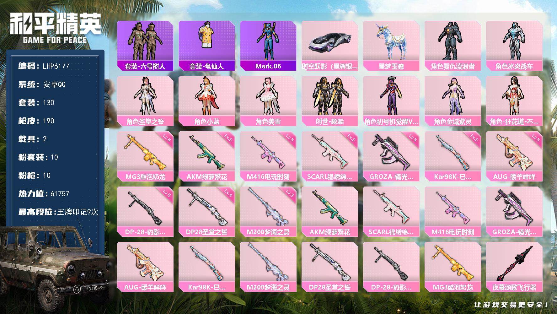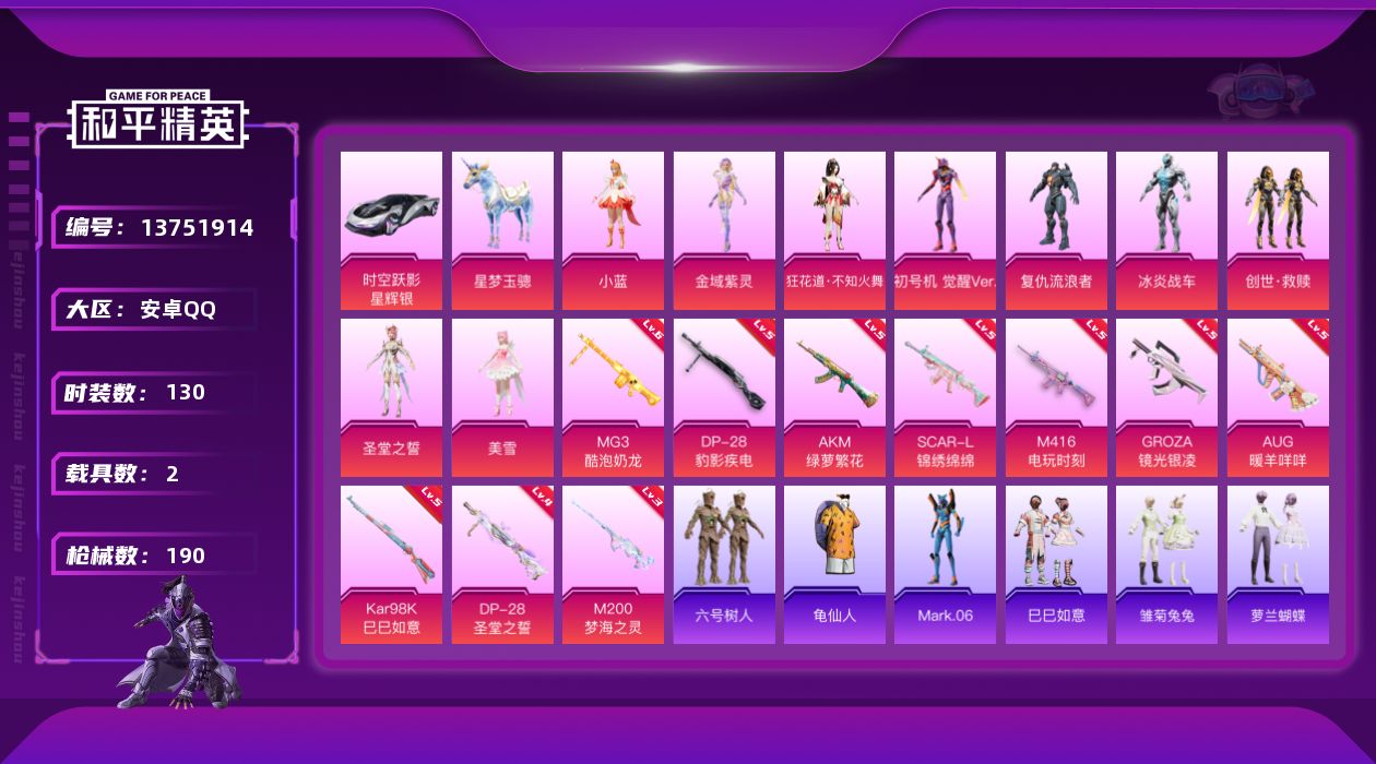 [13751914]可二次【店主推荐捡漏号!可直接换绑】/素材身法号/地铁满天赋 安卓 手Q-10粉装-10特效枪-2载具-7粉色飞行器-6.1w热力值-9王牌印记-130套装-190枪皮【热门品类】:套装-六号树人,套装-龟仙人,角色-Mark.06【粉色载具】:时空跃影(星辉银),星梦玉骢【粉色套装】:角色-复仇流浪者,角色-冰炎战车,角色-圣堂之誓,角色-小蓝,角色-美雪,套装-创世·救赎,角色-初号机 觉醒Ver.,角色-金域紫灵,角色-狂花道·不知火舞【粉色枪皮等级】:AKM-绿萝繁花(五级),SCAR-L-锦绣绵绵(五级),M416-电玩时刻(五级),GROZA-镜光银凌(五级),AUG-暖羊咩咩(五级),Kar98K-巳巳如意(五级),M200-梦海之灵(三级),DP-28-圣堂之誓(四级),DP-28-豹影疾电(五级),MG3-酷泡奶龙(六级)【粉色飞行器】:夜幕颂歌飞行器,沙丘之主天马,龙翔九天飞行器,深渊漩涡飞行器,曦光华影飞行器,万象金身飞行器