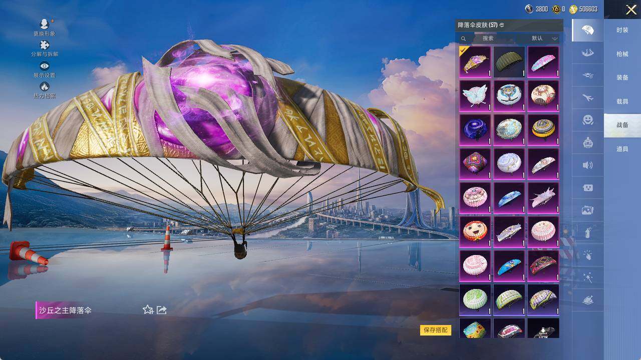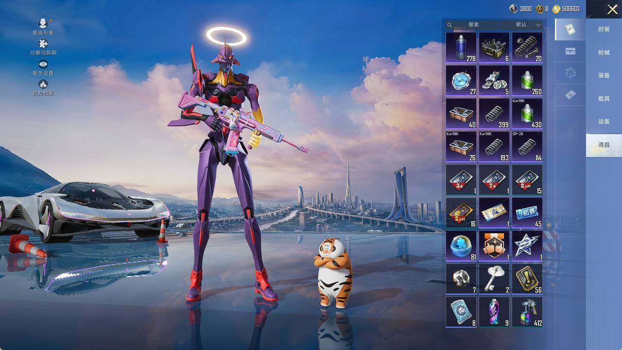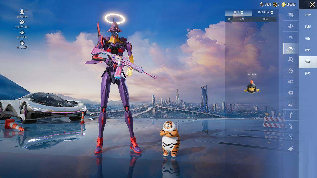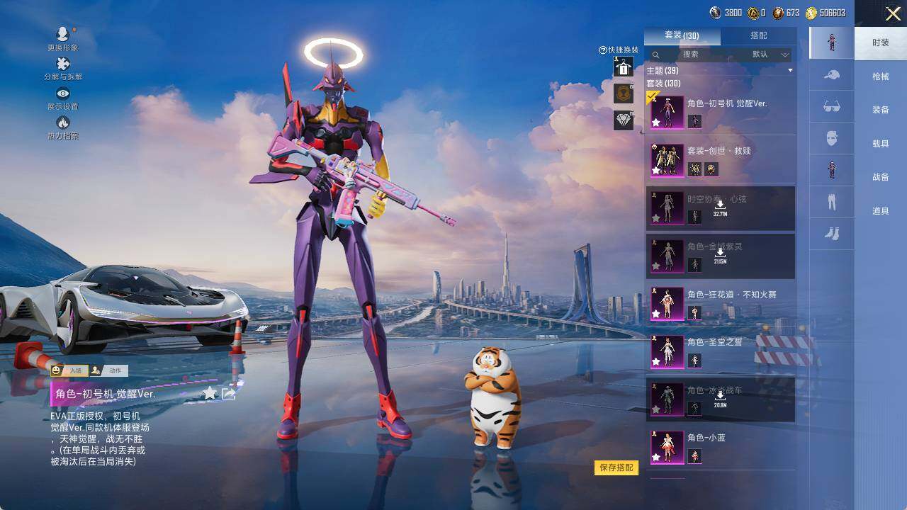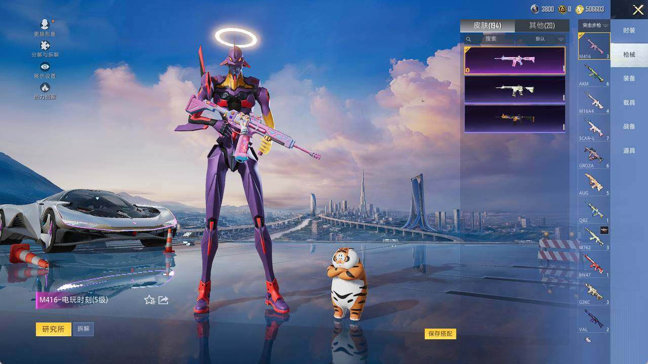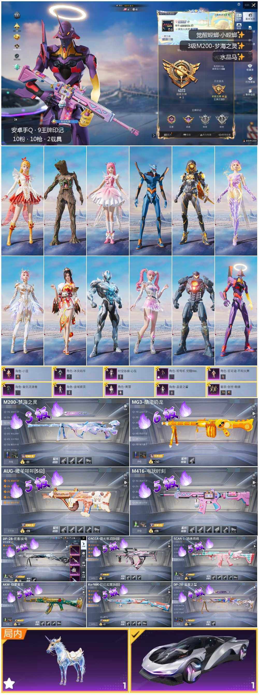AKM-绿萝繁花,M416-电玩时刻,GROZA-镜光银凌,AUG-暖羊咩咩,Kar98K-巳巳如意,M200-梦海之灵,DP-28-圣堂之誓,MG3-酷泡奶龙