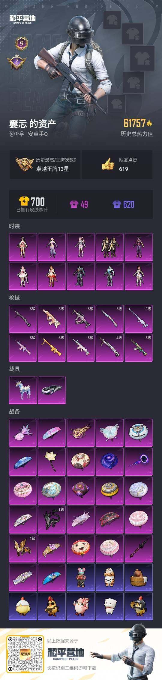 - [12685187]安卓 手Q-2粉装-3特效枪-1载具-1粉色飞行器-1.5w热力值-2王牌印记-29套装-42枪皮【粉色载具】:阿斯顿马丁DBS(红)【粉色套装】:粉装-花间之火,粉装-蜜桃特工【粉色枪皮等级】:M416-心之恋语(四级),M762-甜蜜誓约(四级),Kar98K-巳巳如意(一级)【粉色飞行器】:甜蜜誓约飞行器