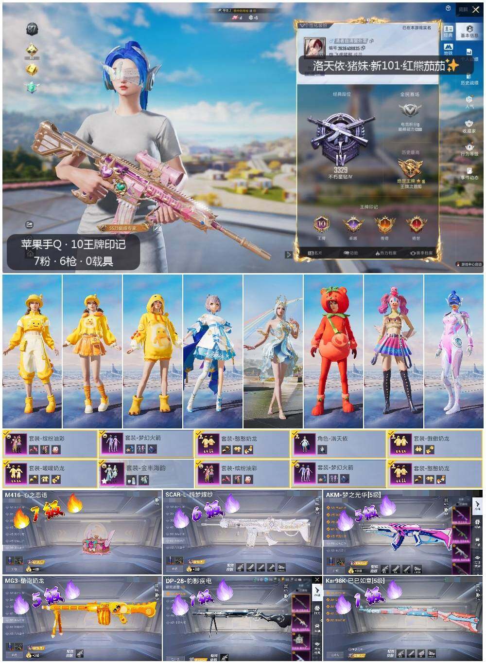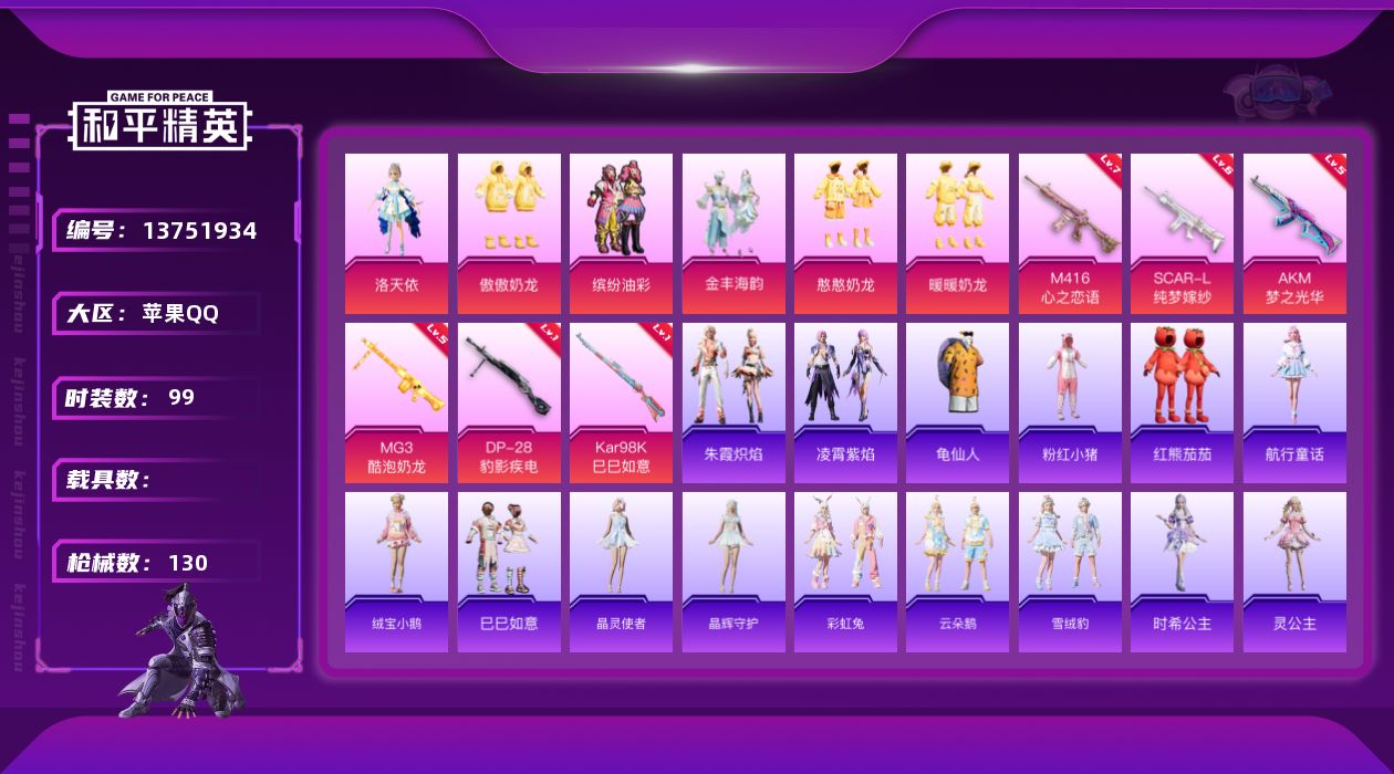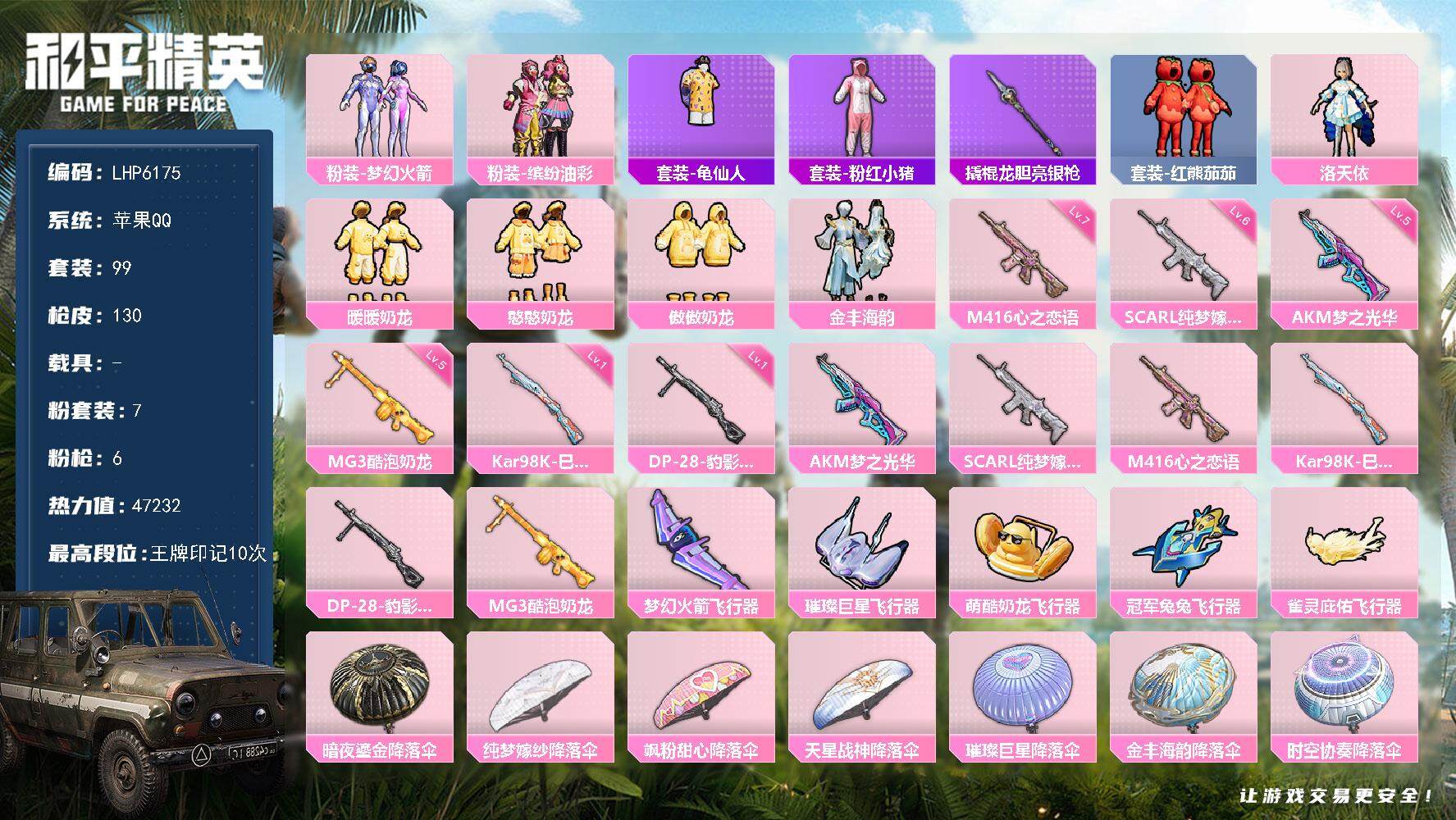 [13751934]【店主推荐捡漏号!可直接换绑】 苹果 手Q-7粉装-6特效枪-5粉色飞行器-4.7w热力值-10王牌印记-99套装-130枪皮【热门品类】:粉装-梦幻火箭,粉装-缤纷油彩,套装-龟仙人,套装-粉红小猪,撬棍-龙胆亮银枪,套装-红熊茄茄【粉色套装】:粉装-梦幻火箭,粉装-缤纷油彩,角色-洛天依,粉装-暖暖奶龙,粉装-憨憨奶龙,粉装-傲傲奶龙,粉装-金丰海韵【粉色枪皮等级】:AKM-梦之光华(五级),SCAR-L-纯梦嫁纱(六级),M416-心之恋语(七级),Kar98K-巳巳如意(一级),DP-28-豹影疾电(一级),MG3-酷泡奶龙(五级)【粉色飞行器】:梦幻火箭飞行器,璀璨巨星飞行器,萌酷奶龙飞行器,冠军兔兔飞行器,雀灵庇佑飞行器