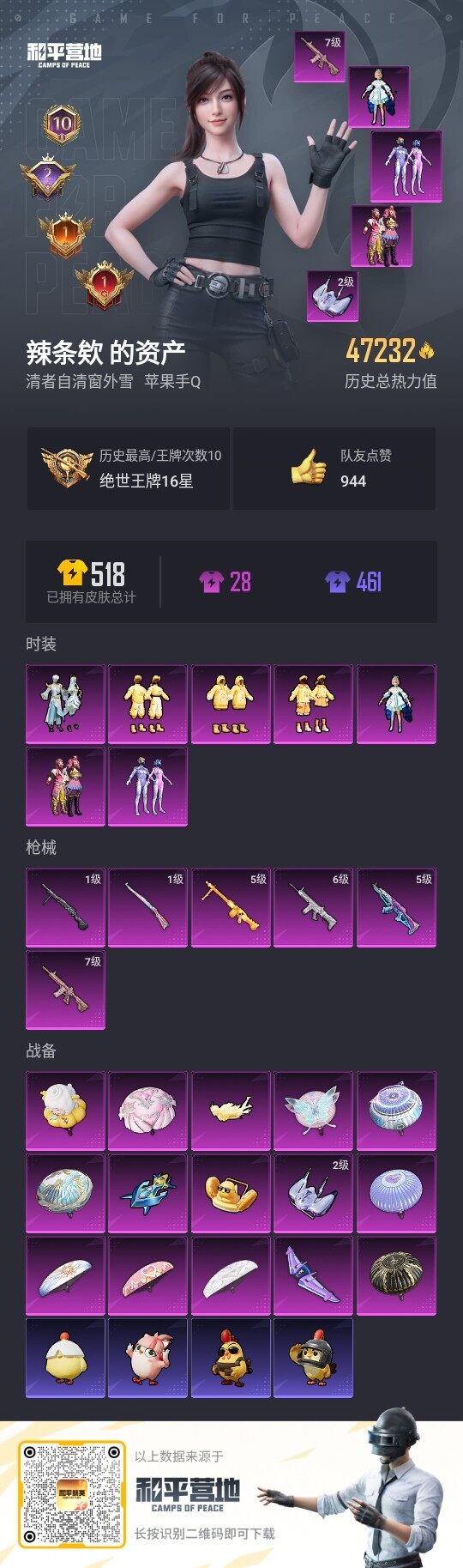 - PX_2083069- 苹果手Q-9王牌印记-5粉装-8特效枪-0载具-52761热力值-142套装-172枪皮-2卓越印记-1传奇印记 【5粉装】,幻彩电音,星穹咏叹调,智能音符,守护天翼,数码大师 【8特效枪】AKM-绿萝繁花-5级 M416-电玩时刻-5级 GROZA-镜光银凌-5级 AUG-暖羊咩咩-5级 Kar98K-巳巳如意-5级 UMP45-量子极限-5级 AKS-74U-星穹咏叹调