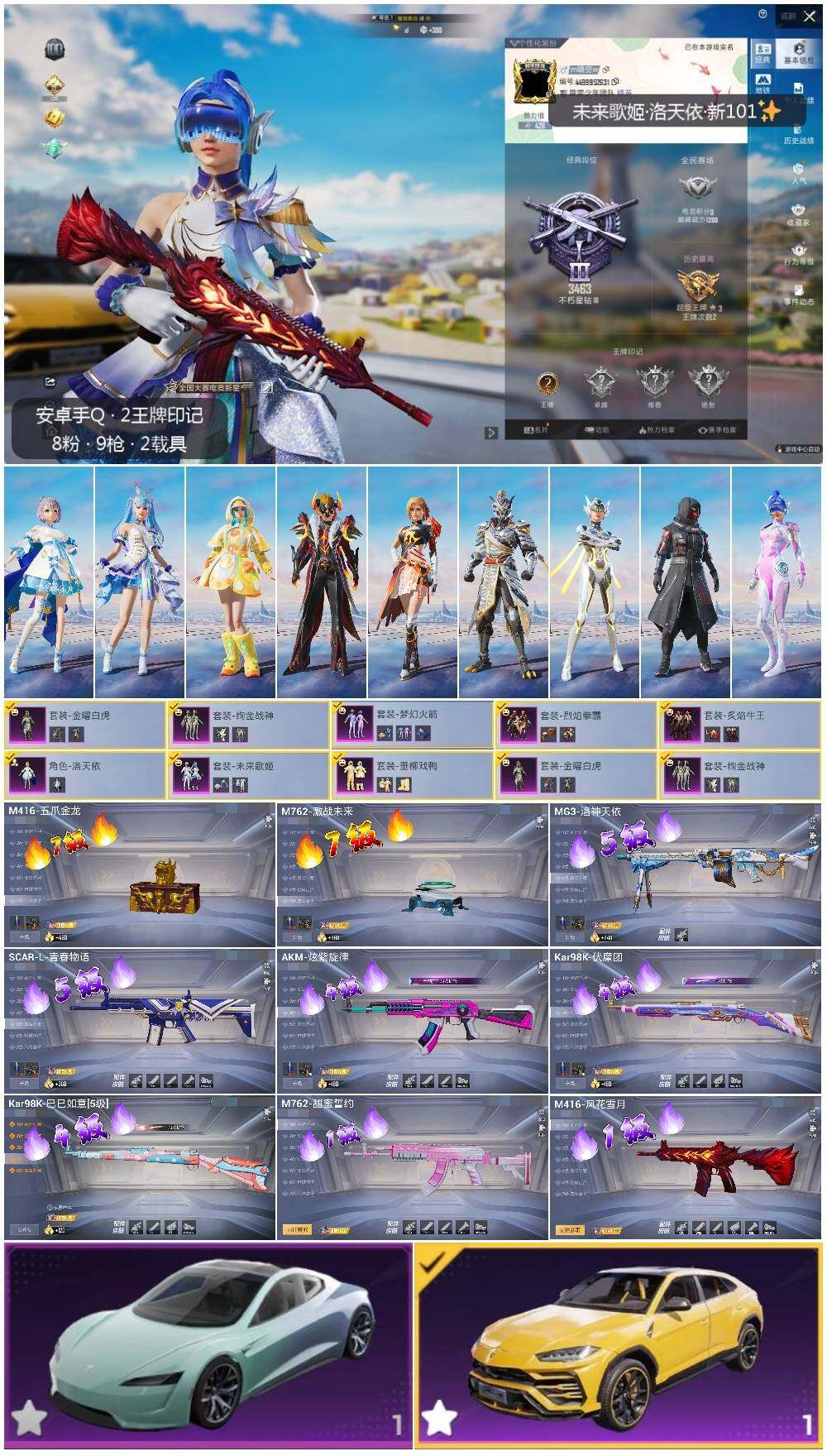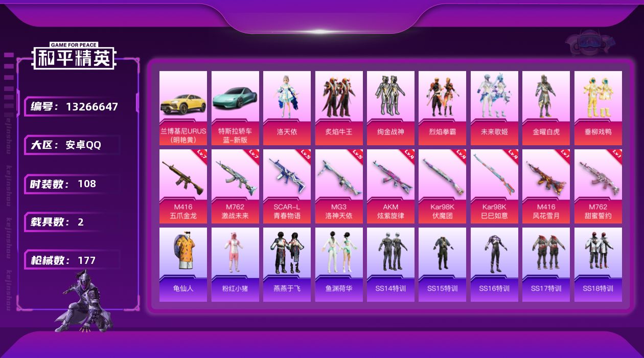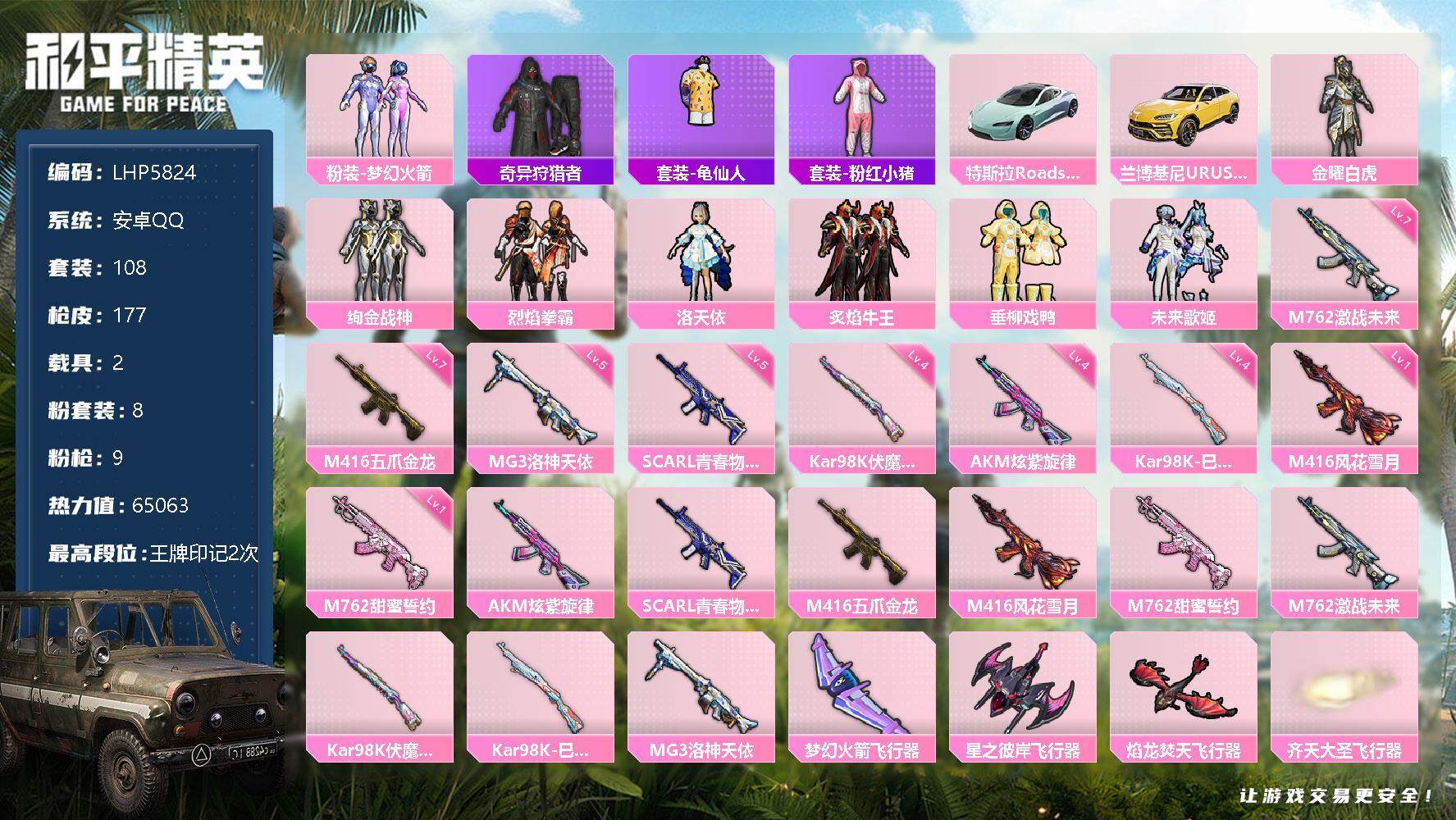 [13266647]素材身法号 安卓 手Q-8粉装-9特效枪-2载具-5粉色飞行器-6.5w热力值-2王牌印记-108套装-177枪皮【热门品类】:粉装-梦幻火箭,套装-奇异狩猎者,套装-龟仙人,套装-粉红小猪【粉色载具】:特斯拉Roadster(水滴蓝),兰博基尼URUS(明艳黄)【粉色套装】:粉装-金曜白虎,粉装-梦幻火箭,粉装-绚金战神,粉装-烈焰拳霸,角色-洛天依,粉装-炙焰牛王,粉装-垂柳戏鸭,粉装-未来歌姬【粉色枪皮等级】:AKM-炫紫旋律(四级),SCAR-L-青春物语(五级),M416-五爪金龙(七级),M416-风花雪月(一级),M762-甜蜜誓约(一级),M762-激战未来(七级),Kar98K-伏魔团(四级),Kar98K-巳巳如意(四级),MG3-洛神天依(五级)【粉色飞行器】:梦幻火箭飞行器,星之彼岸飞行器,焰龙焚天飞行器,齐天大圣飞行器,黄族统领飞行器