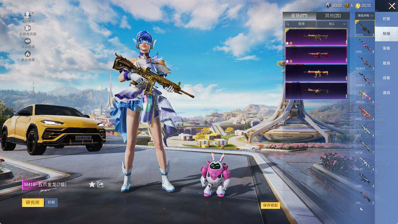 AKM-炫紫旋律,SCAR-L-青春物语,M416-五爪金龙,M416-风花雪月,M762-甜蜜誓约,M762-激战未来,Kar98K-伏魔团,Kar98K-巳巳如意,MG3-洛神天依