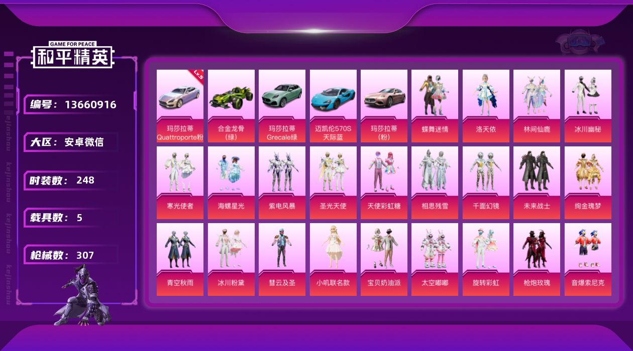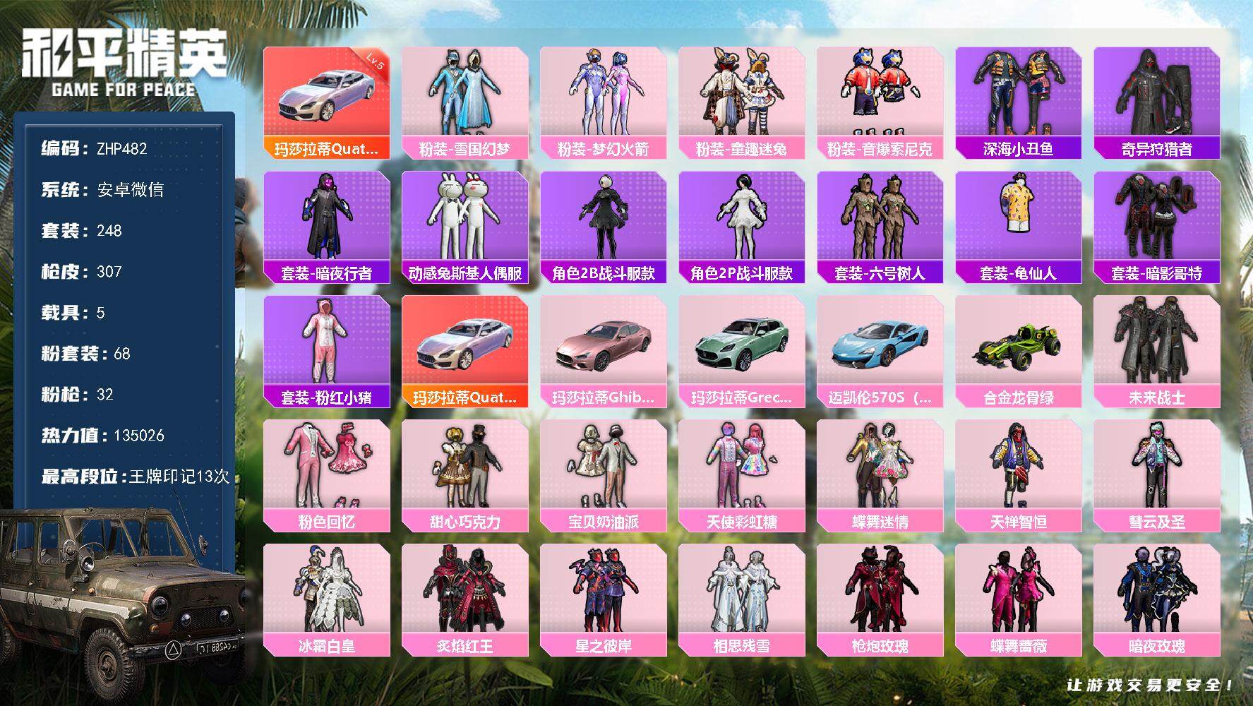 [13660916]5级玛莎幻星粉/雪国/哥特/奇异/童趣迷兔头盔/特价急出!详情看图!身法素材号!安卓 微信-68粉装-32特效枪-5载具-6粉色飞行器-135026热力值-13王牌印记-248套装-307枪皮
