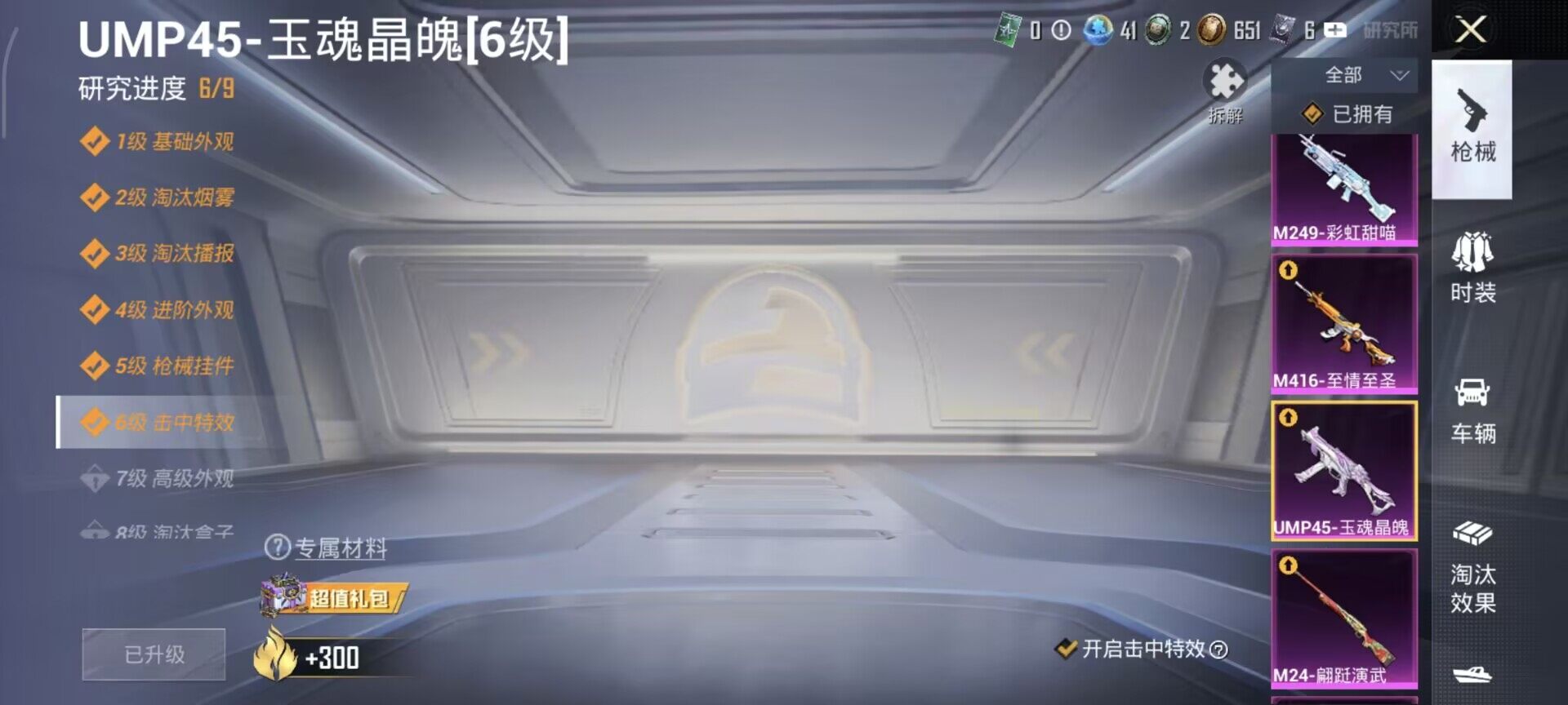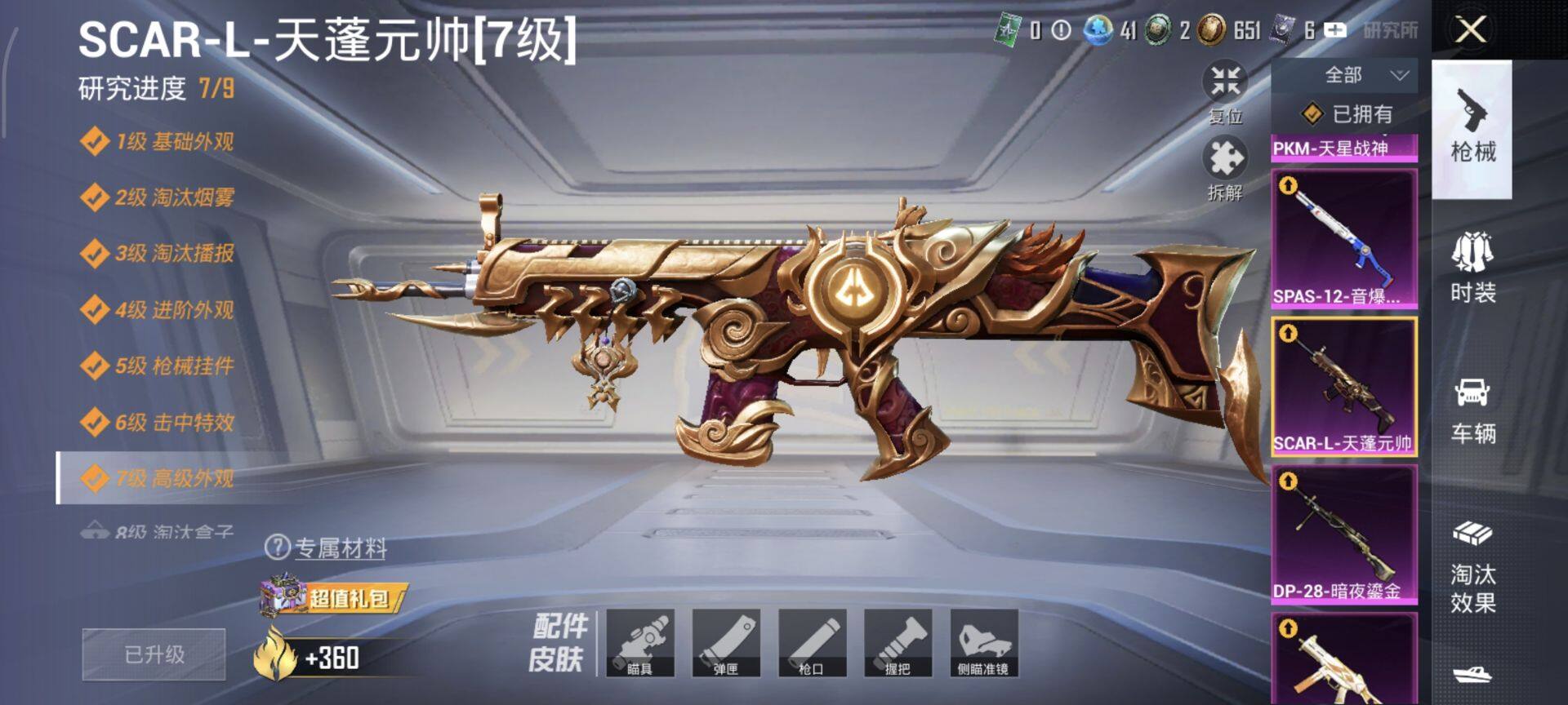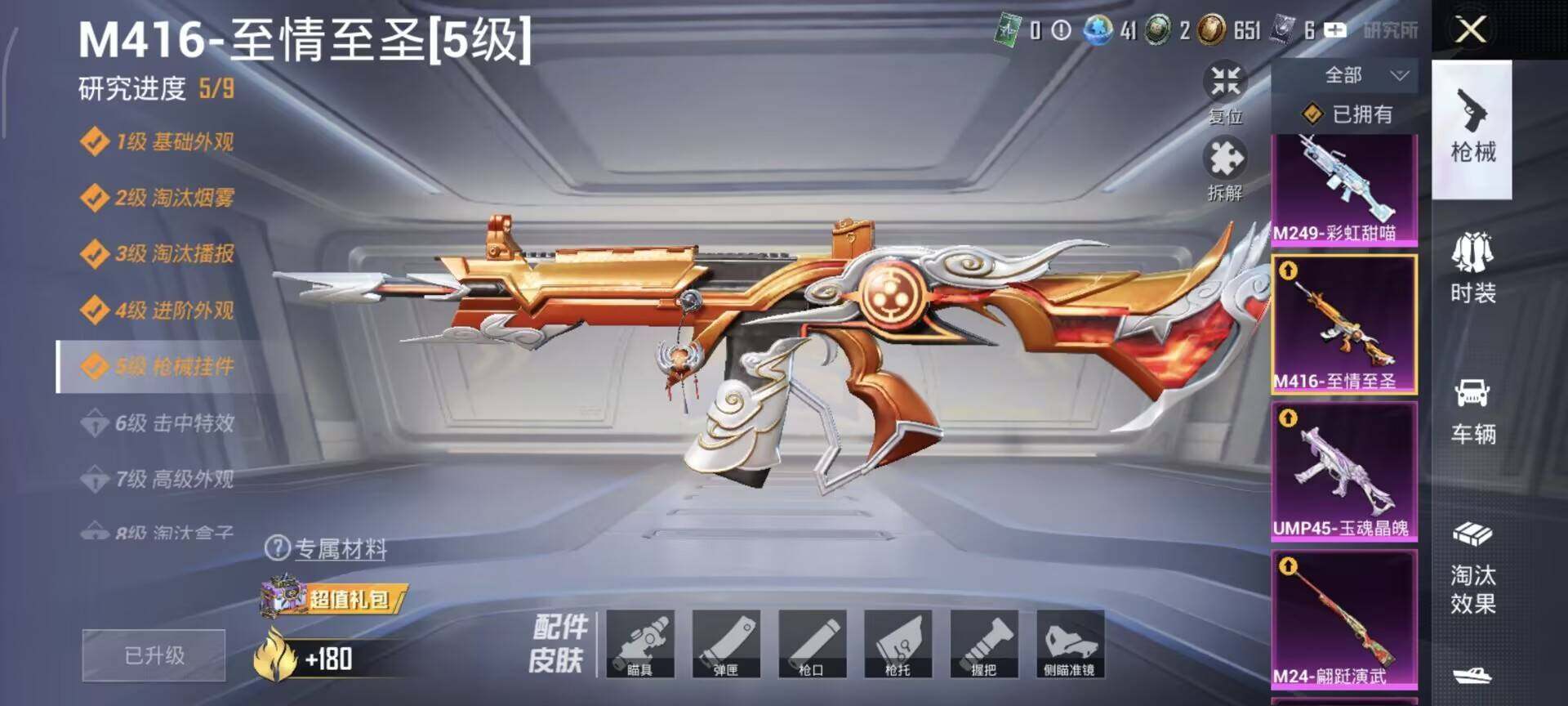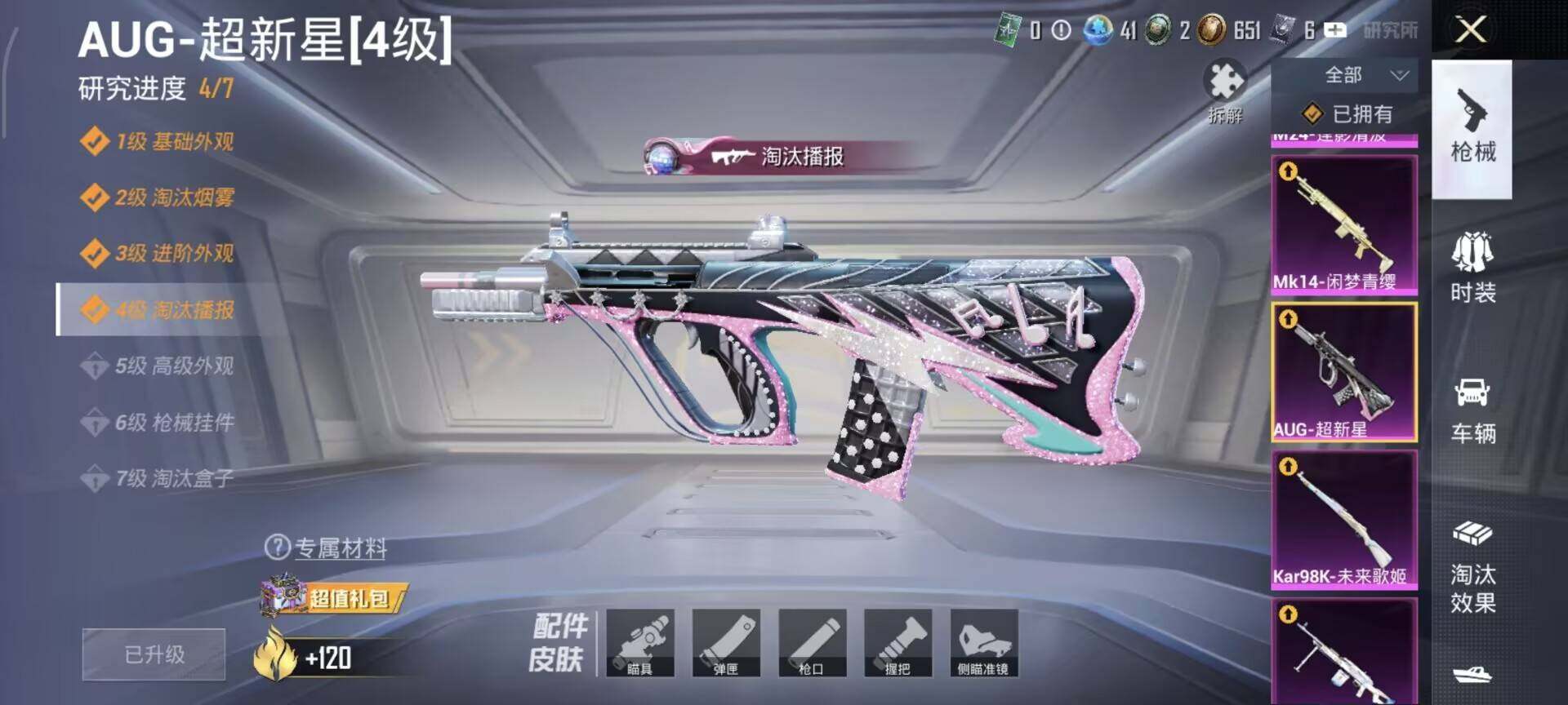 【粉色枪皮等级】:AKM-甜心宝贝(一级),AKM-梦之光华(一级),AKM-盖世英雄(三级),SCAR-L-梦幻火箭(一级),SCAR-L-天蓬元帅(七级),M416-暖熊萌萌(一级),M416-