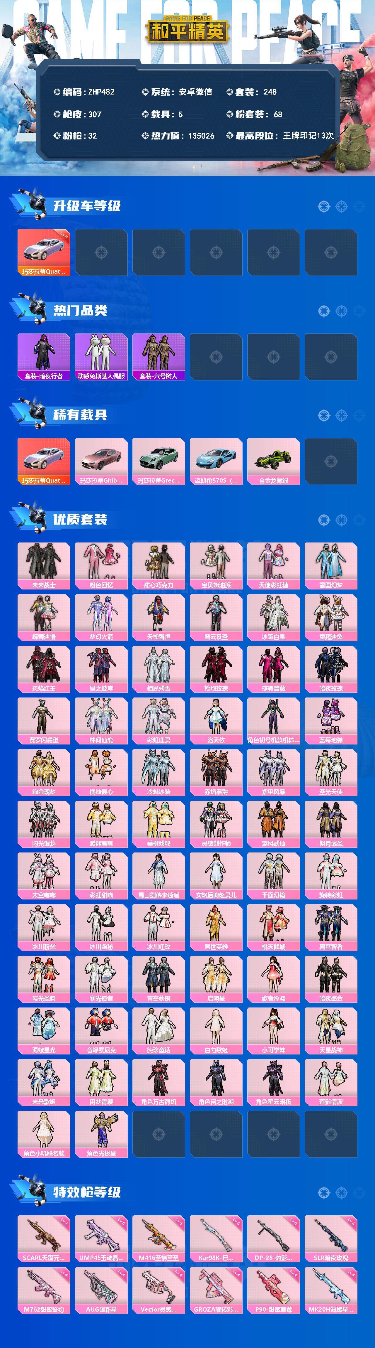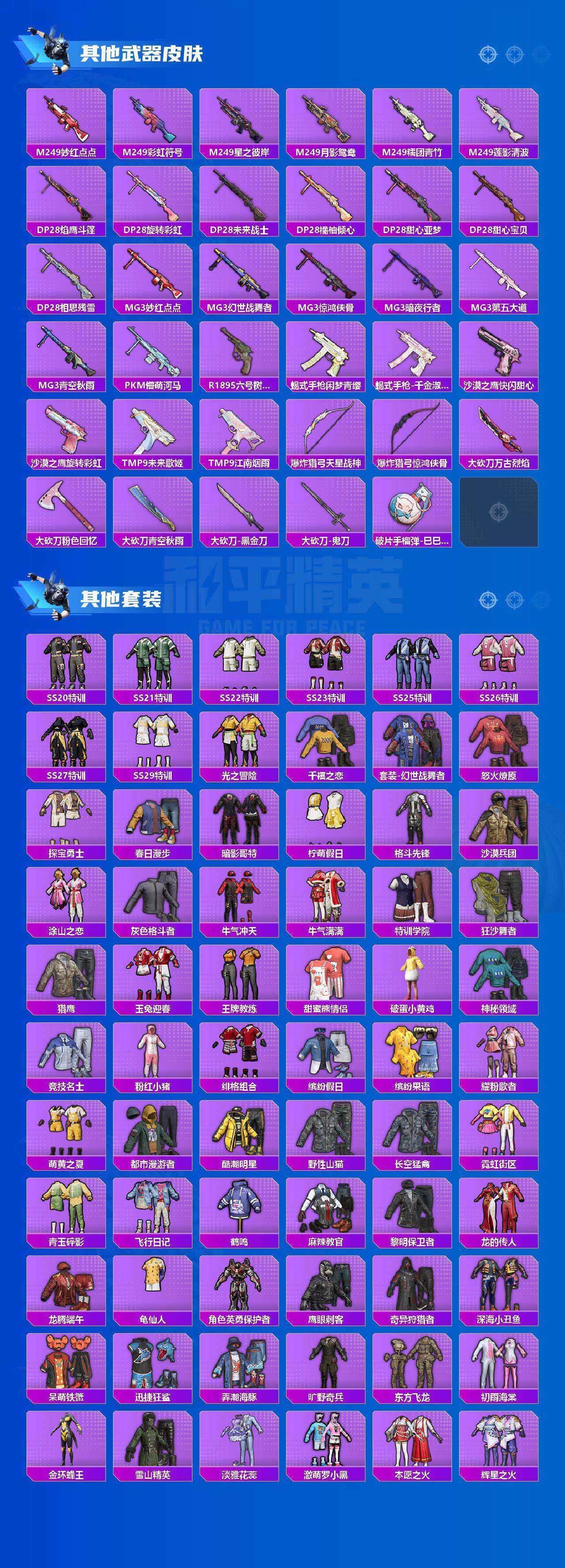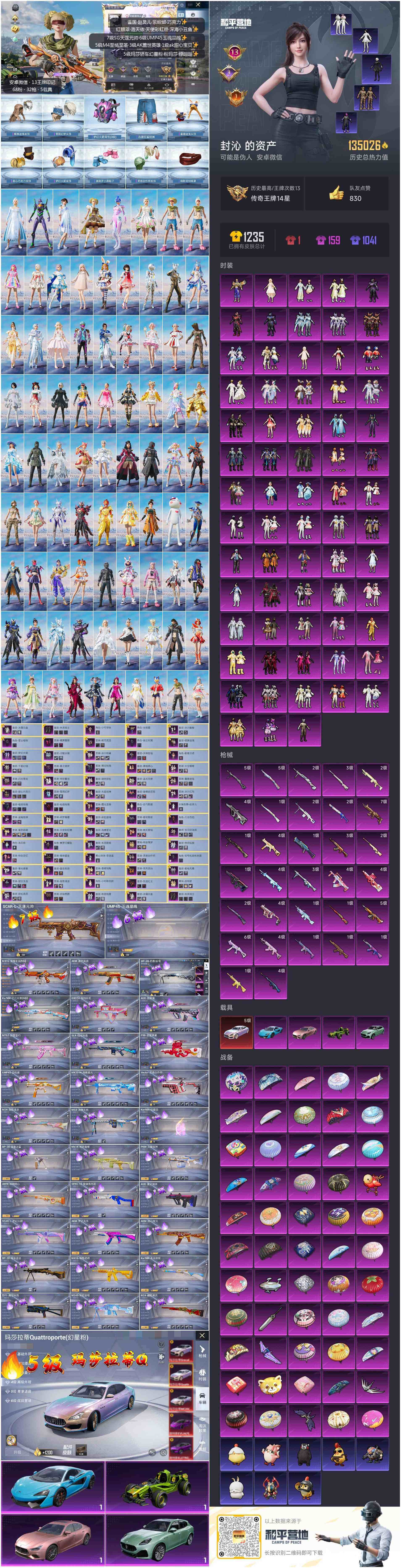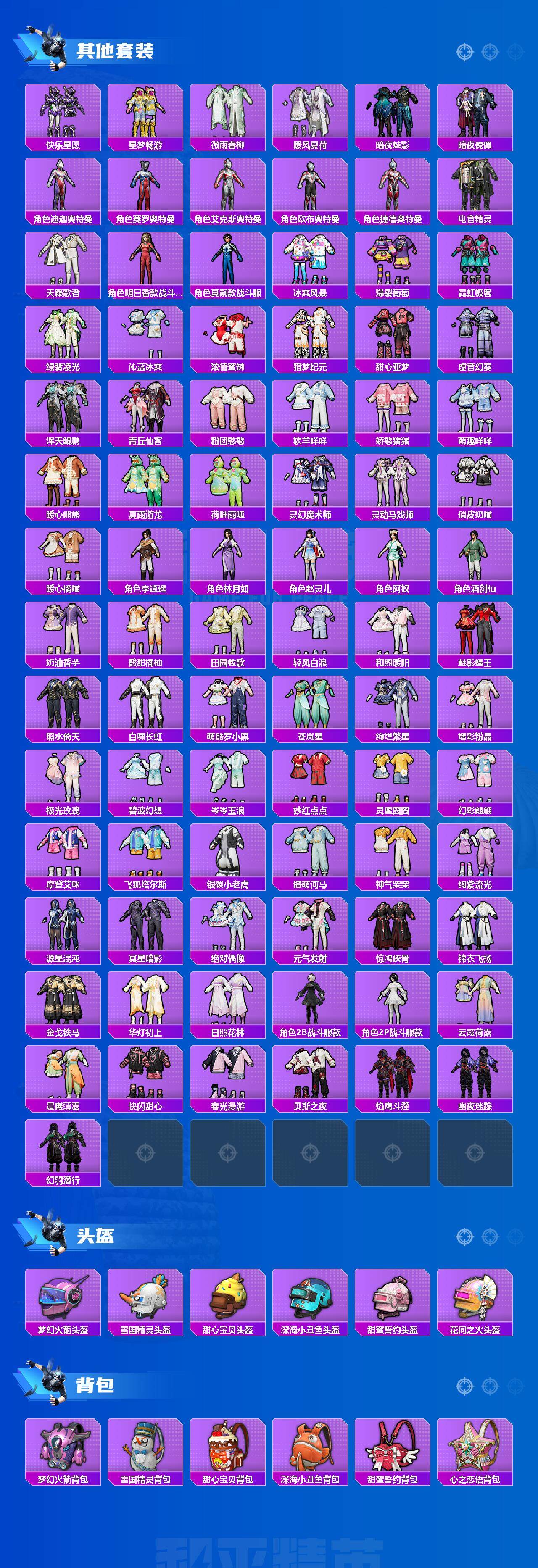 - [12084454]8粉装 4特效枪 3载具 14印记 可二次 可修改实名 连体王者 身法装备:都市猎人 优质装备:海龙奔腾,兰博基尼Estoque(银翼灰),兰博基尼Aventador SVJ(翡翠绿),都市猎人,梦幻火箭(新101)(新火箭少女101粉色套装),蝶舞迷情,宝贝奶油派,SCAR-L青春物语,七级SCAR-L-青春物语,千金淑猫,P90-冷漠罗丽,Kar98K-巳巳如意 时装数:524 枪械数:191 战备数:3 热门装扮:幻情紫藤,天之羽翼,复仇流浪者,暗夜玫瑰,潮萌小黄鸭,鹰眼刺客,都市猎人 载具:空客H135-蔚蓝之翼 稀有枪皮:DP-28-豹影疾电 六级特效枪:六级P90-冷漠罗丽 五级特效枪:五级Kar98K-巳巳如意,五级DP-28-豹影疾电 紫色装扮:田园牧歌,轻风白浪,SS22特训,莱茵河畔,白啸长虹,SS23特训,幻彩翩翩,妙红点点,娇憨猪猪,俏皮奶喵,萌趣咩咩,SS21特训,绚烂繁星,SS31特训套装,冰川特警,北国孤狼,SS30特训套装,云朵鹅,雪绒豹,SS33特训套装,青涩时光,顶瓜瓜,SS20特训,潮流游乐家,暗夜傀儡,冰爽风暴,飞驰魅影,音速流光,极速竞梦,SS19特训,军刀雅典娜,甜心亚梦,虚音幻奏,天籁歌者,瑞龙福将,团圆交子,SS17特训,焰山流火,异彩先驱,SS18特训,智慧隐士,都市魅力,长空猛禽,霓虹极客,霓虹街区,缤纷果语,蓝色运动,虎虎生威吉莉,街头潮人,跃动心情,骑行爱好者,魅力单车,麻辣教官,黄色名流,黄色运动,黎明保卫者,黑色伏地魔,冰河战士,龙魂突击队,蝶变,香桃花海,柠萌假日,海岛探路者,深蓝色名流,滨海假日,夏日音浪,幻世战舞者,探宝勇士,湖蓝色名流,滨海厨神,甜蜜菠萝,疯狂小兔子,白色伏地魔,破蛋小黄鸡,福星高照,空投萌叽,竞技勇士朋克,甜蜜熊情侣,牛气冲天,潮流炫酷,炫蓝之夏,热血青春,牛气满满,特战装甲,雏菊兔兔,萝兰蝴蝶,SS29特训,星途旅人,SS28特训,李逍遥,异域银装,鱼渊荷华,玉兔迎春,燕燕于飞,巳巳如意,海琴烟,青团波波,糖糖葫芦,竞技名士,街头风暴,银尘,SS25特训,粉红小猪,SS27特训,智谋强哥,SS6特训,SS7特训,SS8特训,大橘大利,SS9特训,SS10特训,SS11特训,蓝冰羽,紫幽梦,SS32特训服(SS32特训套装),风舞幻音,萌黄之夏,恋语绒绒,漫步者,金耀舞者,