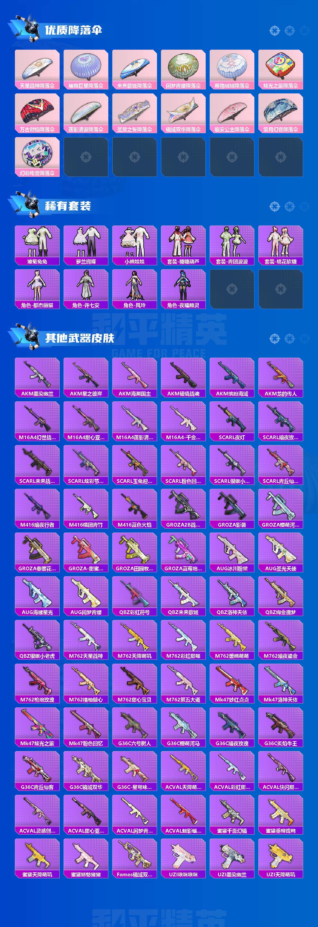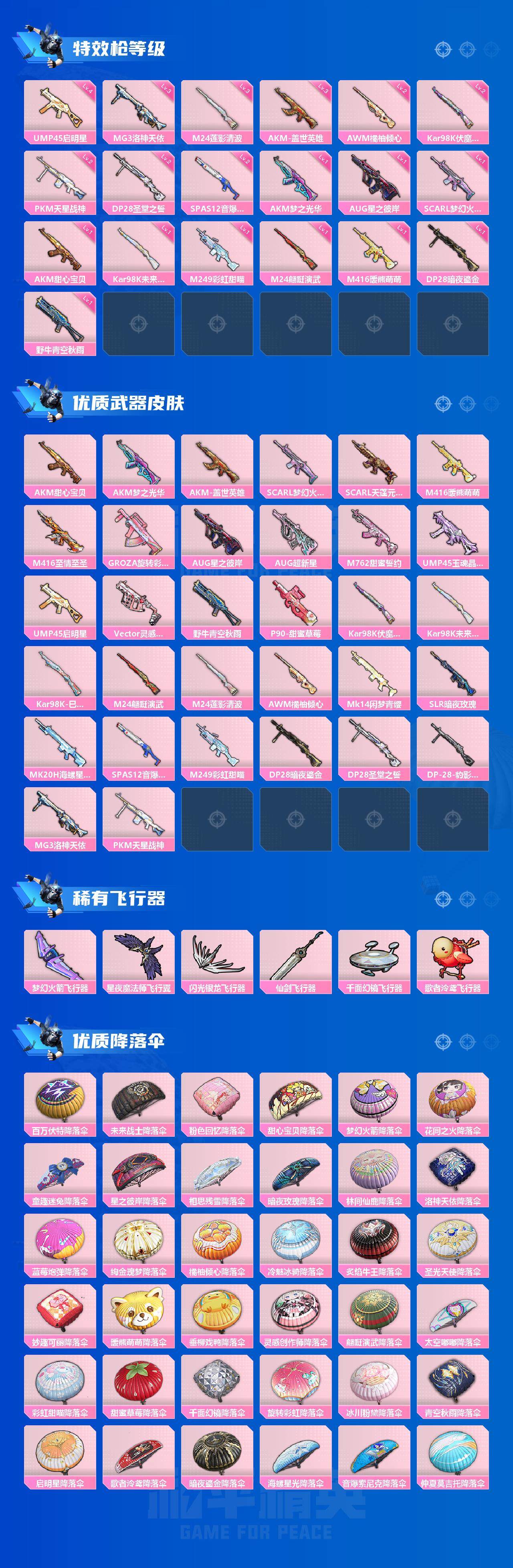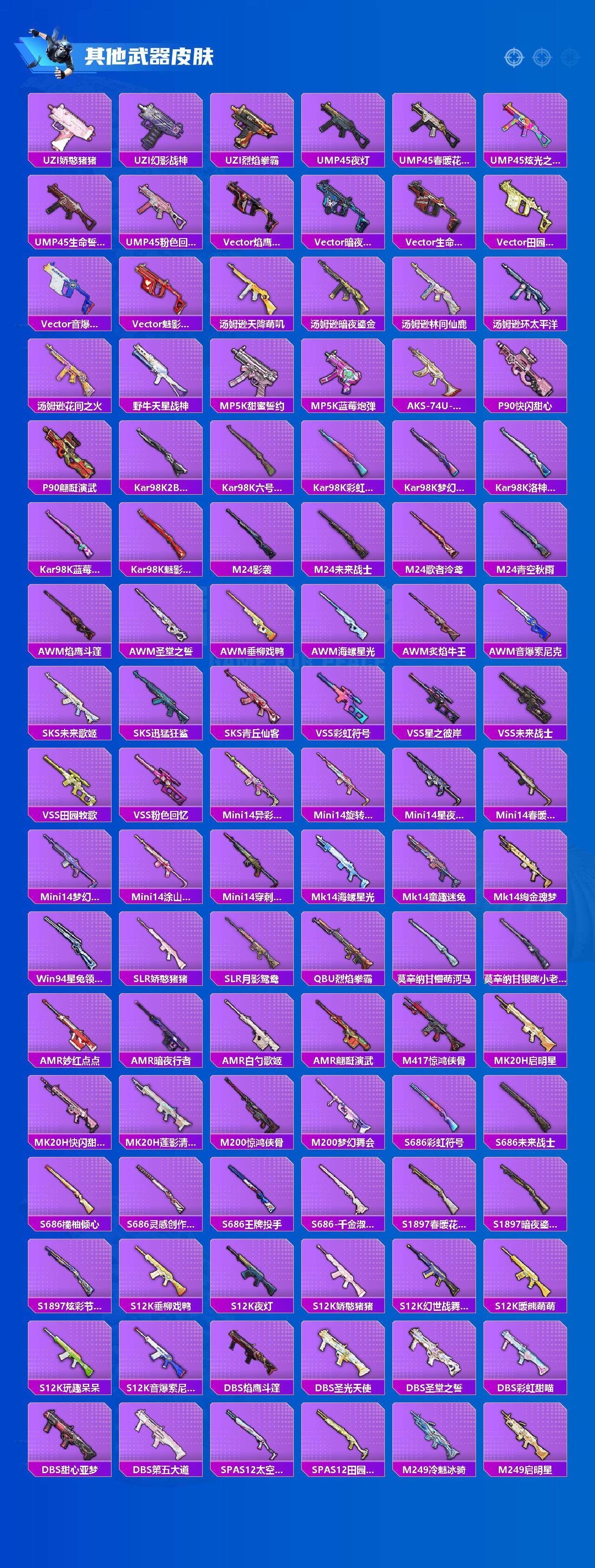 AKM-甜心宝贝,AKM-梦之光华,AKM-盖世英雄,SCAR-L-梦幻火箭,SCAR-L-天蓬元帅,M416-暖熊萌萌,M416-至情至圣,GROZA-旋转彩虹,AUG-星之彼岸,AUG-超新星,M762-甜蜜誓约,UMP45-玉魂晶魄,Vector-灵感创作师,野牛-青空秋雨,P90-甜蜜草莓,Kar98K-伏魔团,Kar98K-未来歌姬,Kar98K-巳巳如意,M24-翩跹演武,M24-莲影清波,AWM-橘柚倾心,Mk14-闲梦青缨,SLR-暗夜玫瑰,MK20-H-海螺星光,SPAS-12-音爆索尼克,M249-彩虹甜喵,DP-28-暗夜鎏金,DP-28-圣堂之誓,MG3-洛神天依,PKM-天星战神