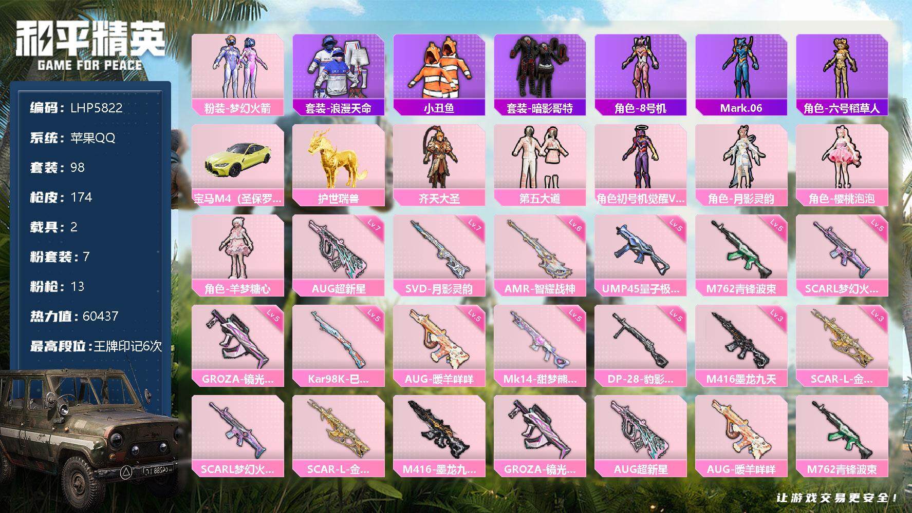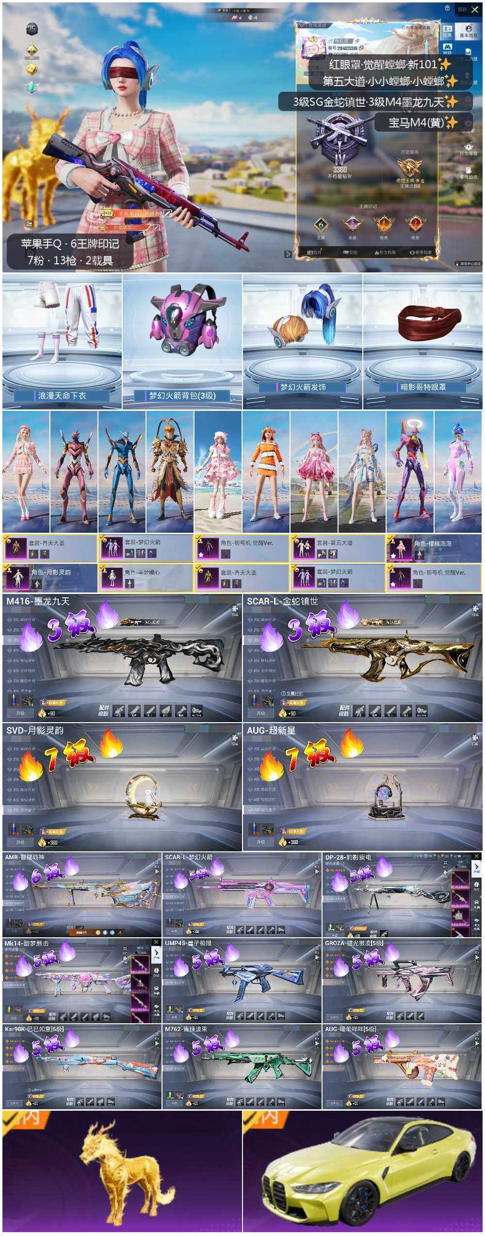 [13266687]素材身法号/绝世印记2/地铁满天赋 苹果 手Q-7粉装-13特效枪-2载具-11粉色飞行器-6w热力值-6王牌印记-98套装-174枪皮【热门品类】:粉装-梦幻火箭,套装-浪漫天命,套装-小丑鱼,套装-暗影哥特,角色-8号机,角色-Mark.06,角色-六号稻草人【粉色载具】:宝马M4(圣保罗黄),护世瑞兽【粉色套装】:粉装-梦幻火箭,粉装-齐天大圣,粉装-第五大道,角色-初号机 觉醒Ver.,角色-月影灵韵,角色-樱桃泡泡,角色-羊梦糖心【粉色枪皮等级】:SCAR-L-梦幻火箭(五级),SCAR-L-金蛇镇世(三级),M416-墨龙九天(三级),GROZA-镜光银凌(五级),AUG-超新星(七级),AUG-暖羊咩咩(五级),M762-青锋波束(五级),UMP45-量子极限(五级),Kar98K-巳巳如意(五级),Mk14-甜梦熊击(五级),AMR-智耀战神(六级),SVD-月影灵韵(七级),DP-28-豹影疾电(五级)【粉色飞行器】:酣梦熊熊飞行器,梦幻火箭飞行器,星之彼岸飞行器,齐天大圣飞行器,沙丘之主天马,龙翔九天飞行器,深渊漩涡飞行器,万象金身飞行器,雀灵庇佑飞行器,飞天猪飞行器