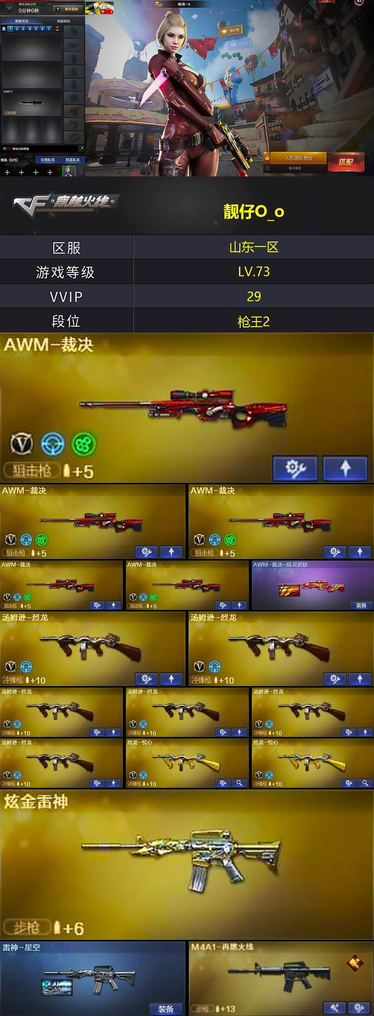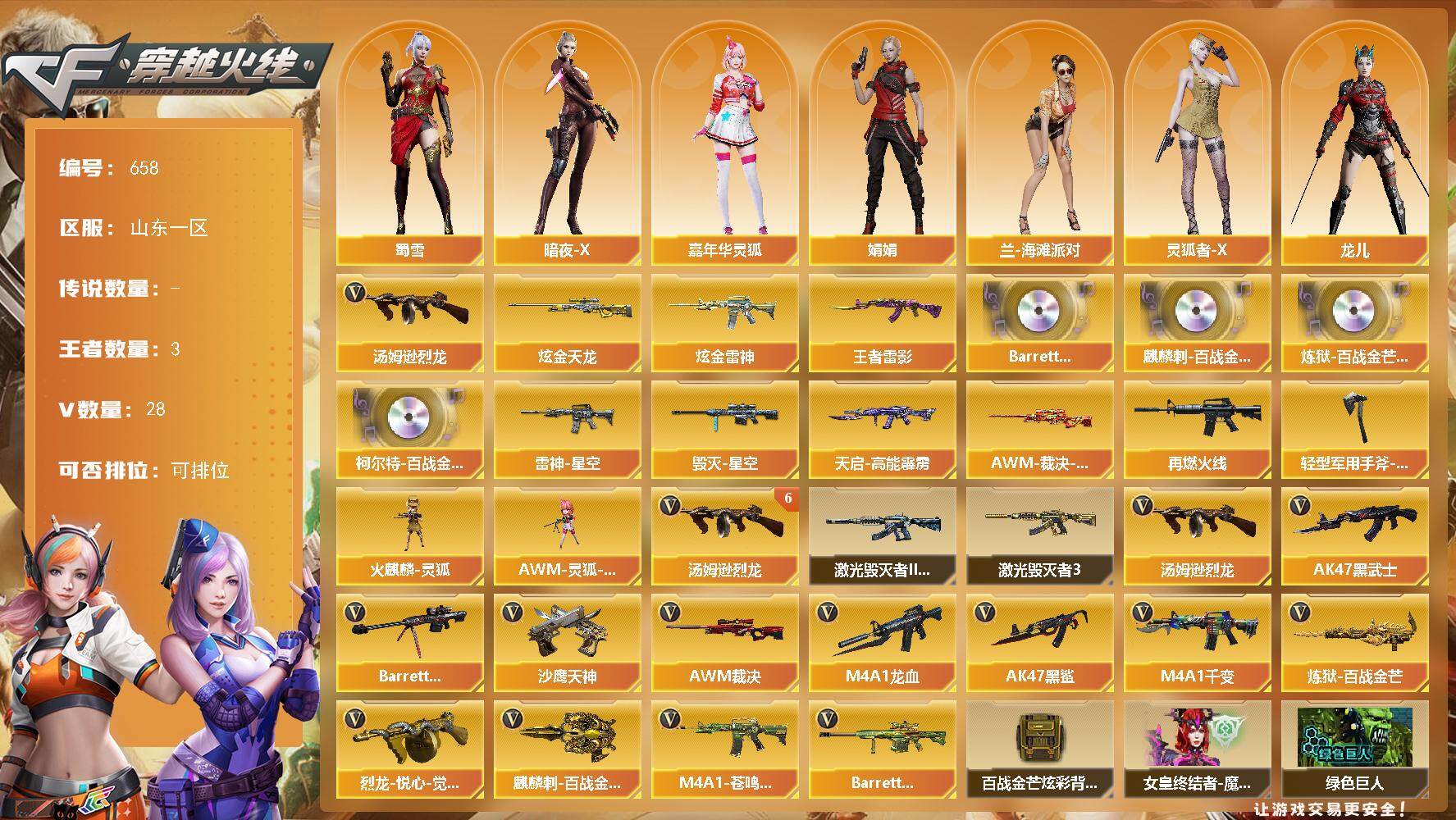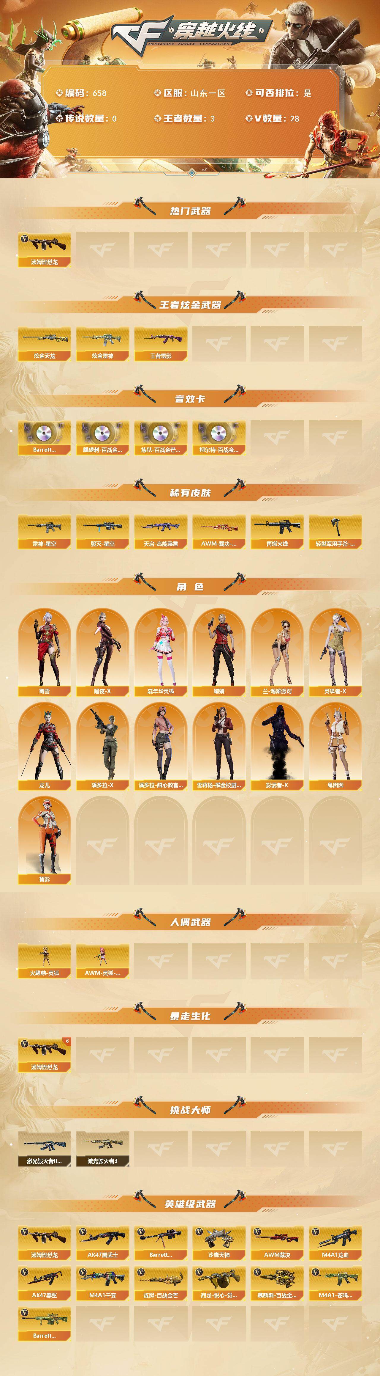 [13678146]山东一区-28V-3王者-2炫金 【热门武器】:汤姆逊-烈龙*6 【王者炫金武器】:王者雷影,炫金雷神,炫金天龙 【音效卡】:Barrett-碧霄极光音效卡*2,麒麟刺-百战金芒-盛典舞曲音效卡,炼狱-百战金芒-庆典舞曲音效卡,柯尔特-百战金芒-庆典舞曲音效卡 【皮肤】:AWM-裁决-凤灵皮肤,雷神-星空,M4A1-再燃火线,毁灭-星空,天启-高能霹雳 皮肤*2,轻型军用手斧-再燃火线 【角色】:暗夜-X,嘉年华灵狐,娟娟,兰-海滩派对,灵狐者-X,龙儿,潘多拉-X,潘多拉-甜心教官,蜀雪,兔囡囡,雪莉杨-摸金校尉,影武者-X,智影 【人偶武器】:火麒麟-灵狐,AWM-灵狐-15周年嘉年华 【挑战大师】:激光毁灭者III-白马银枪,激光毁灭者III 【英雄级武器】:M4A1-千变,AK47-黑武士*4,AK47-黑鲨*2,M4A1-龙血,Barrett-毁灭,AWM-裁决*5,炼狱-百战金芒,汤姆逊-烈龙*6,烈龙-悦心-觉醒版*2,沙鹰-天神,麒麟刺-百战金芒,M4A1-苍鸣雷神,Barrett-碧霄极光 【道具】:百战金芒炫彩背包,女皇终结者-魔龙之吻,绿色巨人,灵魂忍者,迷雾幽灵,夺命之镰,防化服*3,流光-鎏金之域,枪王排位29赛季金色流光,语音特效-盛典烟火,萌萌小葵表情,防弹头盔*3,防弹衣*3,C4工具钳*4,手雷包*3 【特殊枪械】:6烈龙