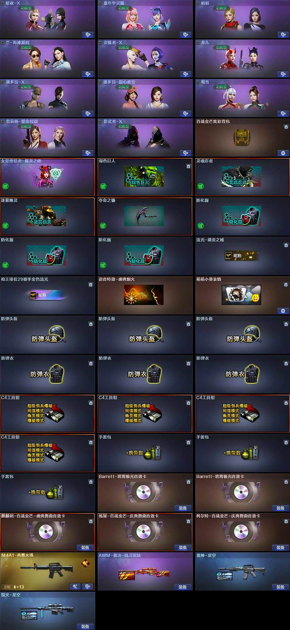 【道具】:百战金芒炫彩背包,女皇终结者-魔龙之吻,绿色巨人,灵魂忍者,迷雾幽灵,夺命之镰,防化服*3,流光-鎏金之域,枪王排位29赛季金色流光,语音特效-盛典烟火,萌萌小葵表情,防弹头盔*3,防弹衣*3,C4工具钳*4,手雷包*3