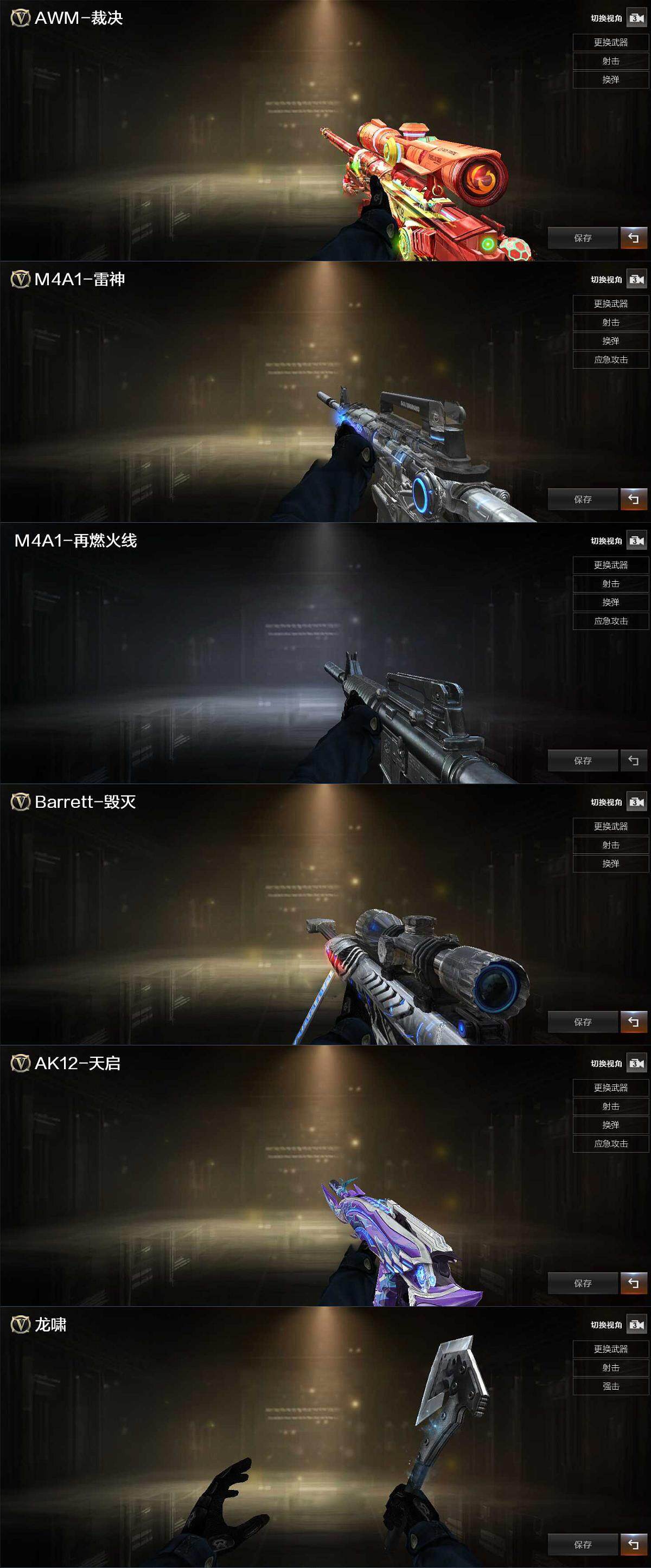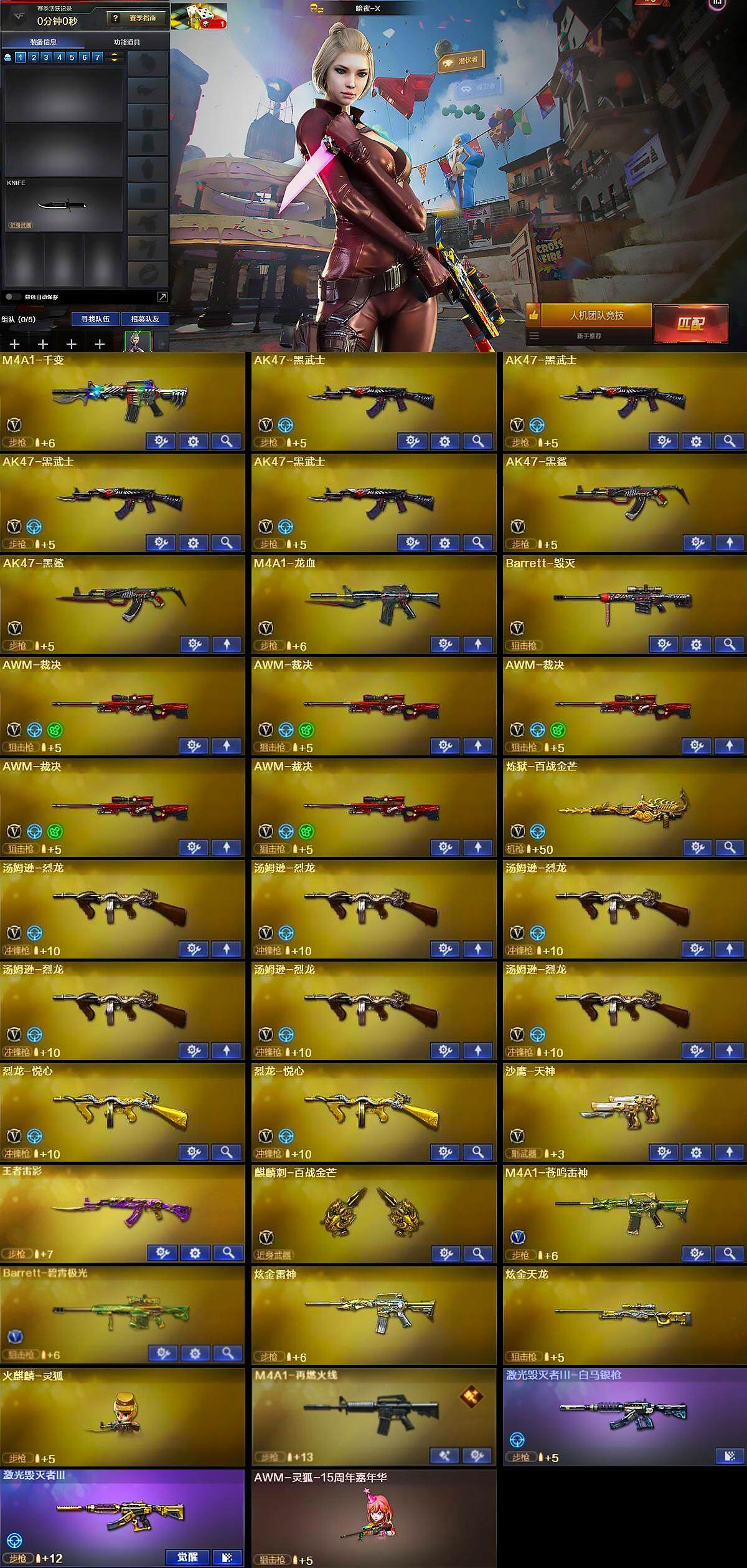 【英雄级武器】:M4A1-千变,AK47-黑武士*4,AK47-黑鲨*2,M4A1-龙血,Barrett-毁灭,AWM-裁决*5,炼狱-百战金芒,汤姆逊-烈龙*6,烈龙-悦心-觉醒版*2,沙鹰-天神,麒麟刺-百战金芒,M4A1-苍鸣雷神,Barrett-碧霄极光