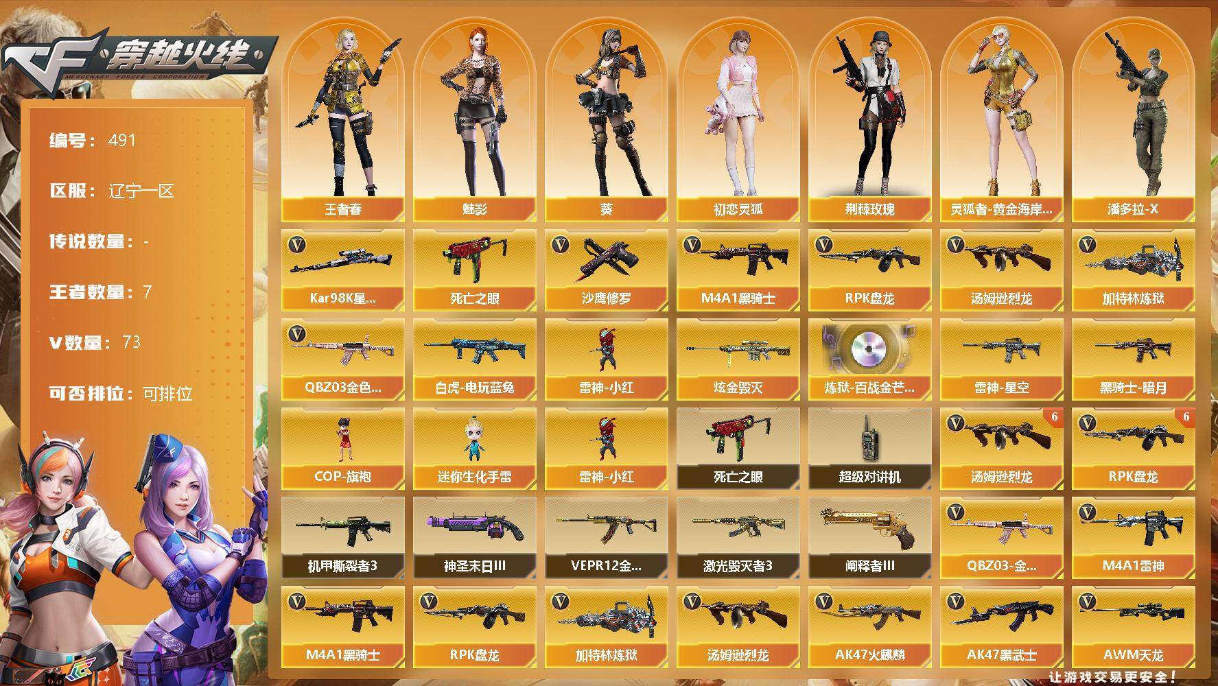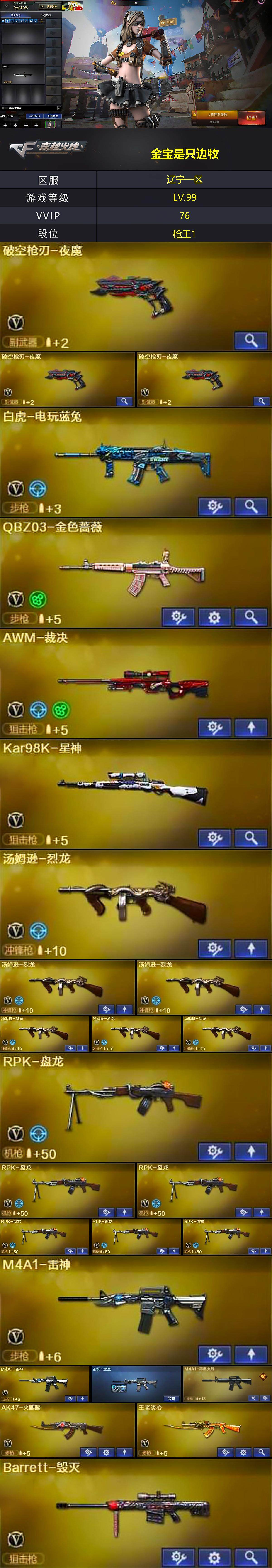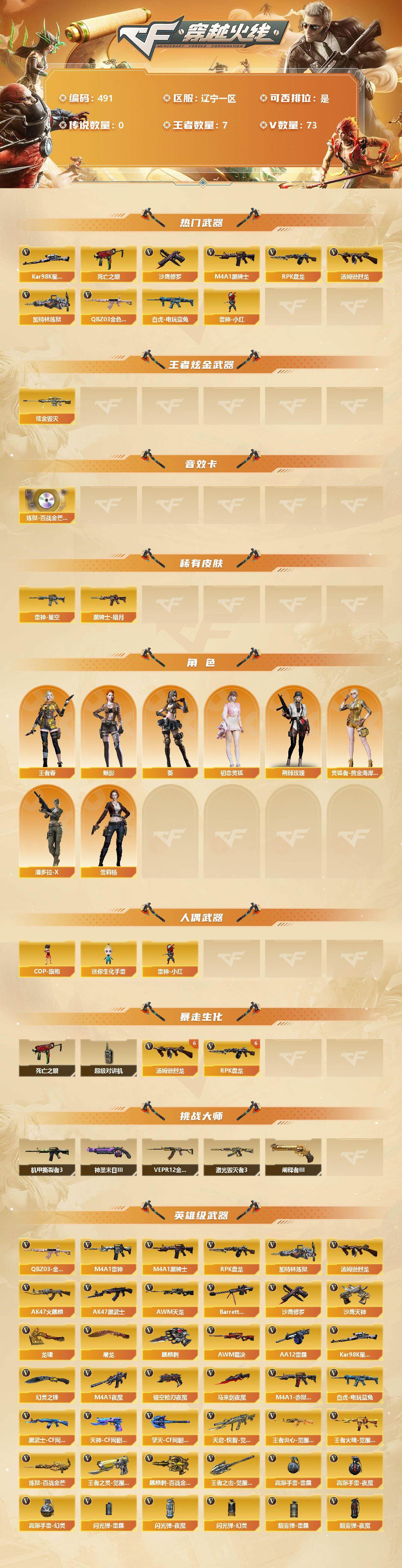 [13271867]辽宁一区-73V-7王者-2炫金 【热门武器】:QBZ03-金色蔷薇,死亡之眼*2,白虎-电玩蓝兔,Kar98K-星神,M4A1-黑骑士,汤姆逊-烈龙*6,RPK-盘龙*6,加特林-炼狱,雷神-小红,沙鹰-修罗 【王者炫金武器】:炫金毁灭*2 【音效卡】:炼狱-百战金芒-庆典舞曲音效卡 【皮肤】:雷神-星空,M4A1-再燃火线,黑骑士-暗月,死神-秘银*2,AK47-B-常胜将军-刘备,修罗-能量核心,轻型军用手斧-再燃火线 【角色】:葵,魅影,王者春,初恋灵狐,荆棘玫瑰,灵狐者-黄金海岸,潘多拉-X,雪莉杨 【人偶武器】:雷神-小红,COP-旗袍,迷你生化手雷 【暴走生化】:死亡之眼*2,超级对讲机 【挑战大师】:VEPR-12-金魔,激光毁灭者III,机甲撕裂者III,神圣爆裂者-末日III*2,阐释者III 【英雄级武器】:AK47-火麒麟,M4A1-雷神*2,M4A1-黑骑士,AK47-黑武士,M4A1-夜魔,QBZ03-金色蔷薇,天启-悦智-觉醒版,王者炎心-觉醒版,王者火魄-觉醒版,白虎-电玩蓝兔,黑武士-CF网剧冠军,AWM-天龙,Barrett-毁灭,AWM-裁决,Kar98K-星神,RPK-盘龙*6,加特林-炼狱,炼狱-百战金芒,汤姆逊-烈龙*6,AA-12-雷霆,沙鹰-修罗,沙鹰-天神,破空枪刃-夜魔*3,天神-CF网剧冠军,王者之灵-觉醒版,屠龙*2,龙啸,马来剑-夜魔,麒麟刺,幻灵之锋,擎天-CF网剧冠军,麒麟刺-百战金芒,王者之击-觉醒版,高爆手雷-雷霆,高爆手雷-夜魔*5,高爆手雷-幻灵*2,闪光弹-雷霆,闪光弹-夜魔*5,闪光弹-幻灵*2,烟雾弹-雷霆,烟雾弹-夜魔*5,烟雾弹-幻灵*2,M4A1-赤狱骑士 【特殊枪械】:1黑骑士,6烈龙,6盘龙,1炼狱