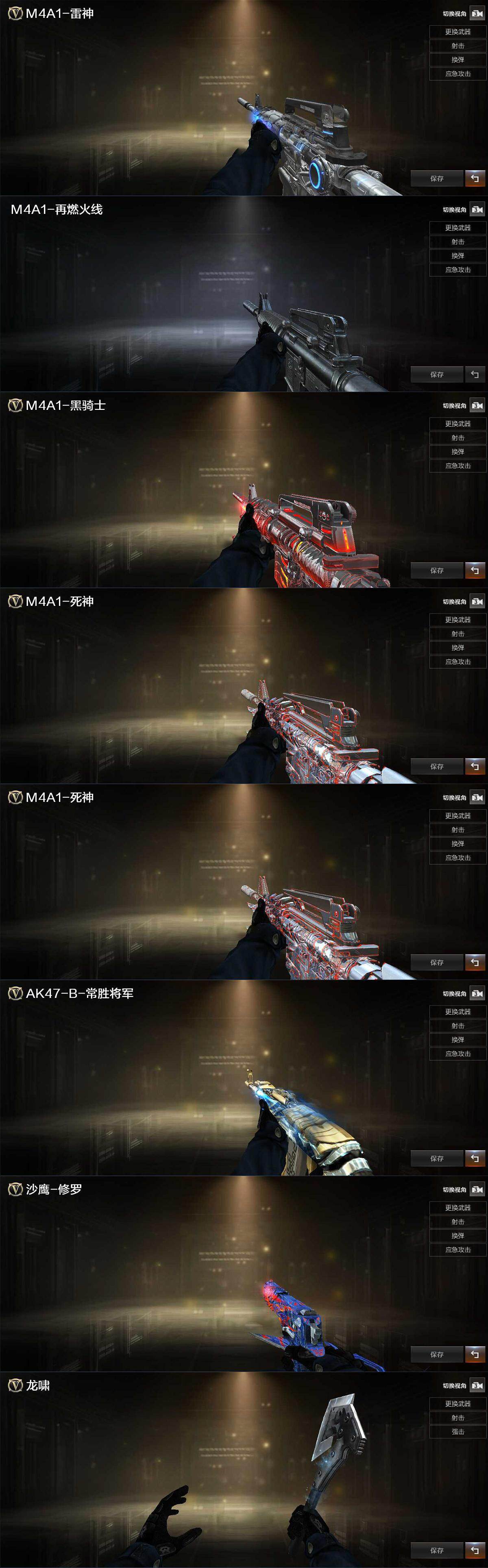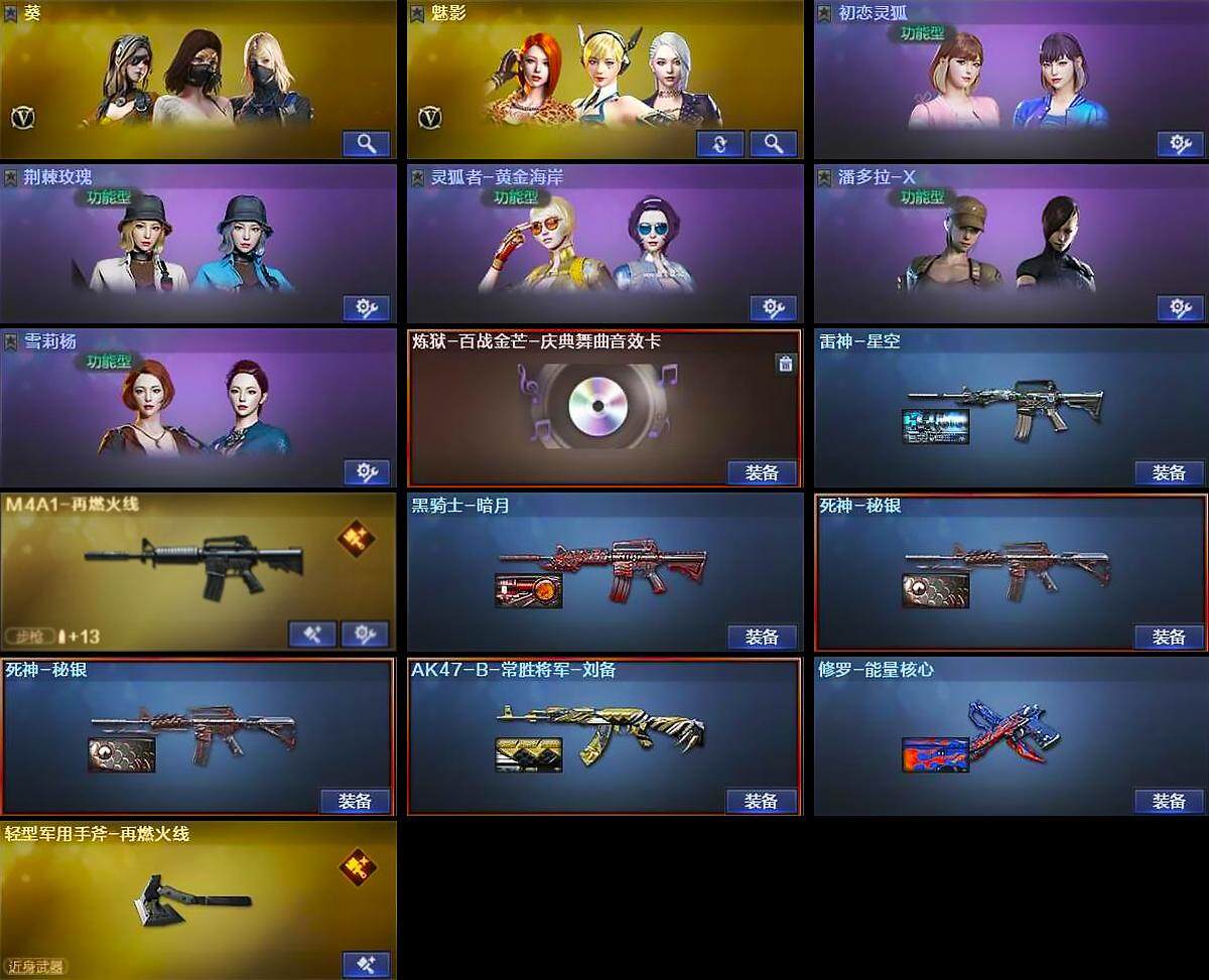 【皮肤】:雷神-星空,M4A1-再燃火线,黑骑士-暗月,死神-秘银*2,AK47-B-常胜将军-刘备,修罗-能量核心,轻型军用手斧-再燃火线