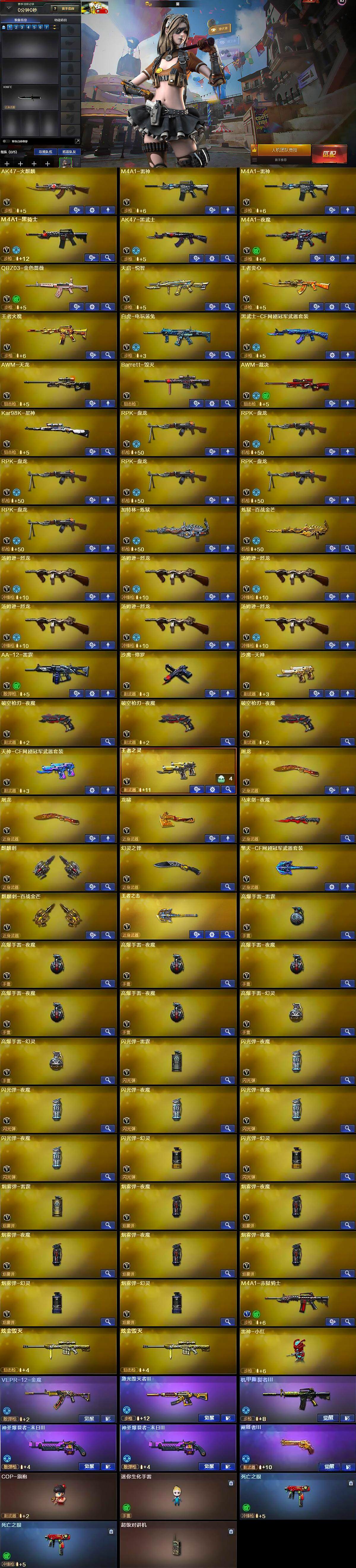 【英雄级武器】:AK47-火麒麟,M4A1-雷神*2,M4A1-黑骑士,AK47-黑武士,M4A1-夜魔,QBZ03-金色蔷薇,天启-悦智-觉醒版,王者炎心-觉醒版,王者火魄-觉醒版,白虎-电玩蓝兔,黑武士-CF网剧冠军,AWM-天龙,Barrett-毁灭,AWM-裁决,Kar98K-星神,RPK-盘龙*6,加特林-炼狱,炼狱-百战金芒,汤姆逊-烈龙*6,AA-12-雷霆,沙鹰-修罗,沙鹰-天神,破空枪刃-夜魔*3,天神-CF网剧冠军,王者之灵-觉醒版,屠龙*2,龙啸,马来剑-夜魔,麒麟刺,幻灵之锋,擎天-CF网剧冠军,麒麟刺-百战金芒,王者之击-觉醒版,高爆手雷-雷霆,高爆手雷-夜魔*5,高爆手雷-幻灵*2,闪光弹-雷霆,闪光弹-夜魔*5,闪光弹-幻灵*2,烟雾弹-雷霆,烟雾弹-夜魔*5,烟雾弹-幻灵*2,M4A1-赤狱骑士