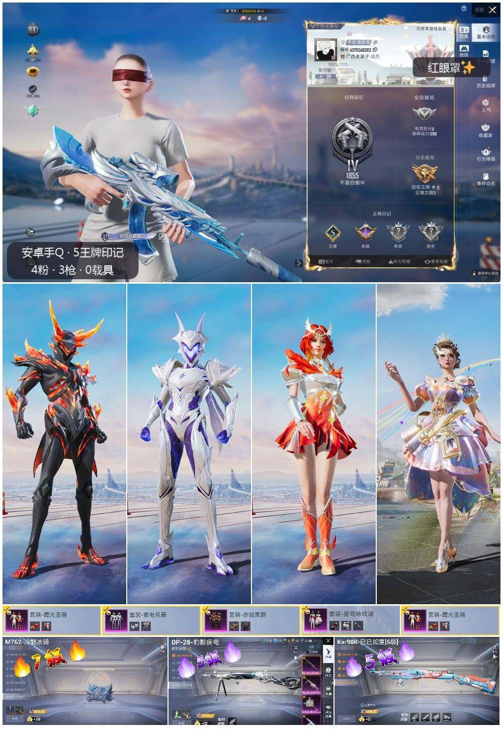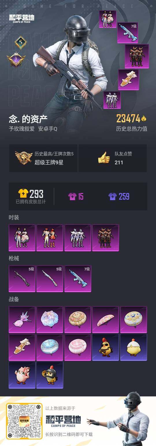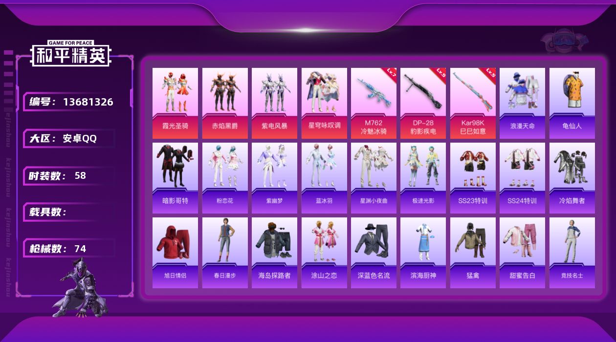 - PX_2062180- 苹果手Q-9王牌印记-4粉装-4特效枪-2载具-42527热力值-87套装-136枪皮-2卓越印记-1传奇印记 【4粉装】,繁龙极客,洛天依,狂花道·不知火舞,星梦奇缘 【4特效枪】AKM-魔法神域-3级 M416-墨龙九天-3级 M416-电玩时刻-5级 Kar98K-巳巳如意-1级 【3稀有紫装】,8号机,暗影哥特,龟仙人, 【2稀有载具】,时空跃影(星辉银),星梦玉