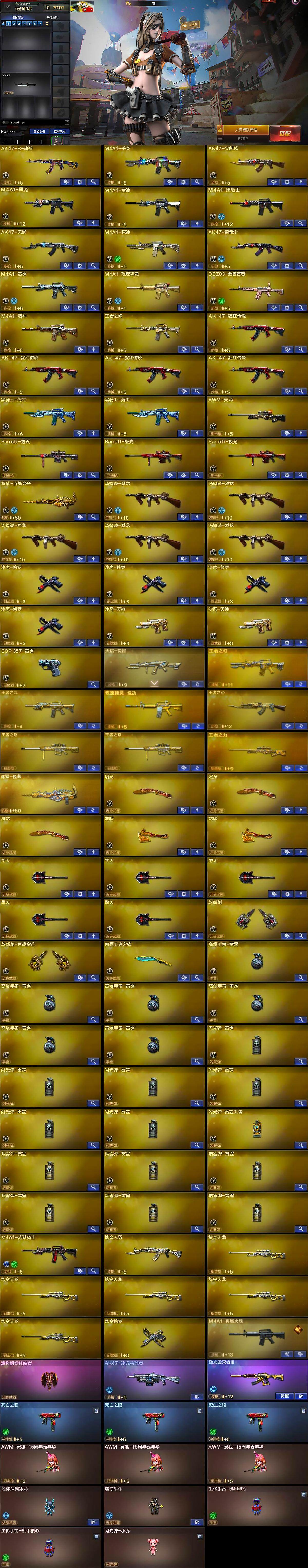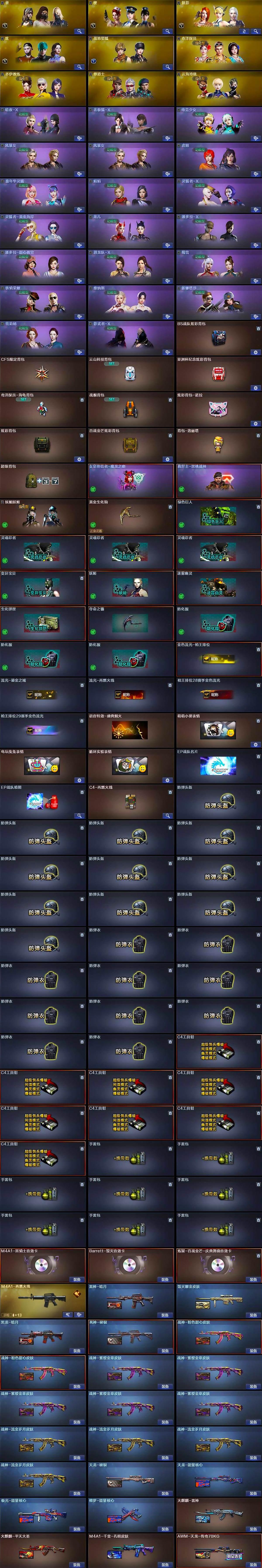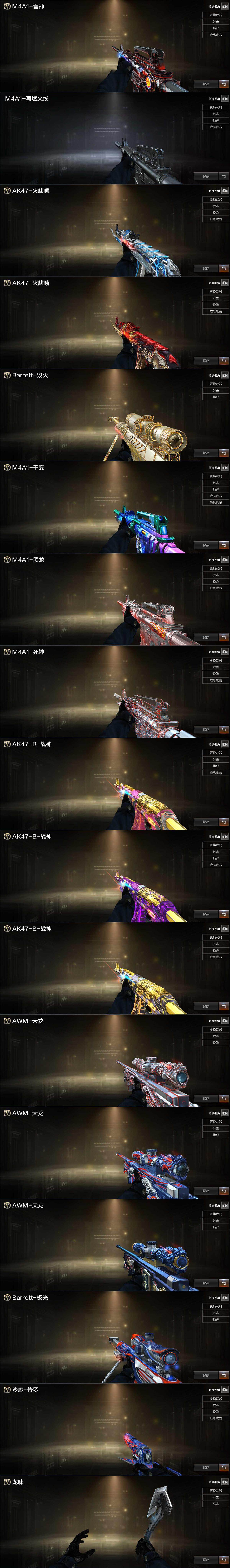 【英雄级武器】:M4A1-千变,AK47-火麒麟,M4A1-黑龙,M4A1-雷神,M4A1-黑骑士,AK47-无影,M4A1-死神,AK47-黑武士,M4A1-雷霆,M4A1-玫瑰精灵,QBZ03-金色蔷薇,M4A1-猎神,王者之魄-觉醒版,AK-47-猩红传说*4,AK47-B-战神,黑骑士-海王*2,AWM-天龙,Barrett-毁灭,Barrett-极光*2,炼狱-百战金芒,汤姆逊-烈龙*5,沙鹰-修罗*4,沙鹰-天神*2,雷霆之契,屠龙*3,龙啸*2,擎天*5,麒麟刺,麒麟刺-百战金芒,雷霆王者之锋-觉醒版,高爆手雷-雷霆*6,闪光弹-雷霆*6,闪光弹-雷霆王者-觉醒版,烟雾弹-雷霆*6,M4A1-赤狱骑士
