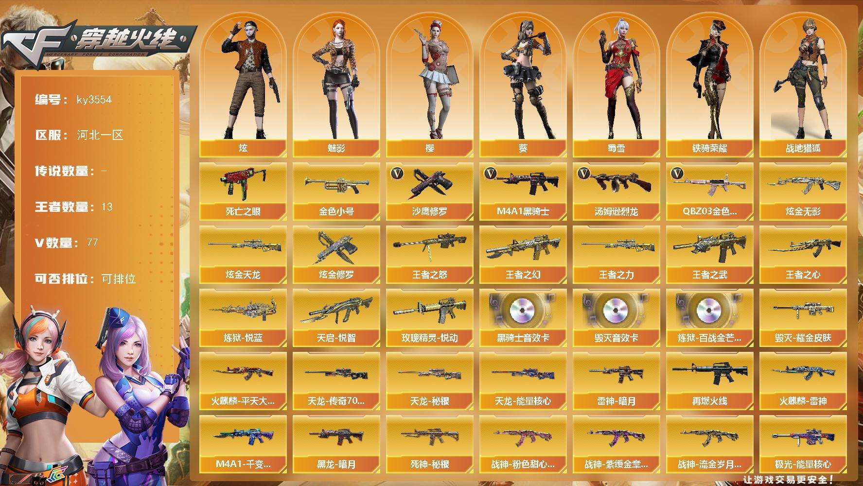 [13753914]河北一区-77V-13王者-7炫金 【热门武器】:QBZ03-金色蔷薇,死亡之眼*3,金色小号,M4A1-黑骑士,汤姆逊-烈龙*5,沙鹰-修罗*4 【王者炫金武器】:天启-悦智,王者之幻,王者之武,玫瑰精灵-悦动,王者之心,王者之怒*2,王者之力,炼狱-悦蓝,炫金无影,炫金天龙*5,炫金修罗 【音效卡】:M4A1-黑骑士音效卡,Barrett-毁灭音效卡,炼狱-百战金芒-庆典舞曲音效卡 【皮肤】:雷神-暗月,M4A1-再燃火线,火麒麟-雷神,火麒麟-平天大圣,毁灭耀金皮肤,M4A1-千变-孔明皮肤,黑龙-暗月,死神-秘银,战神-粉色甜心皮肤*2,战神-紫绶金章皮肤*5,战神-流金岁月皮肤*4,天龙-秘银,天龙-能量核心,AWM-天龙-传奇70KG,极光-能量核心,修罗-能量核心,轻型军用手斧-再燃火线 【角色】:葵,樱,魅影,炫,战地猎狐,奇洋探员,乔伊教练,修道士,云海玲珑,暗夜-X,北极狐-X,电竞少女,风暴女*2,虎妞,嘉年华灵狐,疾风,娟娟,0号玩家,灵狐者-X,灵狐者-黄金海岸,龙儿,潘多拉-X,潘多拉-甜心教官,潜龙队-X,邱刚敖,蜀雪,铁骑荣耀,维纳斯,新娜塔莎,雪莉杨,影武者-X 【人偶武器】:迷你钢铁终结者,AWM-灵狐-15周年嘉年华*3,迷你深渊冰龙,迷你牛牛,生化手雷-机甲核心*2,闪光弹-小乔 【暴走生化】:死亡之眼*3 【挑战大师】:AK47-冰龙粉碎者,激光毁灭者III 【英雄级武器】:M4A1-千变,AK47-火麒麟,M4A1-黑龙,M4A1-雷神,M4A1-黑骑士,AK47-无影,M4A1-死神,AK47-黑武士,M4A1-雷霆,M4A1-玫瑰精灵,QBZ03-金色蔷薇,M4A1-猎神,王者之魄-觉醒版,AK-47-猩红传说*4,AK47-B-战神,黑骑士-海王*2,AWM-天龙,Barrett-毁灭,Barrett-极光*2,炼狱-百战金芒,汤姆逊-烈龙*5,沙鹰-修罗*4,沙鹰-天神*2,雷霆之契,屠龙*3,龙啸*2,擎天*5,麒麟刺,麒麟刺-百战金芒,雷霆王者之锋-觉醒版,高爆手雷-雷霆*6,闪光弹-雷霆*6,闪光弹-雷霆王者-觉醒版,烟雾弹-雷霆*6,M4A1-赤狱骑士 【道具】:BS战队炫彩背包,CFS限定背包,云山科技背包,亚洲杯纪念炫彩背包,奇洋探员-海龟背包,战舰背包,炫彩背包-诺拉,炫彩背包,百战金芒炫彩背包,背