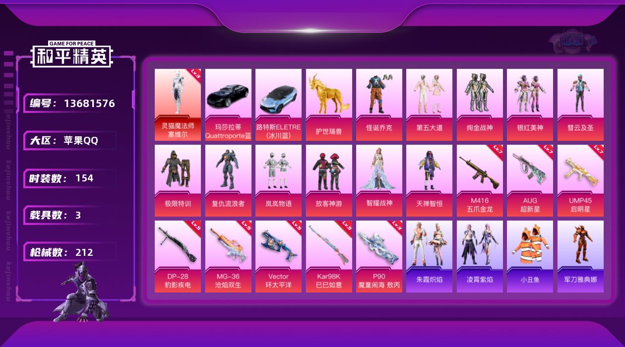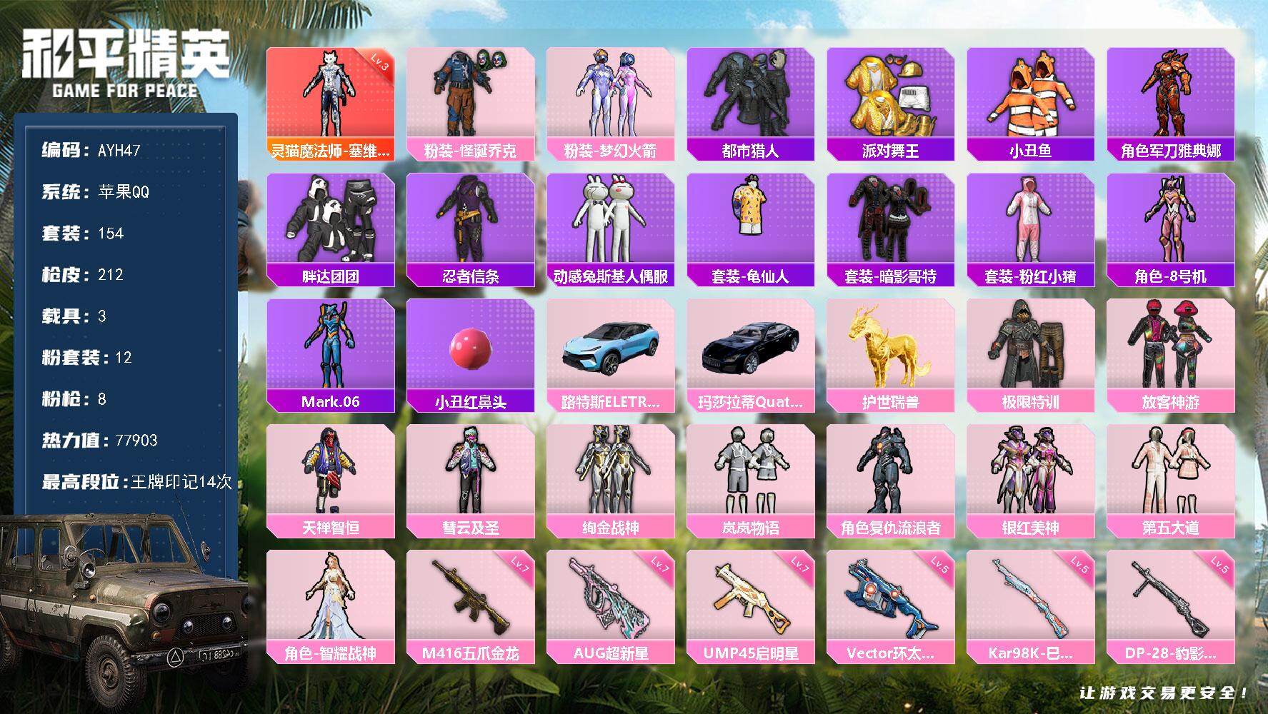 [13681576]可二次【店主推荐捡漏号!可直接换绑】苹果 手Q-1神装-12粉装-8特效枪-3载具-7粉色飞行器-77903热力值-14王牌印记-154套装-212枪皮【红色神装等级】:灵猫魔法师-塞维尔(三级)【红色角色神装】:灵猫魔法师-塞维尔【热门品类】:粉装-怪诞乔克,粉装-梦幻火箭,套装-都市猎人,套装-派对舞王,套装-小丑鱼,角色-军刀雅典娜,套装-胖达团团,套装-忍者信条,套装-动感兔斯基人偶服,套装-龟仙人,套装-暗影哥特,套装-粉红小猪,角色-8号机,角色-Mark.06,小丑红鼻头【粉色载具】:路特斯ELETRE(冰川蓝),玛莎拉蒂Quattroporte(夜幕蓝),护世瑞兽【粉色套装】:粉装-极限特训,粉装-怪诞乔克,粉装-梦幻火箭,粉装-放客神游,粉装-天禅智恒,粉装-彗云及圣,粉装-绚金战神,粉装-岚岚物语,角色-复仇流浪者,粉装-银红美神,粉装-第五大道,角色-智耀战神【粉色枪皮等级】:M416-五爪金龙(七级),AUG-超新星(七级),UMP45-启明星(七级),Vector-环太平洋(五级),P90-魔童闹海 敖丙(三级),Kar98K-巳巳如意(五级),DP-28-豹影疾电(五级),MG-36-沧焰双生(五级)【粉色枪皮】:M416-五爪金龙,AUG-超新星,UMP45-启明星,Vector-环太平洋,P90-魔童闹海 敖丙,Kar98K-巳巳如意,DP-28-豹影疾电,MG-36-沧焰双【粉色飞行器】:伏魔团飞行器,沙丘之主天马,凤舞九天飞行器,万象金身飞行器,终晖之翼飞行器,灵珠游龙飞行器