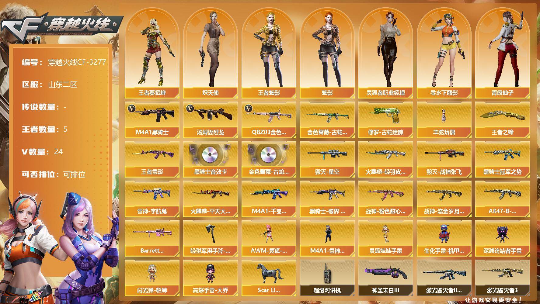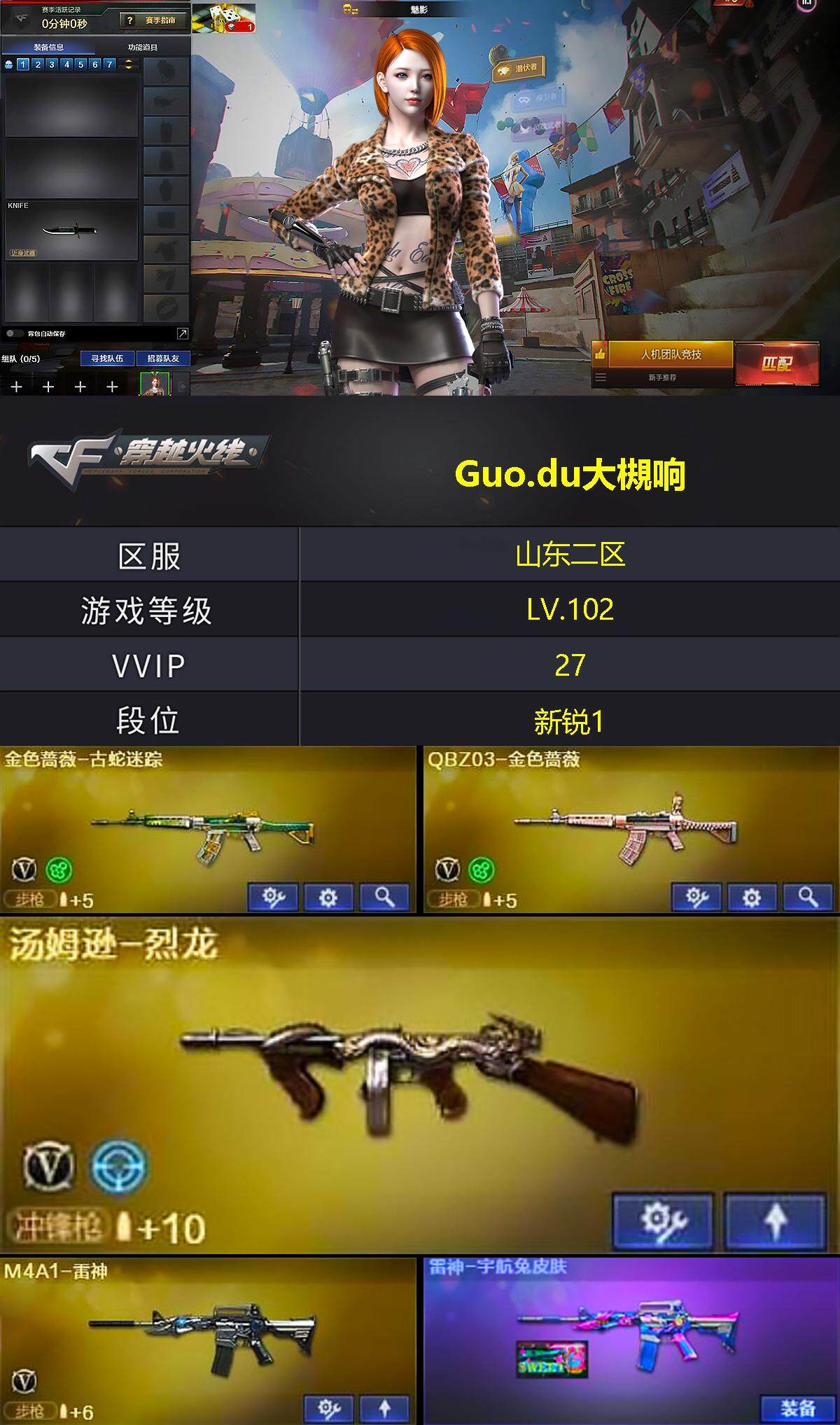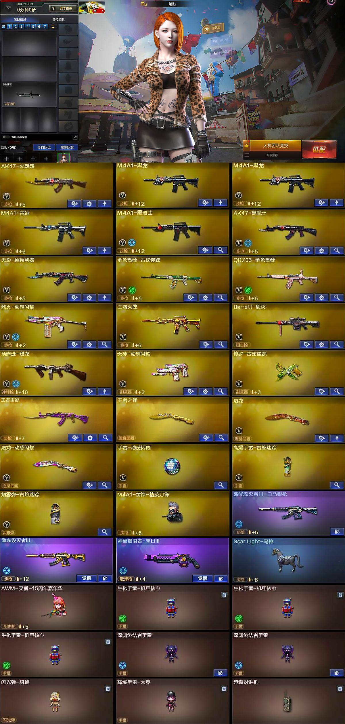 - [13036694]【370】151V/102级/荣耀元首/1传说/25王者/7炫金/4英雄/传说光耀/QBZ03-金色蔷薇/Scar Light-白虎/HK417-朱雀/M200-幻神/死亡之眼/火麒麟-荣耀世冠/Kar98k-星神/金色小号/C.A.T/M4A1-黑骑士/汤姆逊-烈龙/RPK-盘龙/加特林-炼狱/斯泰尔蝴蝶/USP雷暴/COP-堕天神/沙鹰-修罗/蝴蝶斯泰尔+6烈龙/王者之戮/王者之灵/王者冰锋/炫金天龙/炫金千变/炫金雷神/炫金修罗/炫金黑武士/炫金超新星/AK47-火麒麟音效卡/M4A1-雷神音效卡/M4A1-黑龙音效卡/M4A1-黑骑士音效卡/Barrett-毁灭音效卡/Barrett-极光音效卡/白虎-白鲨-CFPLS23冠军/雷神-虎将/雷神-耀金皮肤/雷神-传奇N9/火麒麟-华夏之心/火麒麟-平天大圣/火麒麟-心动糖果/毁灭耀金皮肤/毁灭-黑大圣皮肤/毁灭-风暴/炼狱-星空/天龙-能量核心/AWM-天龙-传奇70KG/AWM-天龙-传奇白鲨/无影耀金皮肤/樱/魅影/炫/迷迭香/王者-葵-貂蝉/王者-零/王者复仇/王者春/雅典娜/蜀雪/铁骑荣耀/青霞仙子/M4A1-雷神-精英刀锋/巴雷特-零-水下丽影/AWM-灵狐-15周年嘉年华/M37-葵/COP-旗袍/迷你深渊冰龙/迷你牛魔王/夺魂/灵狐娃娃手雷/闪光弹-小乔/闪光弹-貂蝉/高爆手雷-大乔/黑龙吞噬者/超级对讲机/6烈龙/火狱乱世-超越/AK47-冰龙粉碎者/神圣爆裂者/冰龙粉碎者-白马银枪/激光毁灭者III-白马银枪/激光毁灭者/试炼破坏者/神圣爆裂者-末日/阐释者/AK47-火麒麟/M4A1-黑龙/M4A1-雷神/AK47-无影/AK47-黑武士/AK12-天启/AN94-超新星/M4A1-武圣/M4A1-雷霆/M4A1-堕天神/M4A1-猎神/黑骑士-海王/荣耀世冠-火麒麟/黑武士-CF网剧冠军/AWM-天龙/Barrett-毁灭/Barrett-极光/AWM-裁决/Barrett-朱雀/AA-12-雷霆/沙鹰-天神/Glock18-武圣/天神-CF网剧冠军/屠龙/龙啸/麒麟刺-堕天神/马来剑夜魔/麒麟刺/幻灵之锋/龙啸-热带奇洋/龙啸-堕天神/斩神刀-雷暴/擎天-CF网剧冠军/M4A1-赤狱骑士
