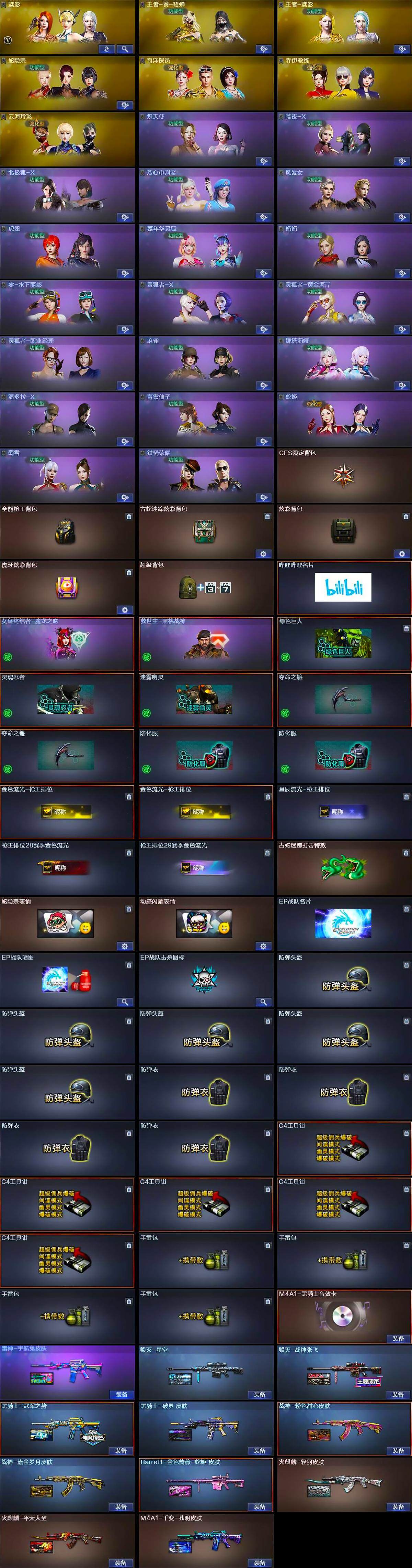 【道具】:CFS限定背包,全能枪王背包,古蛇迷踪炫彩背包,炫彩背包,虎牙炫彩背包,超级背包,哔哩哔哩名片,女皇终结者-魔龙之吻,救世主-黑桃战神,绿色巨人,灵魂忍者,迷雾幽灵,夺命之镰*2,防化服*2,金色流光-枪王排位*2,星辰流光-枪王排位,枪王排位28赛季金色流光,枪王排位29赛季金色流光,古蛇迷踪打击特效,蛇隐宗表情,动感闪耀表情,EP战队名片,EP战队喷图,EP战队击杀图标,防弹头盔*5,防弹衣*4,C4工具钳*5,手雷包*4