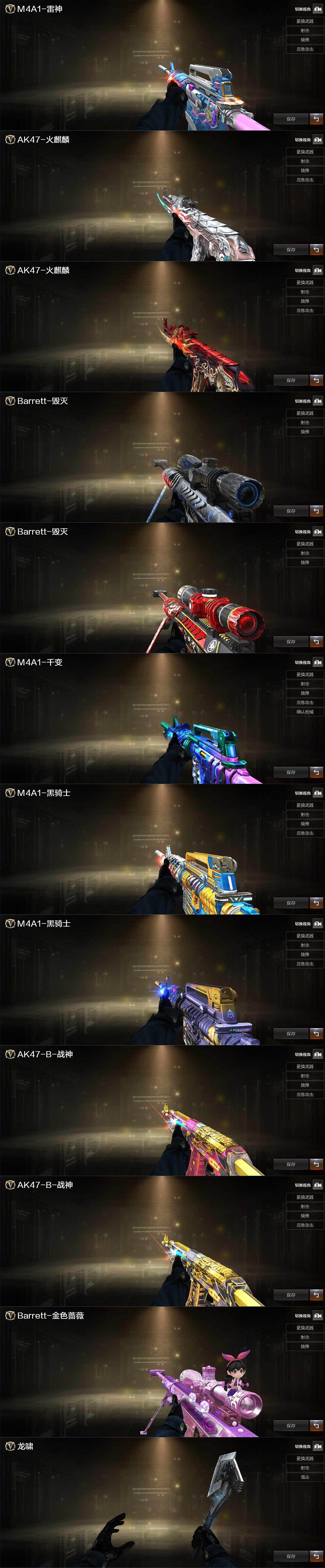 【英雄级武器】:AK47-火麒麟,M4A1-黑龙*2,M4A1-雷神,M4A1-黑骑士,AK47-黑武士,无影-神兵利器,金色蔷薇-古蛇迷踪,QBZ03-金色蔷薇,烈火-动感闪耀,AK47-B-战神,王者火魄-觉醒版,AK47-B-常胜将军,Barrett-毁灭,汤姆逊-烈龙,天神-动感闪耀,修罗-古蛇迷踪,屠龙,屠龙-动感闪耀,手雷-动感闪耀,高爆手雷-古蛇迷踪,烟雾弹-古蛇迷踪
