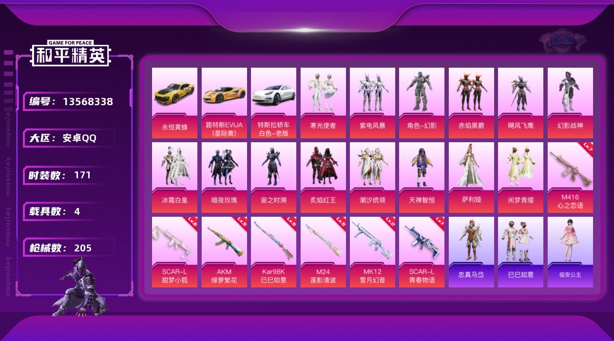 [13568338]扭蛋碎片458/地铁满天赋【暑期末清货/特价急出/永久包赔】:安卓 手Q-14粉装-7特效枪-4载具-7.3w热力值-10印记-171套装-205枪皮【热门品类】:套装-奇异狩猎者,角色-忠真马岱,大砍刀-青龙偃月刀【稀有载具】:特斯拉Model 3(珍珠白),路特斯EVIJA(星际黄),永恒黄蜂,僚机-萌兔起飞【特效枪等级】:AKM-绿萝繁花(五级),SCAR-L-青春物语(一级),SCAR-L-甜梦小狐(六级),M416-心之恋语(七级),汤姆逊-星月云朵(二级MK12-雪月幻音),Kar98K-巳巳如意(五级),M24-莲影清波(五级)【优质套装】:粉装-幻影战神,粉装-天禅智恒,粉装-潮汐统领,粉装-冰霜白皇,粉装-炙焰红王,粉装-飓风飞鹰,粉装-暗夜玫瑰,粉装-赤焰黑爵,粉装-紫电风暴,粉装-寒光使者,角色-幻影,粉装-闲梦青缨,角色-宙之时溯,角色-萨利娅
