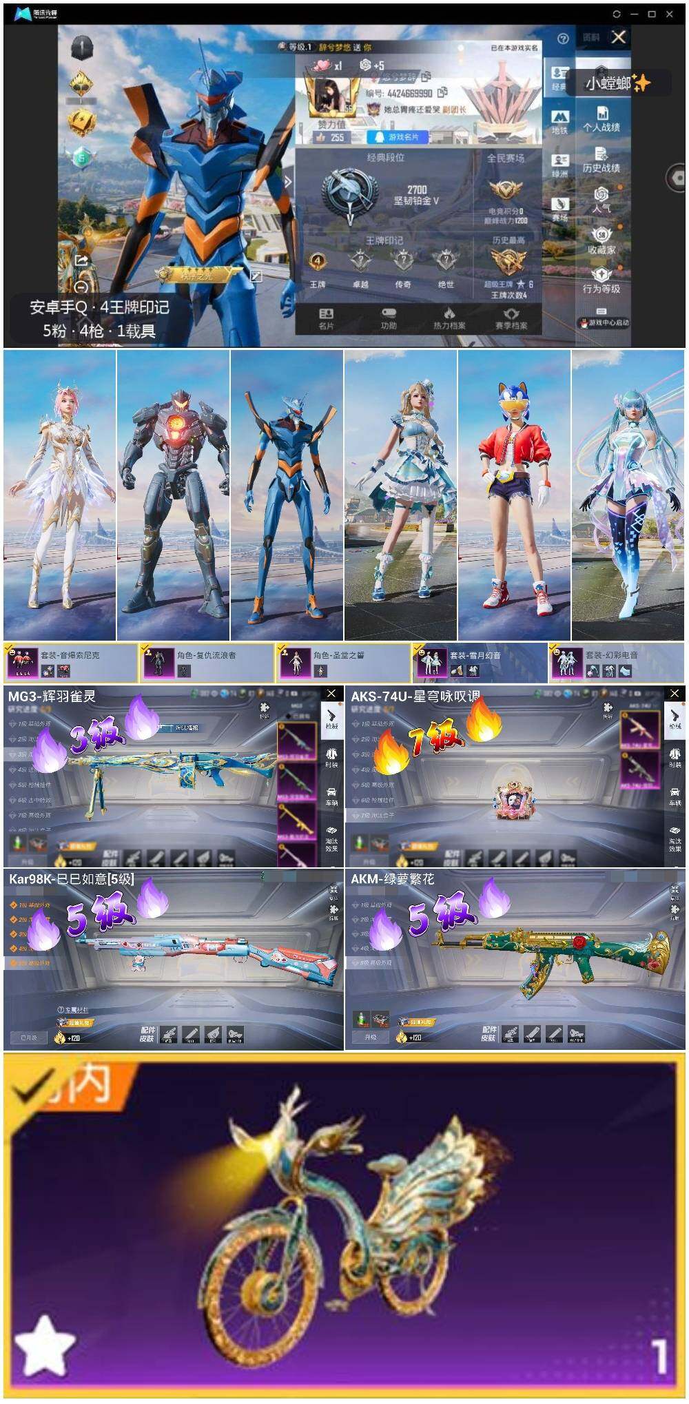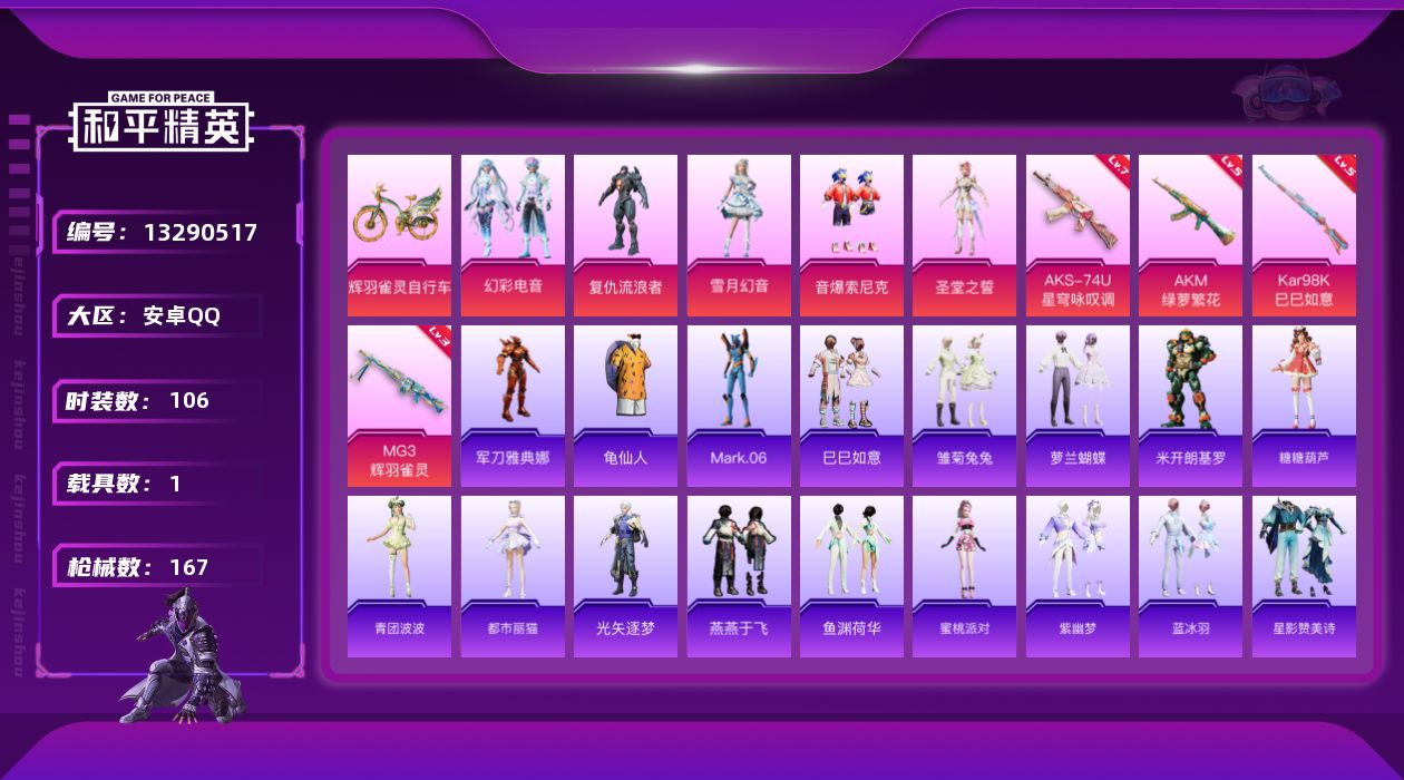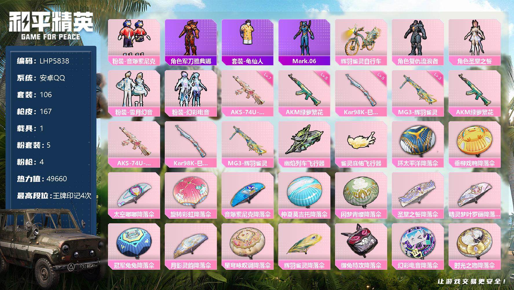 [13290517]安卓 手Q-5粉装-4特效枪-1载具-2粉色飞行器-4.9w热力值-4王牌印记-106套装-167枪皮【热门品类】:粉装-音爆索尼克,角色-军刀雅典娜,套装-龟仙人,角色-Mark.06【粉色载具】:辉羽雀灵自行车【粉色套装】:角色-复仇流浪者,粉装-音爆索尼克,角色-圣堂之誓,粉装-雪月幻音,粉装-幻彩电音【粉色枪皮等级】:AKM-绿萝繁花(五级),AKS-74U-星穹咏叹调(七级),Kar98K-巳巳如意(五级),MG3-辉羽雀灵(三级)【粉色飞行器】:幽焰列车飞行器,雀灵庇佑飞行器