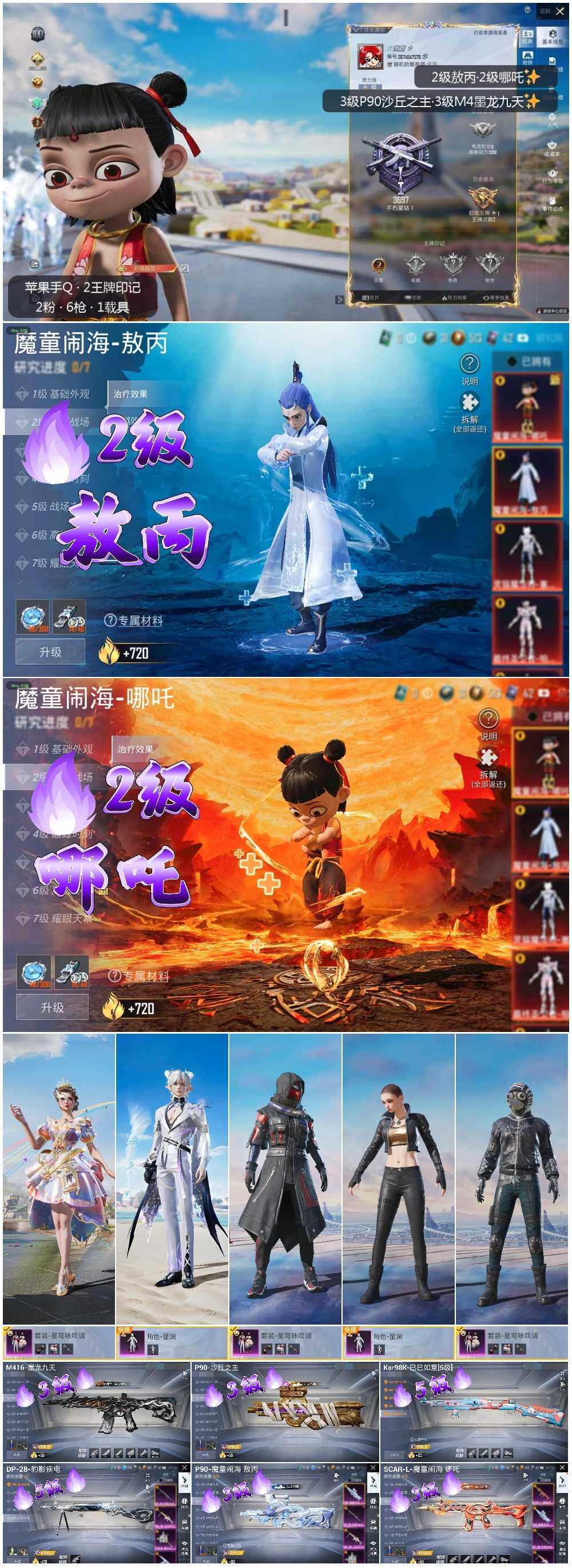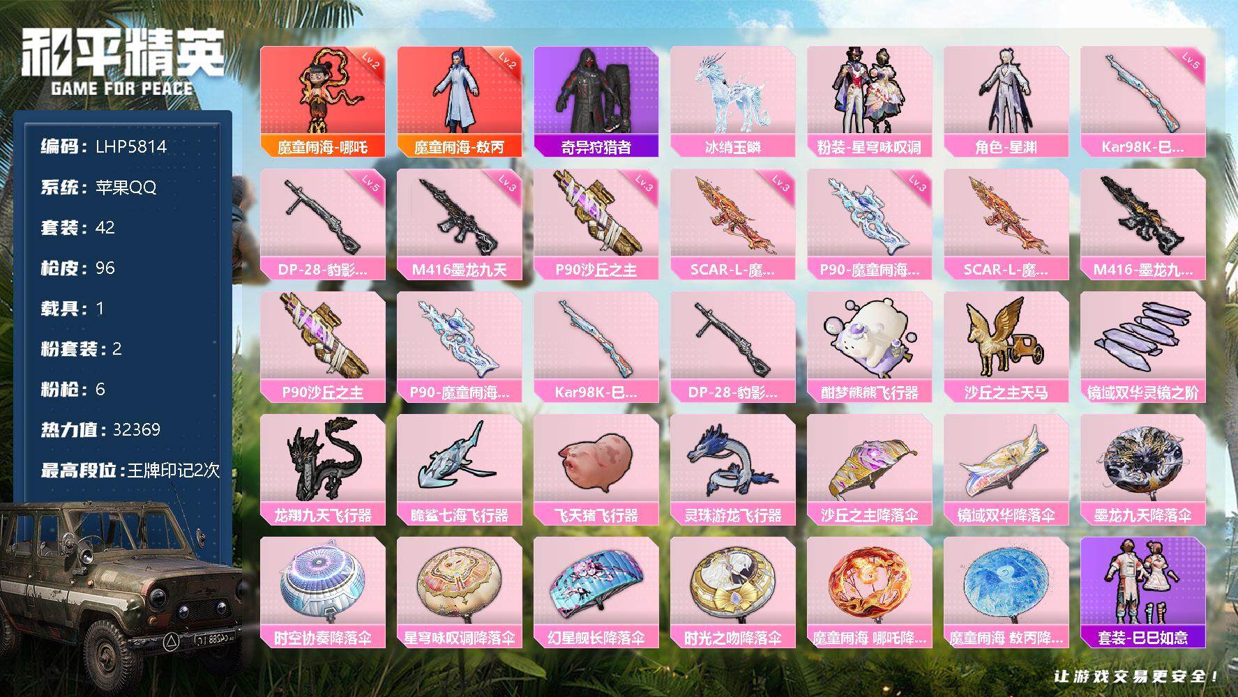 [13290817]素材身法号 苹果 手Q-2神装-2粉装-6特效枪-1载具-7粉色飞行器-3.2w热力值-2王牌印记-42套装-96枪皮【红色神装等级】:魔童闹海-敖丙(二级),魔童闹海-哪吒(二级)【热门品类】:套装-奇异狩猎者【粉色载具】:冰绡玉鳞【粉色套装】:粉装-星穹咏叹调,角色-星渊【粉色枪皮等级】:SCAR-L-魔童闹海 哪吒(三级),M416-墨龙九天(三级),P90-沙丘之主(三级),P90-魔童闹海 敖丙(三级),Kar98K-巳巳如意(五级),DP-28-豹影疾电(五级)【粉色飞行器】:酣梦熊熊飞行器,沙丘之主天马,镜域双华-灵镜之阶,龙翔九天飞行器,脆鲨七海飞行器,飞天猪飞行器,灵珠游龙飞行器