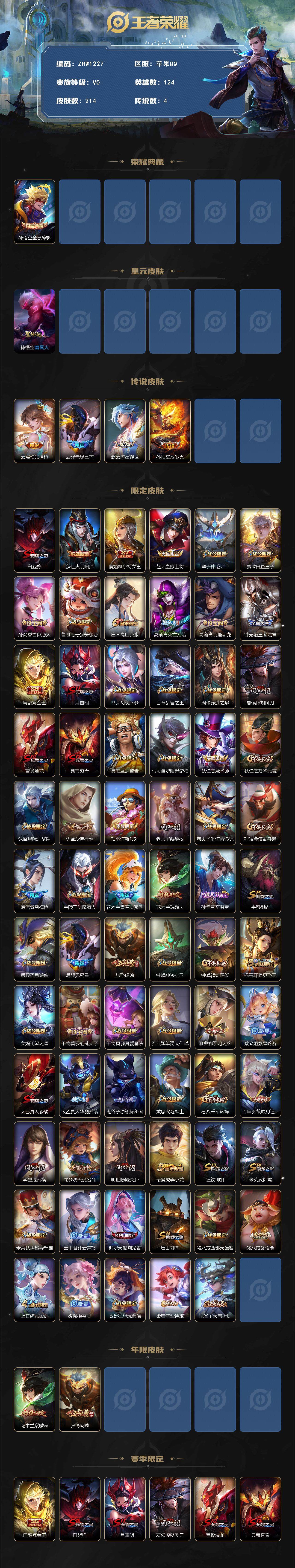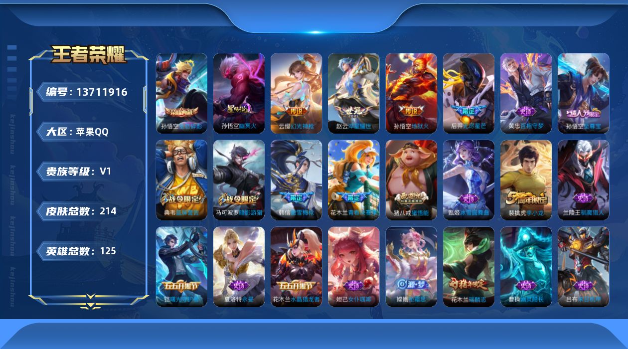 - PX_2103111-实名: 可修改 贵族等级: V7 英雄数: 123 皮肤数: 188 传说皮: 冠军飞将,炽阳神光,末日机甲-孙尚香,地狱火,地狱之眼,胖达荣荣,超时空战士-狄仁杰,山海·炽霜斩,山海·苍雷引,电玩·雷克斯 限定皮: 李小龙,引擎之心,白虎志,青龙志,瑞麟志,玄武志,朱雀志,一生所爱,大圣娶亲,五谷丰年,山海·玄木吟