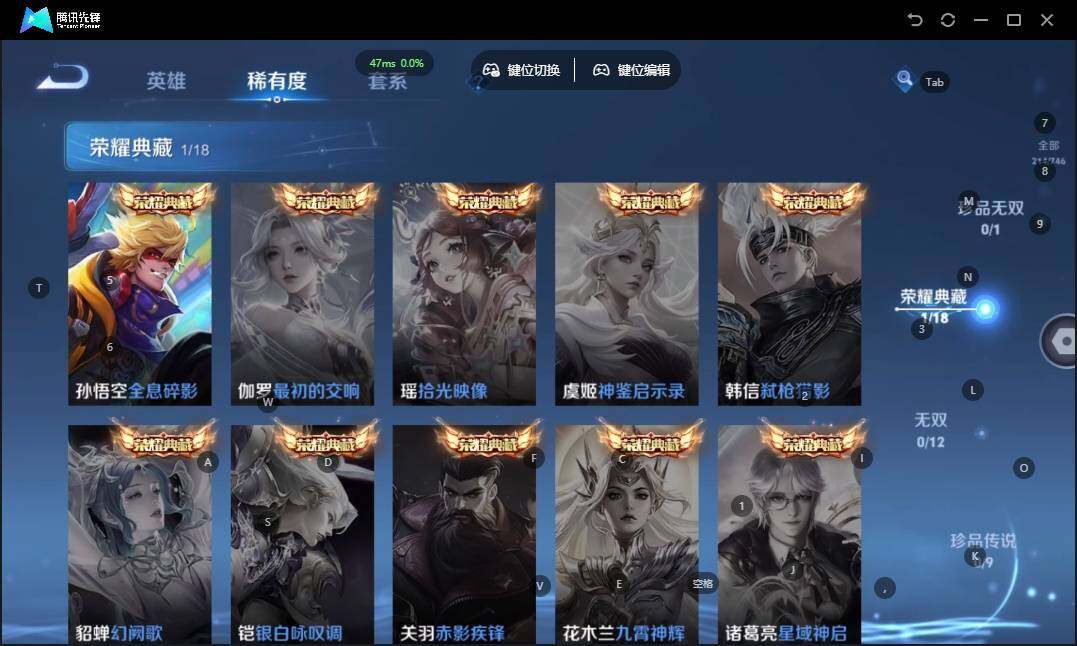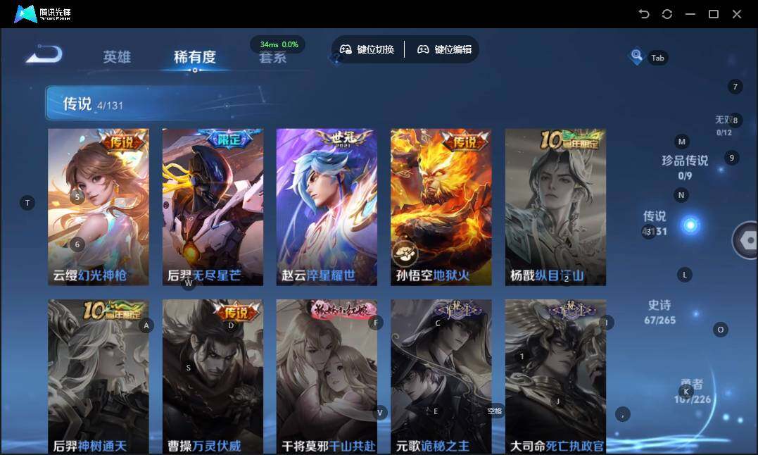 - [11297248]V9 2典藏 11传说 109英雄 146皮肤 可修改实名 优质装备:活力突击,全息碎影(猴子典藏),黄金射手座,冠军飞将,末日机甲-孙尚香(绿蚂蚱),地狱火,仲夏夜之梦(大飞蛾),地狱之眼,超时空战士-狄仁杰 限定皮:凤求凰(白切鸡),梅西,飞衡(韩信年限),天狼狩猎者,永曜之星,辉光之辰,天魔缭乱,青春决赛季 史诗皮:紫霞仙子,苍穹之光,白龙吟,黄金分割率,特工魅影,千年之狐,猫狗日记-孙策,乱世虎臣,节奏热浪,水果甜心,星夜王子,功夫厨神,幽灵船长,鬼剑武藏,缤纷独角兽,乘风破浪,逐浪之夏,水晶猎龙者,箭羽风息,金属风暴,圣诞狂欢,鹰眼统帅,魅力维加斯,未来纪元-赵云