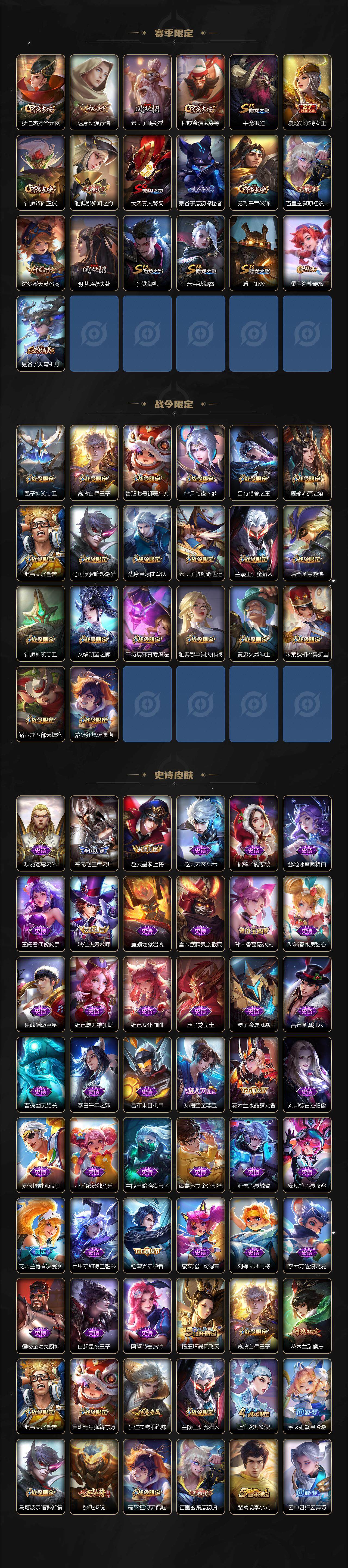 【赛季限定】:扁鹊炼金王,白起狰,芈月重明,夏侯惇朔风刀,曹操烛龙,典韦穷奇,狄仁杰万华元夜,达摩沙漠行僧,老夫子醍醐杖,程咬金演武夺筹,牛魔御旌,虞姬凯尔特女王,钟馗驱傩正仪,雅典娜黎明之约,太乙真人饕餮,鬼谷子原初探秘者,苏烈千军破阵,百里玄策原初追逐者,弈星混沌棋,沈梦溪大漠名商,明世隐疑决卦,狂铁御狮,米莱狄御霄,盾山御銮,桑启海盐诗旅,鬼谷子天穹祈灯