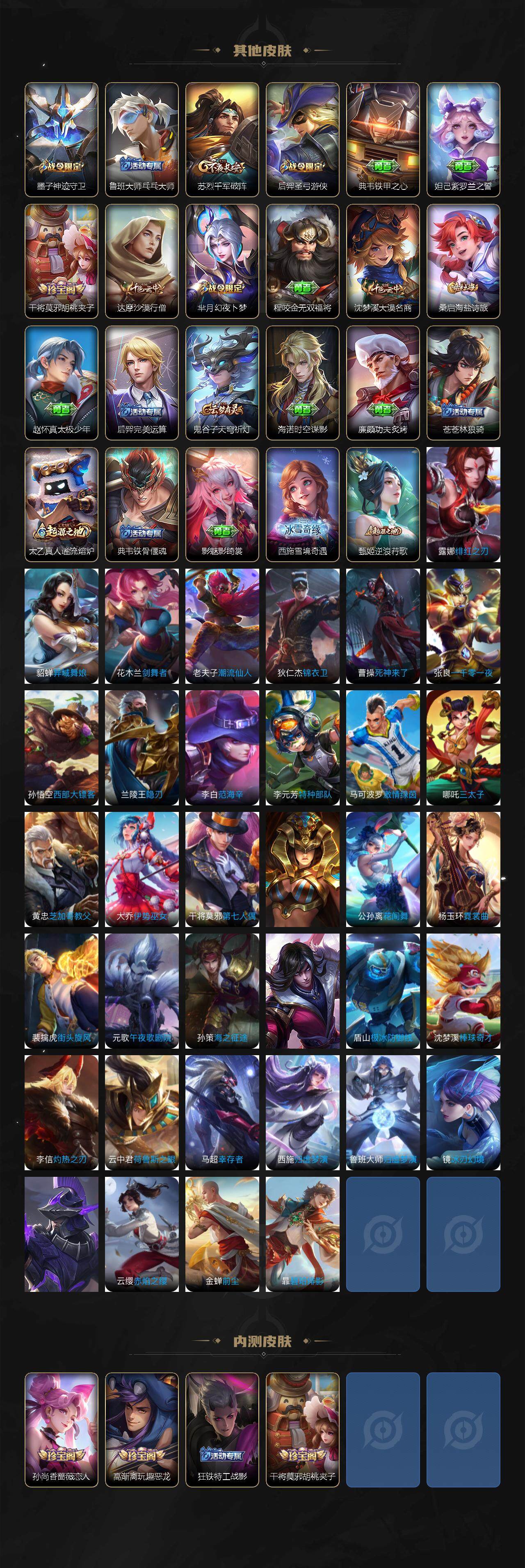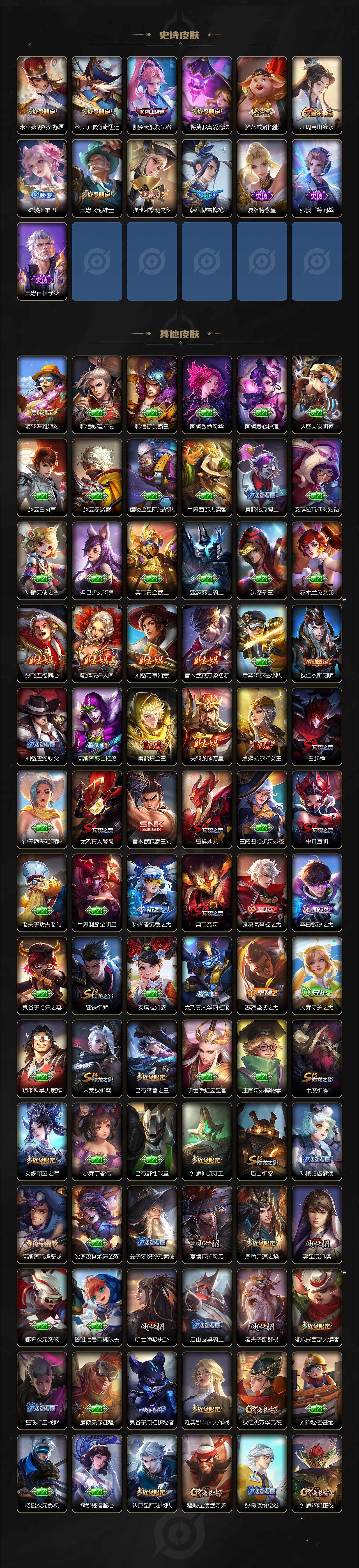 【限定皮肤】:白起狰,狄仁杰阴阳师,虞姬凯尔特女王,赵云皇家上将,墨子神迹守卫,嬴政白昼王子,孙尚香蔷薇恋人,鲁班七号狮舞东方,庄周高山流水,高渐离死亡摇滚,高渐离玩趣恶龙,钟无艳王者之锤,扁鹊炼金王,芈月重明,芈月幻夜卜梦,吕布猎兽之王,周瑜赤莲之焰,夏侯惇朔风刀,曹操烛龙,典韦穷奇,典韦蓝屏警告,马可波罗暗影游猎,狄仁杰魔术师,狄仁杰万华元夜,达摩星际陆战队,达摩沙漠行僧,项羽海滩派对,老夫子醍醐杖,老夫子航海奇遇记,程咬金演武夺筹,韩信傲雪梅枪,兰陵王驯魔猎人,花木兰青春决赛季,花木兰瑞麟志,孙悟空至尊宝,牛魔御旌,后羿圣弓游侠,后羿无尽星芒,张飞虎魄,钟馗神迹守卫,钟馗驱傩正仪,杨玉环遇见飞天,女娲朔望之晖,干将莫邪胡桃夹子,干将莫邪真爱魔法,雅典娜单词大作战,雅典娜黎明之约,蔡文姬繁星吟游,太乙真人饕餮,太乙真人华丽摇滚,鬼谷子原初探秘者,黄忠火炮绅士,苏烈千军破阵,百里玄策原初追逐者,弈星混沌棋,沈梦溪大漠名商,明世隐疑决卦,裴擒虎李小龙,狂铁御狮,米莱狄御霄,米莱狄胡桃异想国,云中君纤云弄巧,伽罗天狼溯光者,盾山御銮,猪八戒西部大镖客,猪八戒猪悟能,上官婉儿梁祝,嫦娥拒霜思,蒙犽狂想玩偶喵,桑启海盐诗旅,鬼谷子天穹祈灯