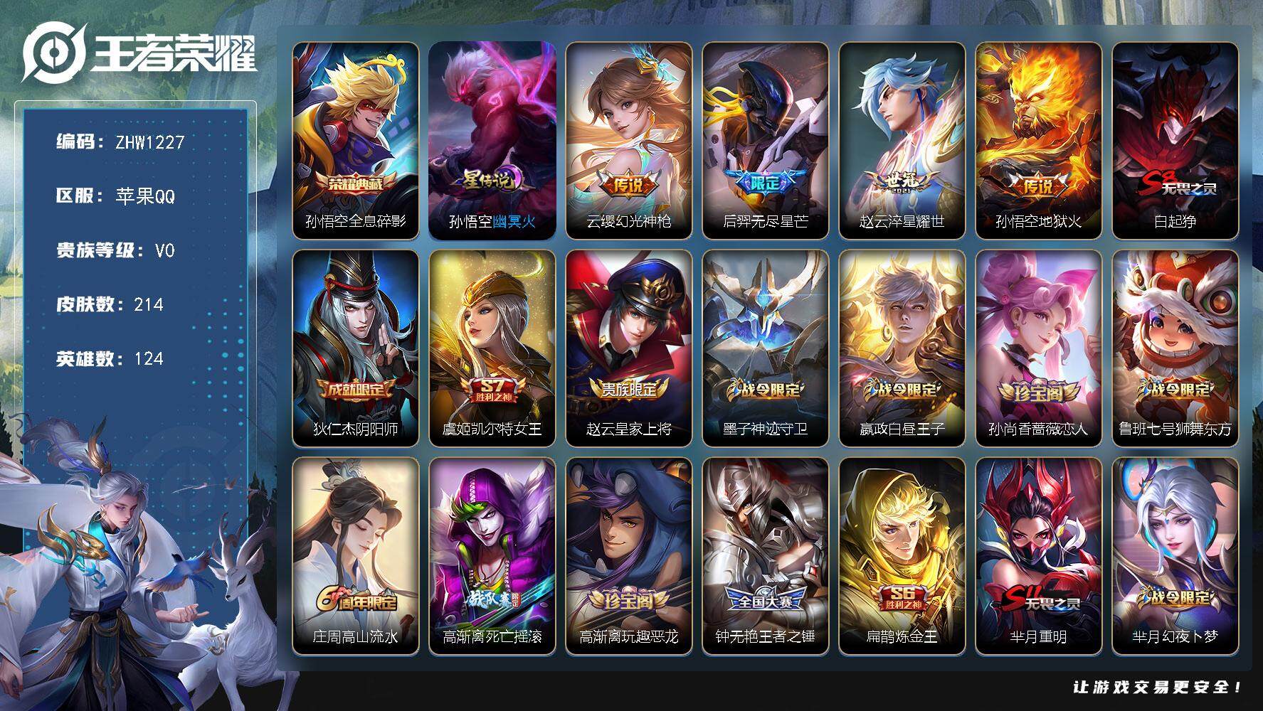 [13711916]可二次【店主推荐捡漏号!可直接换绑】:苹果Q-V0-最强王者段位-124英雄-214皮肤-1典藏-1星元-4传说-67史诗 【英雄全皮】:影全皮 【荣耀典藏】:孙悟空全息碎影 【传说皮肤】:云缨幻光神枪,后羿无尽星芒,赵云淬星耀世,孙悟空地狱火 【限定皮肤】:白起狰,狄仁杰阴阳师,虞姬凯尔特女王,赵云皇家上将,墨子神迹守卫,嬴政白昼王子,孙尚香蔷薇恋人,鲁班七号狮舞东方,庄周高山流水,高渐离死亡摇滚,高渐离玩趣恶龙,钟无艳王者之锤,扁鹊炼金王,芈月重明,芈月幻夜卜梦,吕布猎兽之王,周瑜赤莲之焰,夏侯惇朔风刀,曹操烛龙,典韦穷奇,典韦蓝屏警告,马可波罗暗影游猎,狄仁杰魔术师,狄仁杰万华元夜,达摩星际陆战队,达摩沙漠行僧,项羽海滩派对,老夫子醍醐杖,老夫子航海奇遇记,程咬金演武夺筹,韩信傲雪梅枪,兰陵王驯魔猎人,花木兰青春决赛季,花木兰瑞麟志,孙悟空至尊宝,牛魔御旌,后羿圣弓游侠,后羿无尽星芒,张飞虎魄,钟馗神迹守卫,钟馗驱傩正仪,杨玉环遇见飞天,女娲朔望之晖,干将莫邪胡桃夹子,干将莫邪真爱魔法,雅典娜单词大作战,雅典娜黎明之约,蔡文姬繁星吟游,太乙真人饕餮,太乙真人华丽摇滚,鬼谷子原初探秘者,黄忠火炮绅士,苏烈千军破阵,百里玄策原初追逐者,弈星混沌棋,沈梦溪大漠名商,明世隐疑决卦,裴擒虎李小龙,狂铁御狮,米莱狄御霄,米莱狄胡桃异想国,云中君纤云弄巧,伽罗天狼溯光者,盾山御銮,猪八戒西部大镖客,猪八戒猪悟能,上官婉儿梁祝,嫦娥拒霜思,蒙犽狂想玩偶喵,桑启海盐诗旅,鬼谷子天穹祈灯 【年限皮肤】:花木兰瑞麟志,张飞虎魄 【赛季限定】:扁鹊炼金王,白起狰,芈月重明,夏侯惇朔风刀,曹操烛龙,典韦穷奇,狄仁杰万华元夜,达摩沙漠行僧,老夫子醍醐杖,程咬金演武夺筹,牛魔御旌,虞姬凯尔特女王,钟馗驱傩正仪,雅典娜黎明之约,太乙真人饕餮,鬼谷子原初探秘者,苏烈千军破阵,百里玄策原初追逐者,弈星混沌棋,沈梦溪大漠名商,明世隐疑决卦,狂铁御狮,米莱狄御霄,盾山御銮,桑启海盐诗旅,鬼谷子天穹祈灯 【战令限定】:墨子神迹守卫,嬴政白昼王子,鲁班七号狮舞东方,芈月幻夜卜梦,吕布猎兽之王,周瑜赤莲之焰,典韦蓝屏警告,马可波罗暗影游猎,达摩星际陆战队,老夫子航海奇遇记,兰陵王驯魔猎人,后羿圣弓游侠,钟馗神迹守卫,女娲朔望之晖,干将莫邪真爱魔法,雅典娜单词大作战,黄忠火炮绅士,米莱狄胡桃异想国,猪八戒