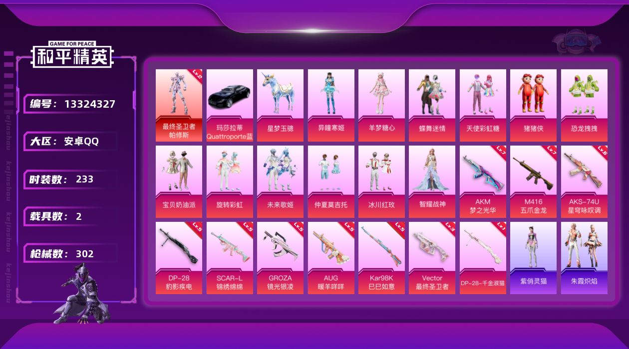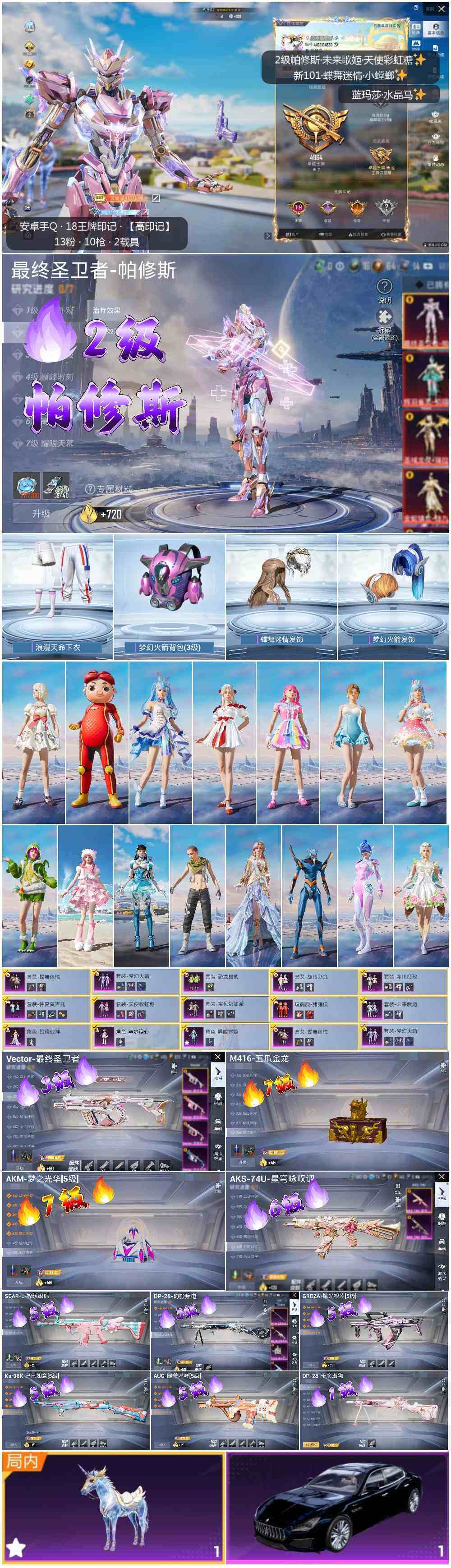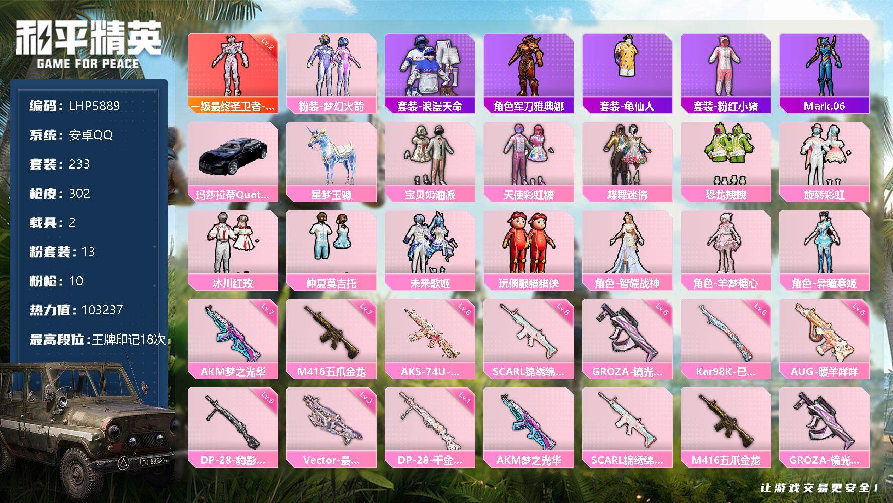 [13324327]【店主推荐捡漏号!可直接换绑】素材身法号/地铁满天赋 安卓 手Q-1神装-13粉装-10特效枪-2载具-5粉色飞行器-10.3w热力值-18王牌印记-233套装-302枪皮【红色神装等级】:最终圣卫者-帕修斯(二级)【热门品类】:粉装-梦幻火箭,套装-浪漫天命,角色-军刀雅典娜,套装-龟仙人,套装-粉红小猪,角色-Mark.06【粉色载具】:玛莎拉蒂Quattroporte(夜幕蓝),星梦玉骢【粉色套装】:粉装-宝贝奶油派,粉装-天使彩虹糖,粉装-蝶舞迷情,粉装-梦幻火箭,粉装-恐龙拽拽,粉装-旋转彩虹,粉装-冰川红玫,粉装-仲夏莫吉托,粉装-未来歌姬,玩偶服-猪猪侠,角色-智耀战神,角色-羊梦糖心,角色-异瞳寒姬【粉色枪皮等级】:AKM-梦之光华(七级),SCAR-L-锦绣绵绵(五级),M416-五爪金龙(七级),GROZA-镜光银凌(五级),AUG-暖羊咩咩(五级),Vector-最终圣卫者(三级),AKS-74U-星穹咏叹调(六级),Kar98K-巳巳如意(五级),DP-28-千金淑猫(一级),DP-28-豹影疾电(五级)【粉色飞行器】:春暖花开飞行器,凤舞九天飞行器,终晖之翼飞行器,灵珠游龙飞行器