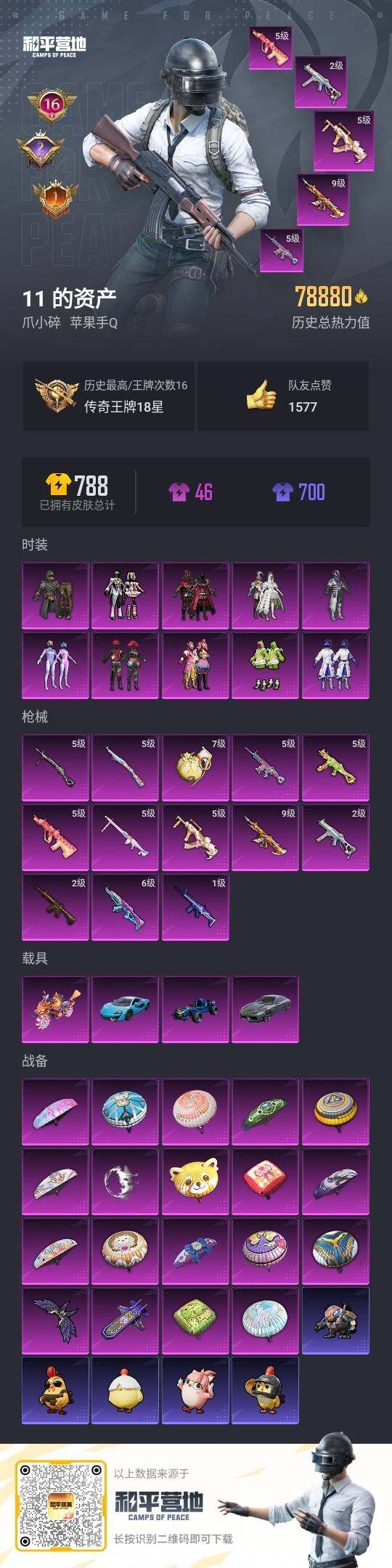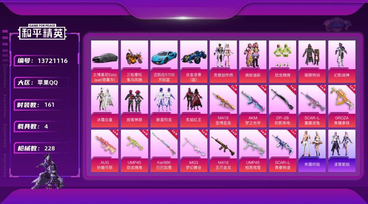 - PX_2077915- 苹果手Q-11王牌印记-6粉装-4特效枪-1载具-47056热力值-97套装-140枪皮-0卓越印记-0传奇印记 【6粉装】,梦幻火箭,宝贝奶油派,荧海星豚,玩偶服-猪猪侠,智能音符,数码大师 【4特效枪】AKM-星际浪客-7级 M416-暖熊萌萌-7级 Kar98K-巳巳如意-5级 M249-彩虹甜喵-5级 【6稀有紫装】,都市猎人,派对舞王,8号机,迅捷狂鲨,龟仙人,