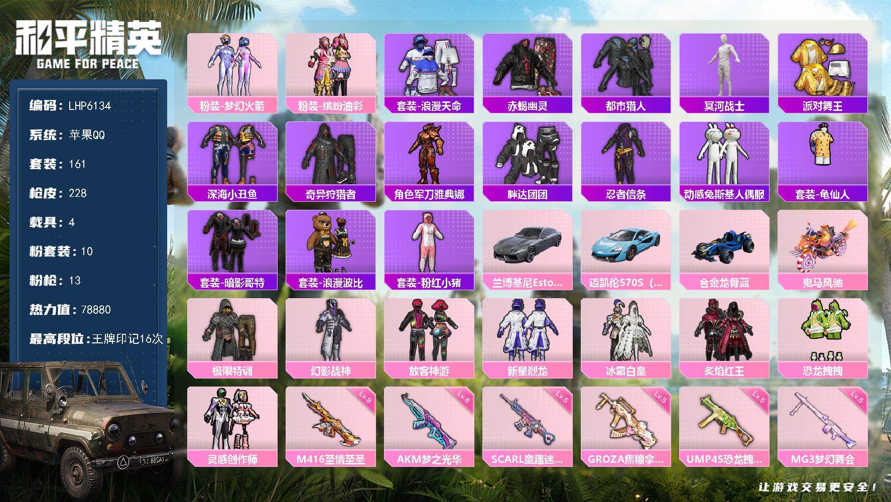 [13721116]【店主推荐捡漏号!可直接换绑】/素材身法号/老木乃伊/M416-至情至圣(九级) 苹果 手Q-10粉装-13特效枪-4载具-3粉色飞行器-7.8w热力值-16王牌印记-161套装-228枪皮【热门品类】:粉装-梦幻火箭,粉装-缤纷油彩,套装-浪漫天命,套装-赤蝎幽灵,套装-都市猎人,套装-冥河战士,套装-派对舞王,套装-深海小丑鱼,套装-奇异狩猎者,角色-军刀雅典娜,套装-胖达团团,套装-忍者信条,套装-动感兔斯基人偶服,套装-龟仙人,套装-暗影哥特,套装-浪漫波比,套装-粉红小猪【粉色载具】:兰博基尼Estoque(银翼灰),迈凯伦570S(天际蓝),合金龙骨(蓝),鬼马风驰【粉色套装】:粉装-极限特训,粉装-幻影战神,粉装-梦幻火箭,粉装-缤纷油彩,粉装-放客神游,粉装-新星烈龙,粉装-冰霜白皇,粉装-炙焰红王,粉装-恐龙拽拽,粉装-灵感创作师【粉色枪皮等级】:AKM-梦之光华(六级),SCAR-L-童趣迷兔(五级),SCAR-L-青春物语(一级),M416-五爪金龙(二级),M416-至情至圣(九级),GROZA-焦糖拿铁(五级),AUG-妙趣可丽(五级),UMP45-相思残雪(二级),UMP45-恐龙拽拽(五级),Kar98K-巳巳如意(五级),DP-28-豹影疾电(五级),MG3-梦幻舞会(五级)【粉色飞行器】:伏魔团飞行器,星夜魔法师飞行翼,全功率超战飞行器
