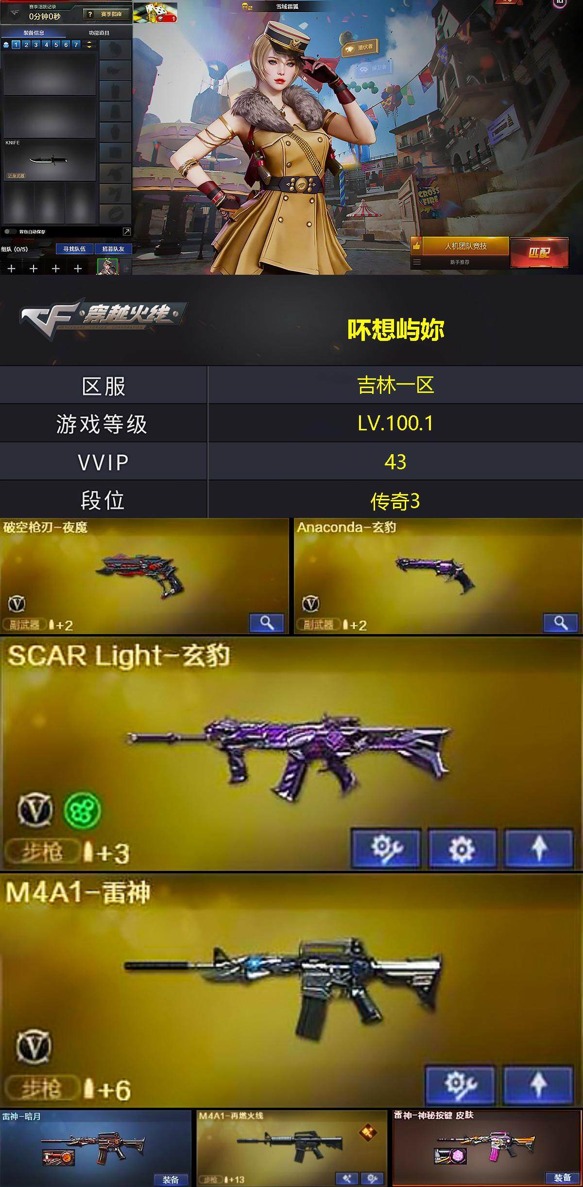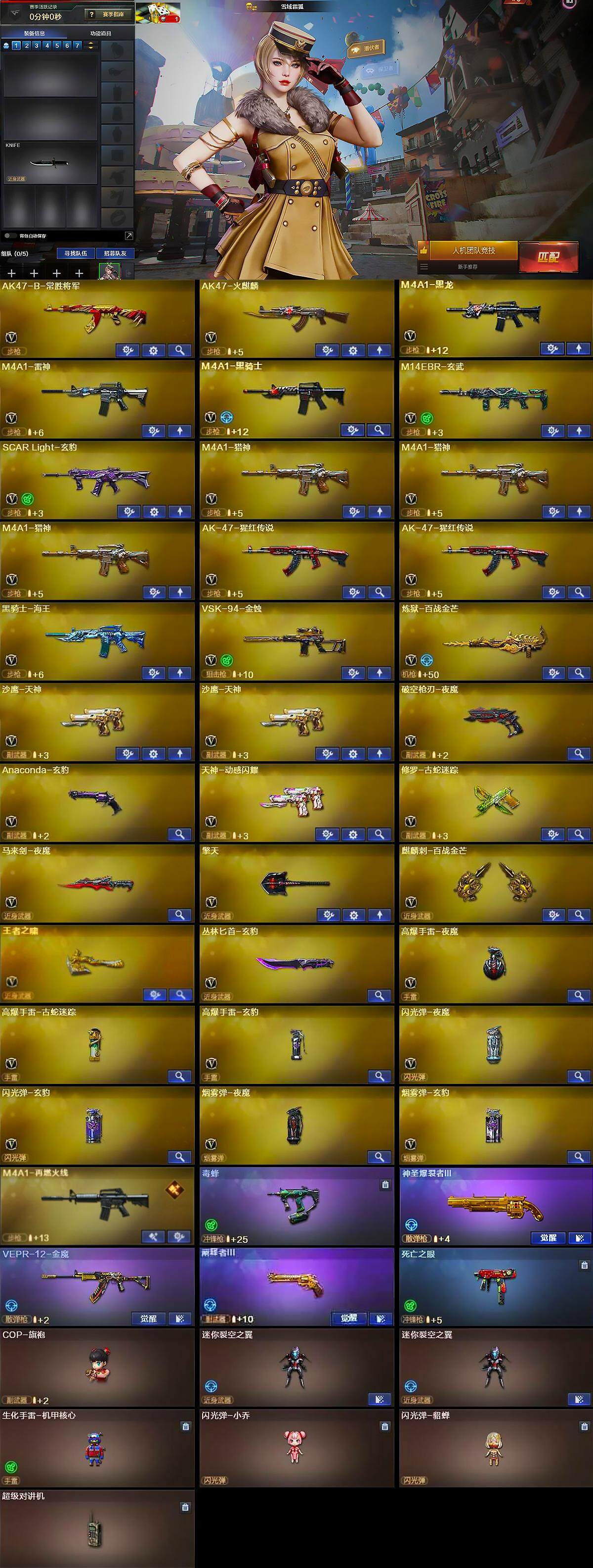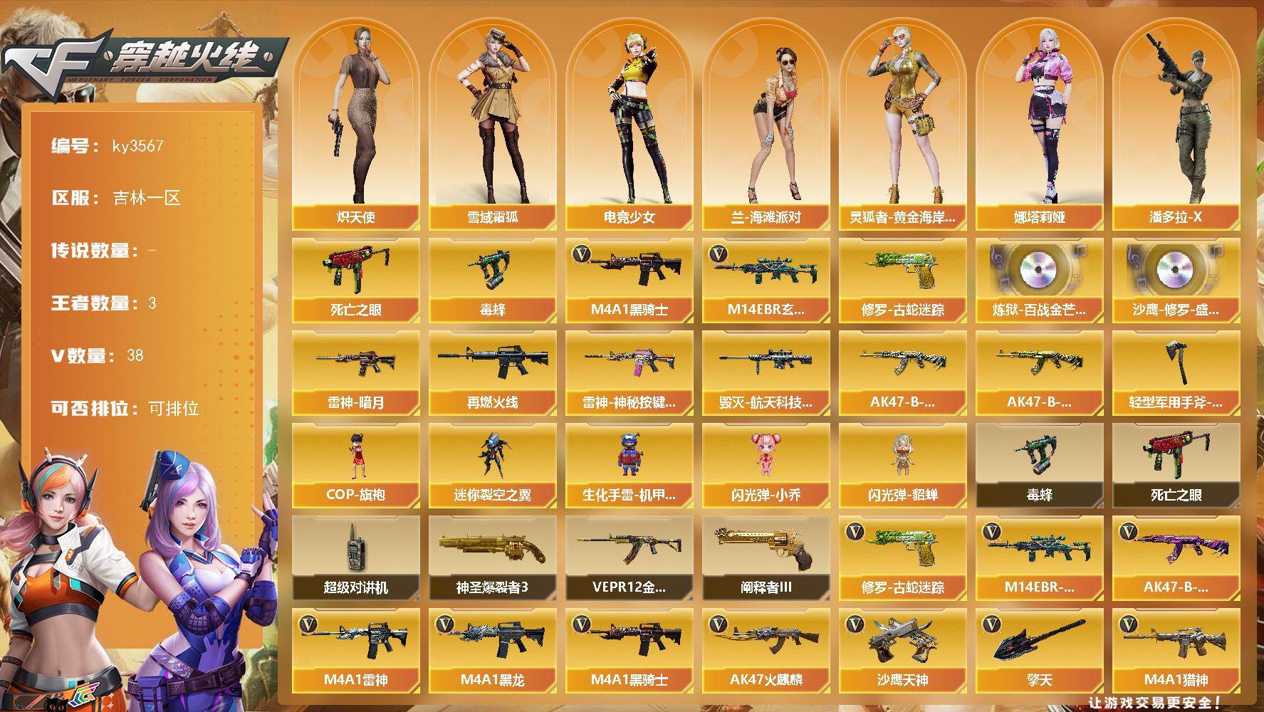 [13787914]吉林一区-38V-3王者-0炫金 【热门武器】:M14EBR-玄武,修罗-古蛇迷踪,死亡之眼,毒蜂,M4A1-黑骑士 【音效卡】:炼狱-百战金芒-庆典舞曲音效卡,沙鹰-修罗-盛典舞曲音效卡 【皮肤】:雷神-暗月,M4A1-再燃火线,雷神-神秘按键 皮肤,毁灭-航天科技皮肤,AK47-B-常胜将军-刘备,AK47-B-常胜将军-孙权,轻型军用手斧-再燃火线 【角色】:雪域霜狐,炽天使,电竞少女,兰-海滩派对,灵狐者-黄金海岸,娜塔莉娅,潘多拉-X,潘多拉-甜心教官,蛇姬,雪莉杨-摸金校尉,影武者-X 【人偶武器】:COP-旗袍,迷你裂空之翼*2,生化手雷-机甲核心,闪光弹-小乔,闪光弹-貂蝉 【暴走生化】:毒蜂,死亡之眼,超级对讲机 【挑战大师】:神圣爆裂者III,VEPR-12-金魔,阐释者III 【英雄级武器】:AK47-火麒麟,M4A1-黑龙,M4A1-雷神,M4A1-黑骑士,M14EBR-玄武,SCAR Light-玄豹,M4A1-猎神*3,AK-47-猩红传说*2,黑骑士-海王,AK47-B-常胜将军,VSK-94-金蚀,炼狱-百战金芒,沙鹰-天神*2,破空枪刃-夜魔,Anaconda-玄豹,天神-动感闪耀,修罗-古蛇迷踪,马来剑-夜魔,擎天,麒麟刺-百战金芒,王者之啸-觉醒版,丛林匕首-玄豹,高爆手雷-夜魔,高爆手雷-古蛇迷踪,高爆手雷-玄豹,闪光弹-夜魔,闪光弹-玄豹,烟雾弹-夜魔,烟雾弹-玄豹 【道具】:亚洲杯纪念炫彩背包,古蛇迷踪炫彩背包,女皇终结者-背包,百战金芒炫彩背包,超级背包,女皇终结者-魔龙之吻,救世主-黑桃战神,绿色巨人,夺命之镰,防化服*3,流光-鎏金之域,枪王排位29赛季金色流光,语音特效-盛典烟火,古蛇迷踪打击特效,蛇隐宗表情,萌萌小葵表情,防弹头盔*3,防弹衣*3,C4工具钳*3,手雷包*3 【特殊枪械】:1黑骑士