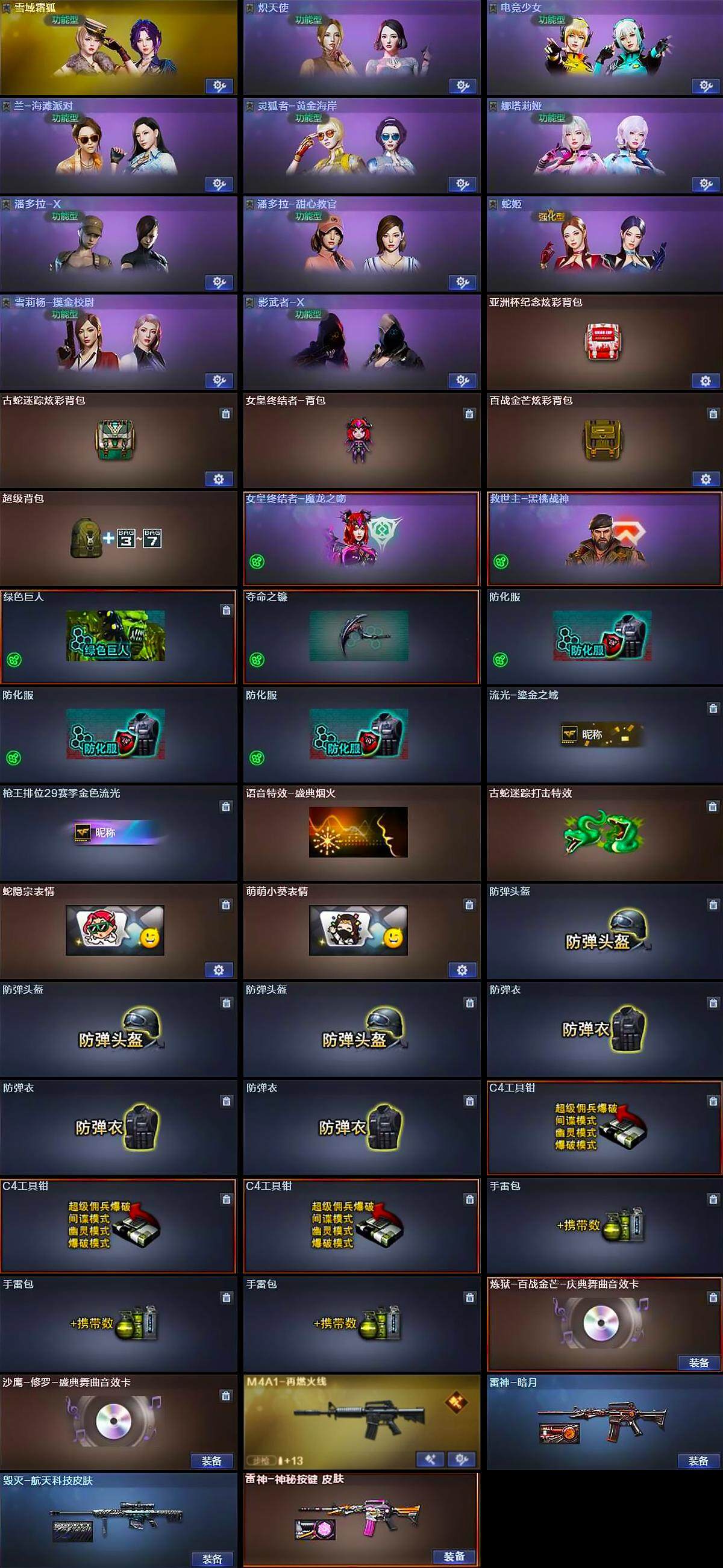 【道具】:亚洲杯纪念炫彩背包,古蛇迷踪炫彩背包,女皇终结者-背包,百战金芒炫彩背包,超级背包,女皇终结者-魔龙之吻,救世主-黑桃战神,绿色巨人,夺命之镰,防化服*3,流光-鎏金之域,枪王排位29赛季金色流光,语音特效-盛典烟火,古蛇迷踪打击特效,蛇隐宗表情,萌萌小葵表情,防弹头盔*3,防弹衣*3,C4工具钳*3,手雷包*3