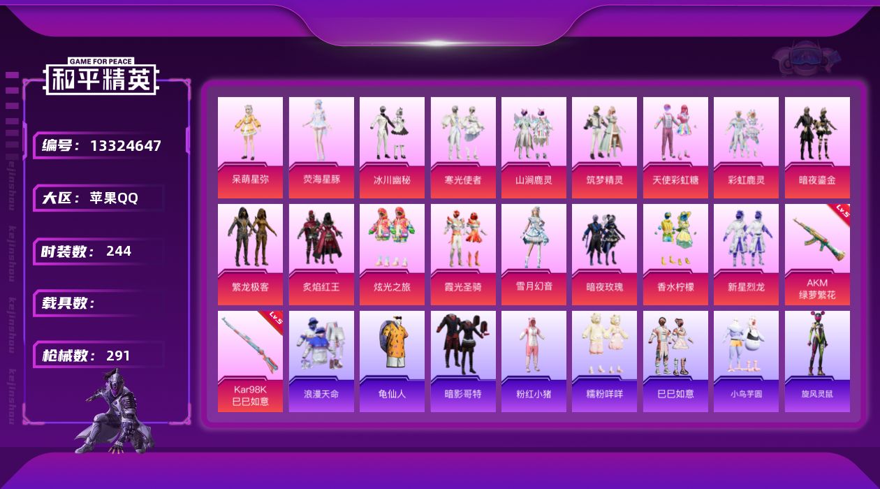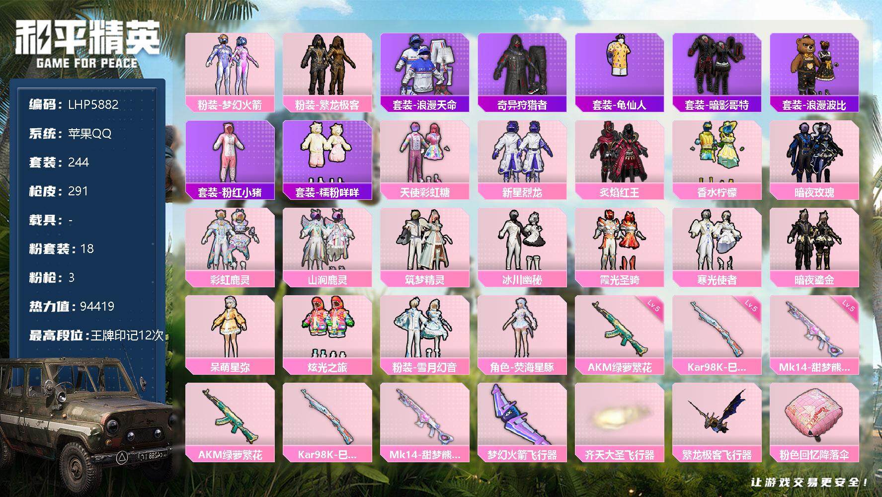 [13324647]【店主推荐捡漏号!可直接换绑】地铁满天赋 苹果 手Q-18粉装-3特效枪-3粉色飞行器-9.4w热力值-12王牌印记-244套装-291枪皮【热门品类】:粉装-梦幻火箭,粉装-繁龙极客,套装-浪漫天命,套装-奇异狩猎者,套装-龟仙人,套装-暗影哥特,套装-浪漫波比,套装-粉红小猪,套装-糯粉咩咩【粉色套装】:粉装-天使彩虹糖,粉装-梦幻火箭,粉装-新星烈龙,粉装-炙焰红王,粉装-香水柠檬,粉装-暗夜玫瑰,粉装-彩虹鹿灵,粉装-山涧鹿灵,粉装-筑梦精灵,粉装-冰川幽秘,粉装-霞光圣骑,粉装-寒光使者,粉装-暗夜鎏金,角色-呆萌星弥,粉装-炫光之旅,粉装-繁龙极客,粉装-雪月幻音,角色-荧海星豚【粉色枪皮等级】:AKM-绿萝繁花(五级),Kar98K-巳巳如意(五级),Mk14-甜梦熊击(五级)【粉色飞行器】:梦幻火箭飞行器,齐天大圣飞行器,繁龙极客飞行器