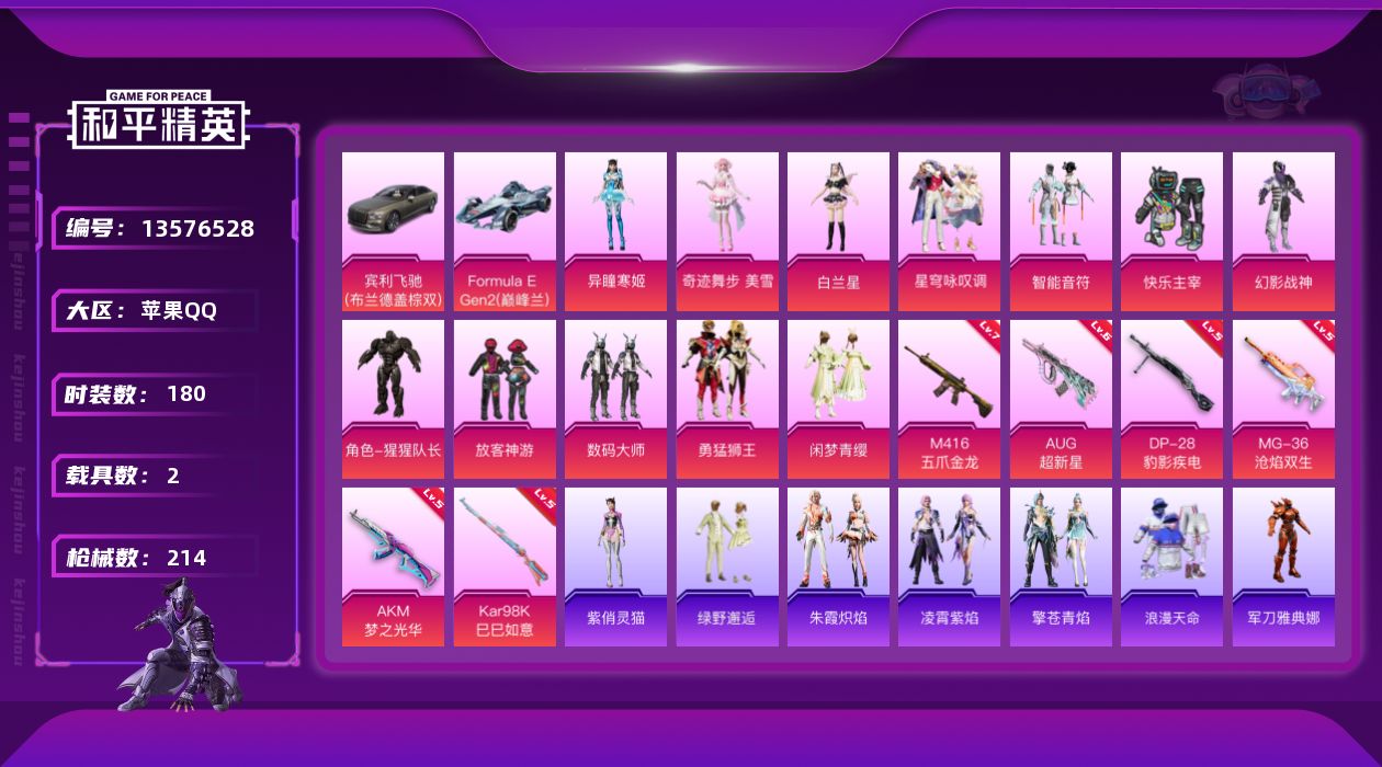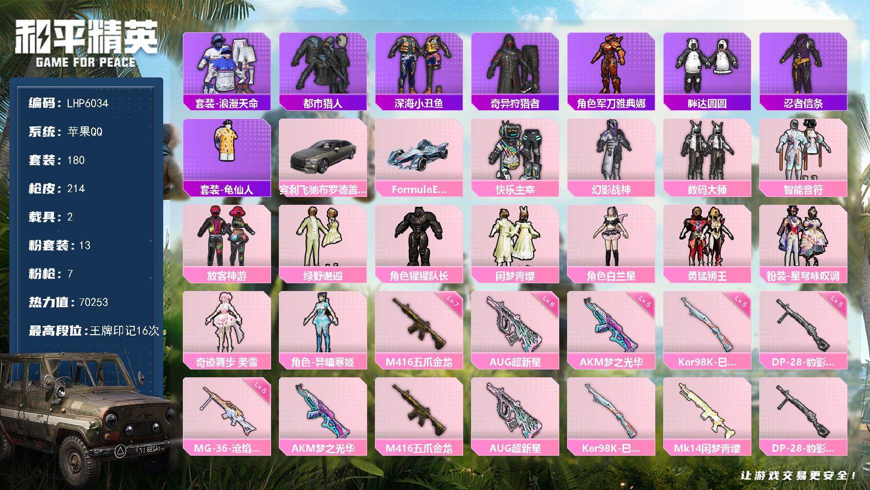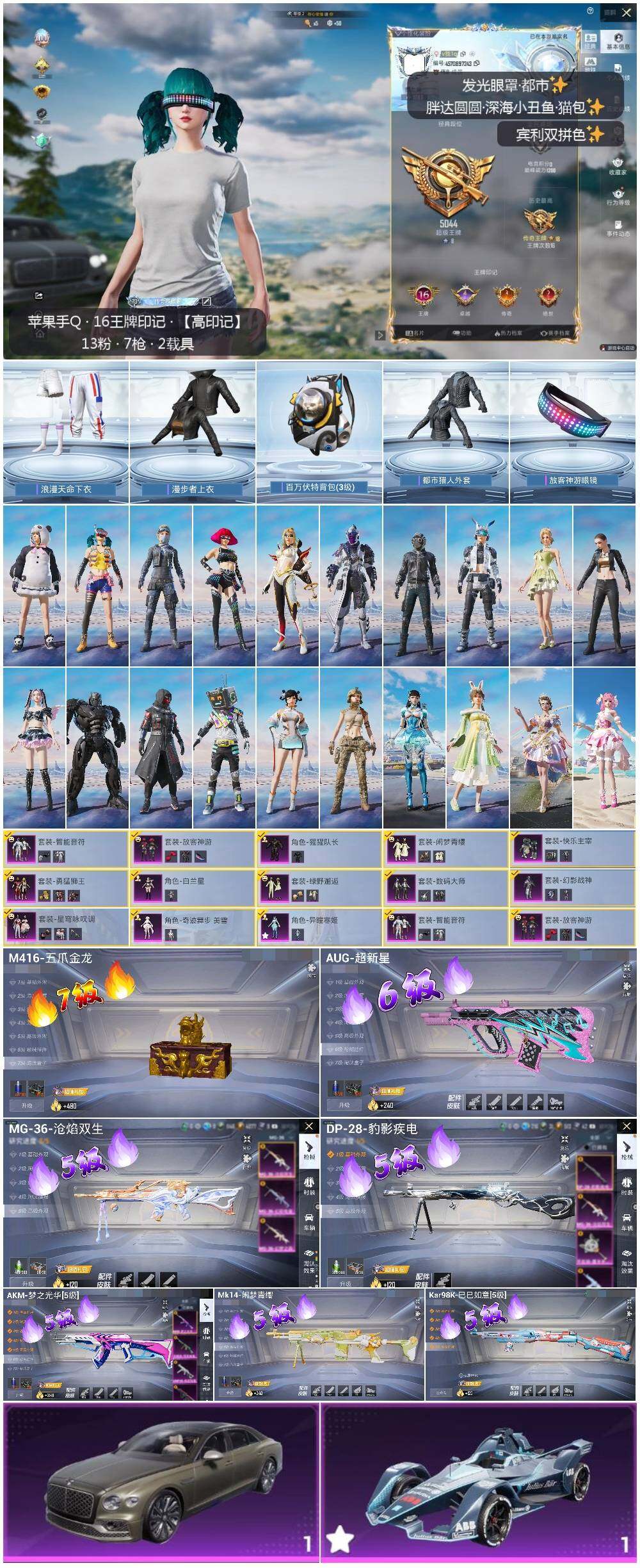 [13576528]【店主推荐捡漏号!可直接换绑】/素材身法号/绝世印记2/地铁满天赋 苹果 手Q-13粉装-7特效枪-2载具-1粉色飞行器-7w热力值-16王牌印记-180套装-214枪皮【热门品类】:套装-浪漫天命,套装-都市猎人,套装-深海小丑鱼,套装-奇异狩猎者,角色-军刀雅典娜,套装-胖达圆圆,套装-忍者信条,套装-龟仙人【粉色载具】:宾利飞驰(布罗德盖棕双色),Formula E Gen2(巅峰兰)【粉色套装】:粉装-快乐主宰,粉装-幻影战神,粉装-数码大师,粉装-智能音符,粉装-放客神游,粉装-绿野邂逅,角色-猩猩队长,粉装-闲梦青缨,角色-白兰星,粉装-勇猛狮王,粉装-星穹咏叹调,角色-奇迹舞步 美雪,角色-异瞳寒姬【粉色枪皮等级】:AKM-梦之光华(五级),M416-五爪金龙(七级),AUG-超新星(六级),Kar98K-巳巳如意(五级),DP-28-豹影疾电(五级),MG-36-沧焰双生(五级)【粉色飞行器】:梦幻火箭飞行器