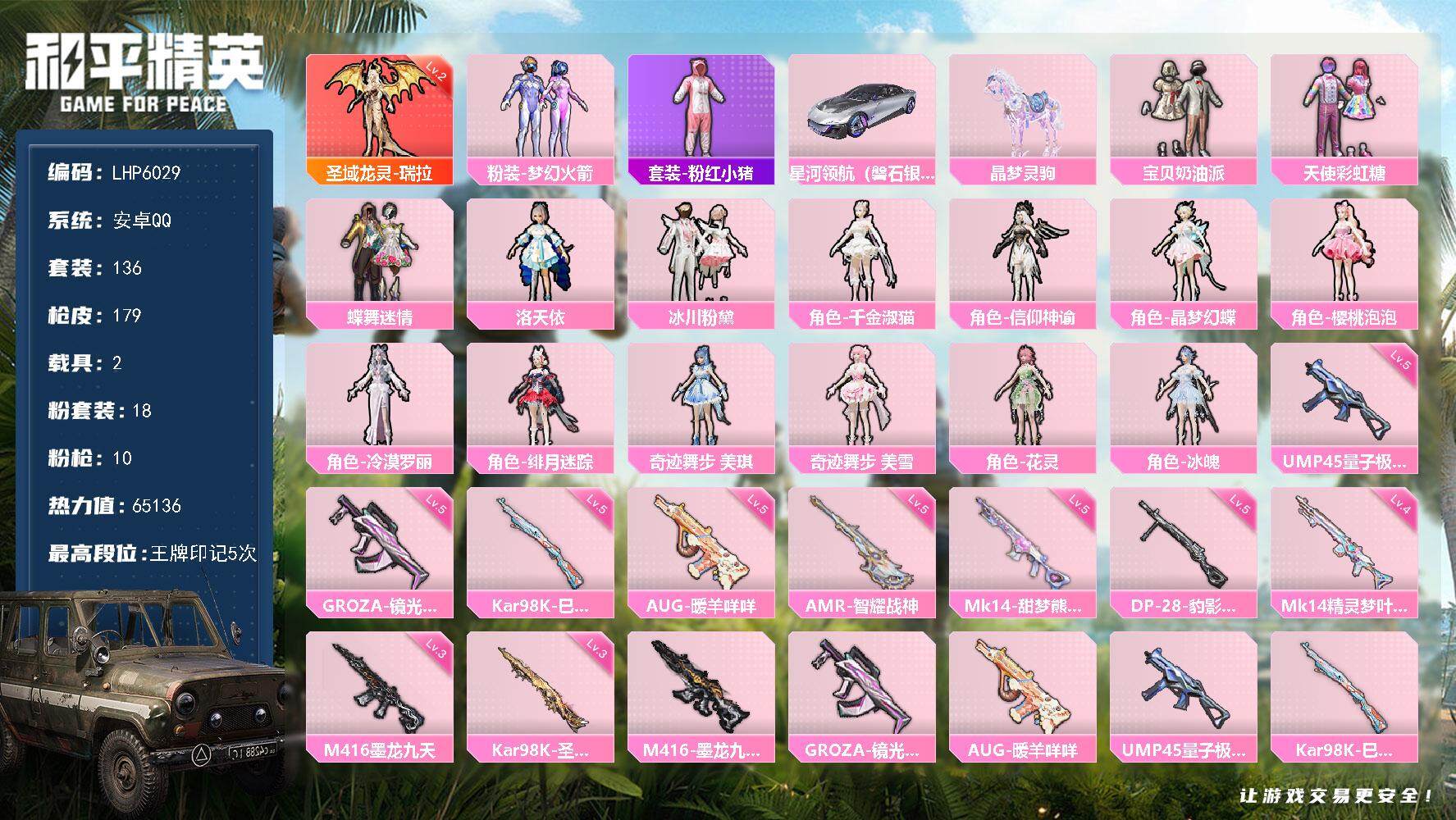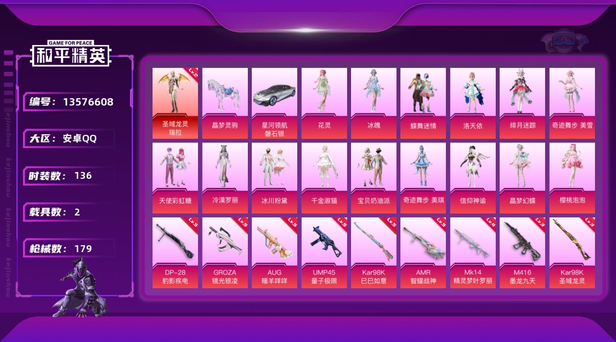 [13576608]【店主推荐捡漏号!可直接换绑】/素材身法号 安卓 手Q-1神装-18粉装-10特效枪-2载具-8粉色飞行器-6.5w热力值-5王牌印记-136套装-179枪皮【红色神装等级】:圣域龙灵-瑞拉(二级)【热门品类】:粉装-梦幻火箭,套装-粉红小猪【粉色载具】:星河领航(磐石银),晶梦灵驹【粉色套装】:粉装-宝贝奶油派,粉装-天使彩虹糖,粉装-蝶舞迷情,粉装-梦幻火箭,角色-洛天依,粉装-冰川粉黛,角色-千金淑猫,角色-信仰神谕,角色-晶梦幻蝶,角色-樱桃泡泡,角色-冷漠罗丽,角色-绯月迷踪,角色-奇迹舞步 美琪,角色-奇迹舞步 美雪,角色-花灵,角色-冰魄【粉色枪皮等级】:M416-墨龙九天(三级),GROZA-镜光银凌(五级),AUG-暖羊咩咩(五级),UMP45-量子极限(五级),Kar98K-巳巳如意(五级),Kar98K-圣域龙灵(三级),Mk14-精灵梦叶罗丽(四级),Mk14-甜梦熊击(五级),AMR-智耀战神(五级),DP-28-豹影疾电(五级)【粉色飞行器】:酣梦熊熊飞行器,梦幻火箭飞行器,沙丘之主天马,镜域双华-灵镜之阶,信仰神谕飞行器,圣域金龙飞行器