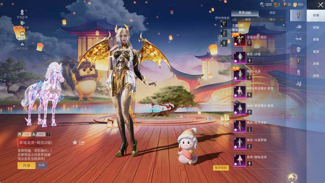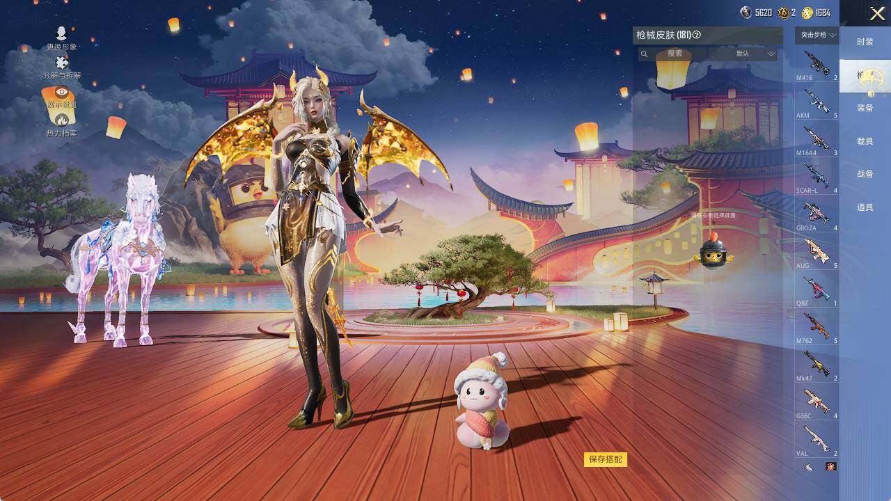 M416-墨龙九天,GROZA-镜光银凌,AUG-暖羊咩咩,UMP45-量子极限,Kar98K-巳巳如意,Kar98K-圣域龙灵,Mk14-精灵梦叶罗丽