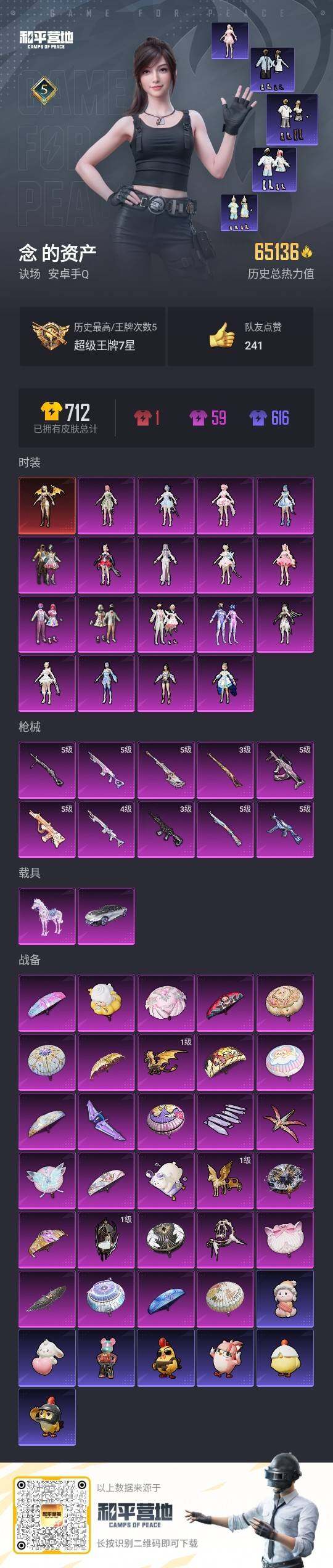 - [12949167]女公主号/地铁满天赋【特价急出/详情看图】:苹果 手Q-8粉装-7特效枪-1载具-4粉色飞行器-5.1w热力值-7王牌印记-104套装-174枪皮【热门品类】:粉装-梦幻火箭,套装-浪漫天命,套装-暗影哥特,套装-粉红小猪【粉色载具】:冰绡玉鳞【粉色套装】:粉装-宝贝奶油派,粉装-天使彩虹糖,粉装-梦幻火箭,粉装-第五大道,角色-智耀战神,粉装-星穹咏叹调,角色-绯穹魔姬,角色-冰魄【粉色枪皮等级】:AKM-甜心宝贝(六级),AUG-暖羊咩咩(五级),UMP45-量子极限(五级),P90-魔童闹海 敖丙(二级),Kar98K-巳巳如意(五级),DP-28-豹影疾电(五级),平底锅-喜羊羊与灰太狼(一级)【粉色飞行器】:绯果甜心飞行器,雀灵庇佑飞行器,灵珠游龙飞行器