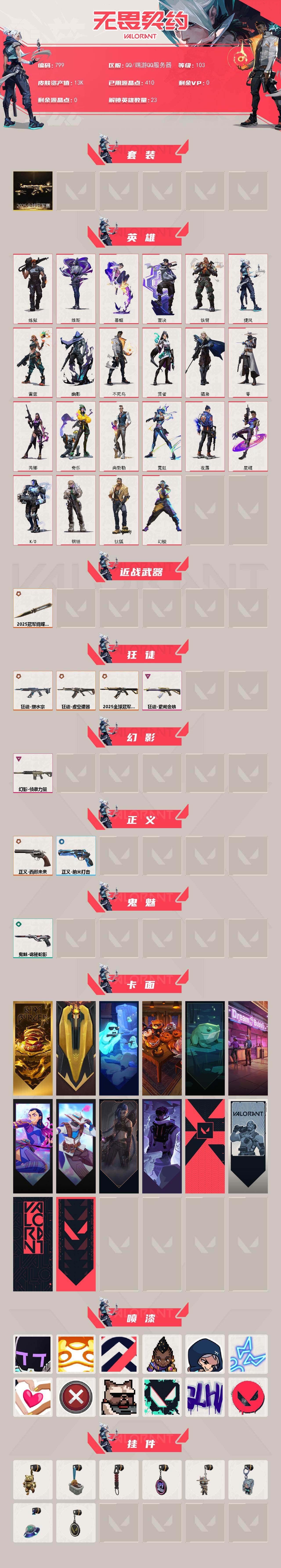 [13745116]【套装】:2025全球冠军赛套装 【英雄】:幻棱,炼狱,维斯,暮蝶,钛狐,壹决,铁臂,捷风,雷兹,幽影,不死鸟,贤者,猎枭,零,芮娜,奇乐,尚勃勒,霓虹,夜露,星礈,K/O,钢锁 【近战 武器】:近战武器-2025全球冠军赛 蝴蝶刀 【狂徒】:狂徒-2025全球冠军赛,狂徒-塑水宗,狂徒-虚空遗器,狂徒-紫阙金琅 【幻影】:幻影-侦察力量 【正义】:正义-西部未来,正义-纳米打击 【鬼魅】:鬼魅-诡秘蛇影 【卡面】:终章:激斗汉堡 卡面,进入射程 卡面,精灵大战 卡面,南瓜盛典 卡面,霓帧牛蛙 卡面,梦幻奶茶 卡面,无畏契约GO!第一卷:芮娜 卡面,无畏契约GO!第一卷:零 卡面,《双城之战》金克丝 卡面,逆向独行 卡面 ,代号红色 卡面,新兵报到 卡面,V契约 卡面,无畏契约 卡面 【喷漆】:请求重启 喷漆,嗨宝南瓜灯 喷漆,控场勿近 喷漆,像素星礈 喷漆,捷风差距 喷漆,霓光四射 喷漆,双人比心 喷漆,买装还是存钱 喷漆,关门放狗 喷漆,胜利属于无畏契约 喷漆,GLHF 喷漆,无畏契约 喷漆 【挂饰】:终章:猫猫木乃伊 挂饰,悠闲鸡块 挂饰,伞绳 挂饰,第九季//第三幕 纪念币 挂饰,无畏契约GO!第一卷 零 挂饰,袖珍捷风 挂饰,天外飞客 挂饰,无畏契约 纪念币 挂饰
