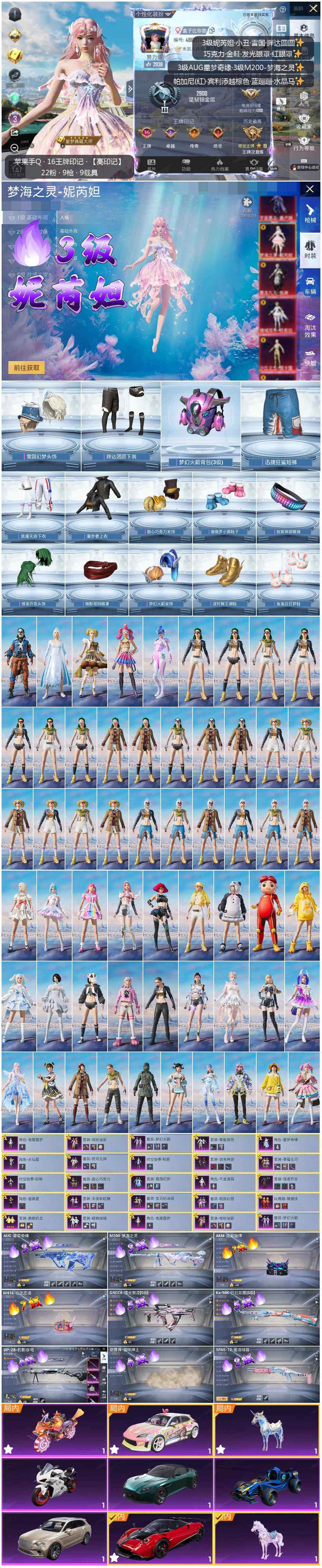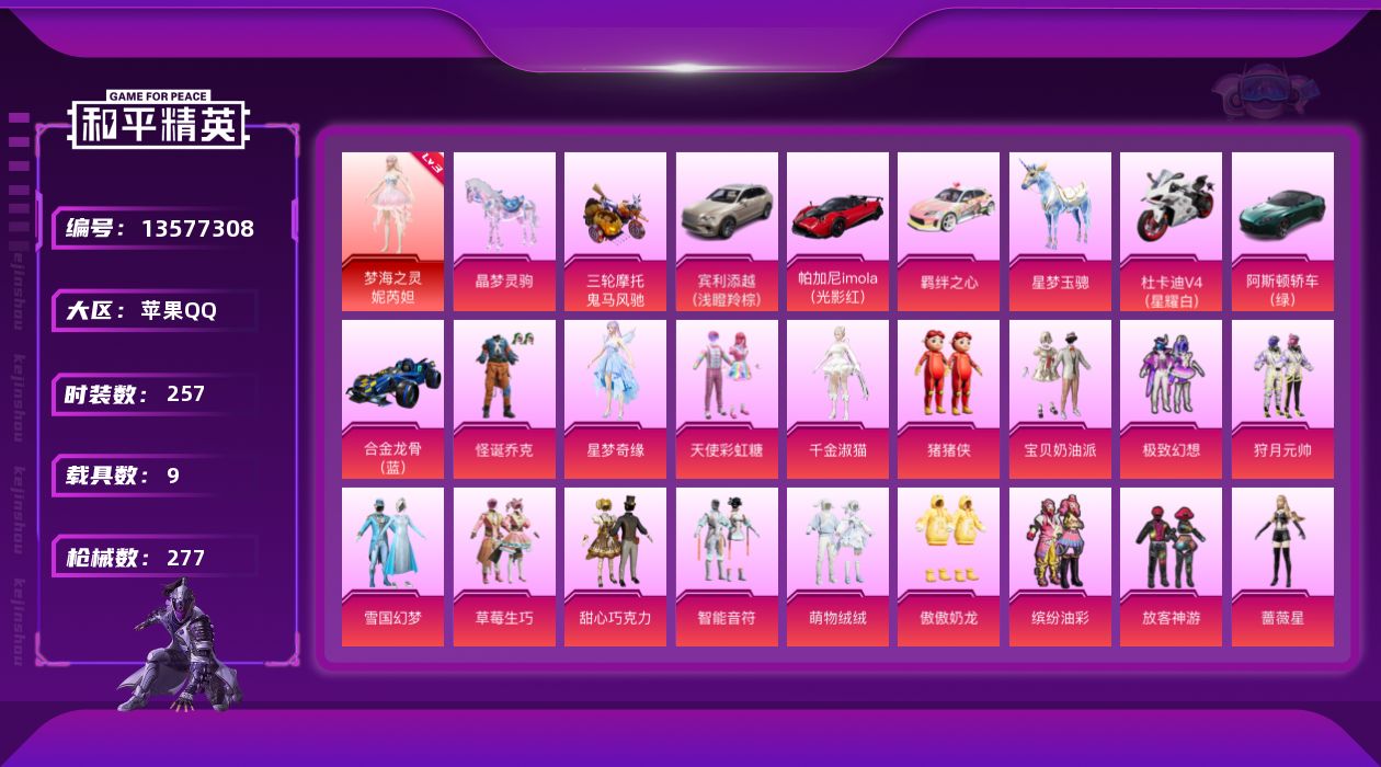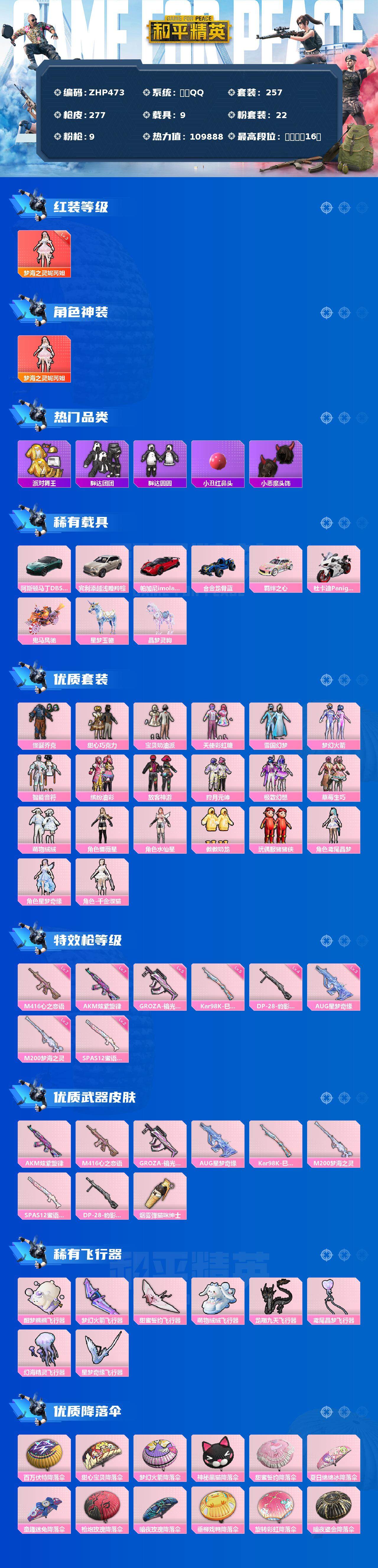 [13577308]3级妮芮妲!雪国幻梦怪诞乔克!巧克力三姐妹!苹果 手Q-1神装-22粉装-9特效枪-9载具-8粉色飞行器-109888热力值-16王牌印记-257套装-277枪皮 【红色神装等级】:梦海之灵-妮芮妲(三级) 【红色角色神装】:梦海之灵-妮芮妲 【热门品类】:粉装-怪诞乔克,粉装-雪国幻梦,粉装-梦幻火箭,粉装-缤纷油彩,套装-浪漫天命,套装-派对舞王,套装-胖达团团,套装-胖达圆圆,角色-2P战斗服款,套装-龟仙人,套装-潮萌小黄鸭,套装-暗影哥特,套装-浪漫波比,套装-粉红小猪,小丑红鼻头,小恶魔头饰 【粉色载具】:阿斯顿马丁DBS(绿),宾利添越(浅瞪羚棕),帕加尼imola(光影红),合金龙骨(蓝),羁绊之心,杜卡迪 Panigale V4(星耀白),鬼马风驰,星梦玉骢,晶梦灵驹 【粉色套装】:粉装-怪诞乔克,粉装-甜心巧克力,粉装-宝贝奶油派,粉装-天使彩虹糖,粉装-雪国幻梦,粉装-梦幻火箭,粉装-智能音符,粉装-缤纷油彩,粉装-放客神游,粉装-狩月元帅,粉装-极致幻想,粉装-草莓生巧,粉装-萌物绒绒,角色-蔷薇星,角色-水仙星,粉装-傲傲奶龙,玩偶服-猪猪侠,角色-鸢尾晶梦,角色-星梦奇缘,角色-千金淑猫 【粉色枪皮等级】:AKM-炫紫旋律(七级),M416-心之恋语(七级),GROZA-镜光银凌(五级),AUG-星梦奇缘(三级),Kar98K-巳巳如意(五级),M200-梦海之灵(三级),SPAS-12-蜜语绒猫(二级),DP-28-豹影疾电(四级) 【粉色枪皮】:AKM-炫紫旋律,M416-心之恋语,GROZA-镜光银凌,AUG-星梦奇缘,Kar98K-巳巳如意,M200-梦海之灵,SPAS-12-蜜语绒猫,DP-28-豹影疾电,烟雾弹-猫咪绅士 【粉色飞行器】:酣梦熊熊飞行器,梦幻火箭飞行器,甜蜜誓约飞行器,萌物绒绒飞行器,龙翔九天飞行器,鸢尾晶梦飞行器,幻海精灵飞行器,星梦奇缘飞行器 【粉色降落伞】:百万伏特降落伞,甜心宝贝降落伞,梦幻火箭降落伞,神秘黑猫降落伞,甜蜜誓约降落伞,夏日绵绵冰降落伞,童趣迷兔降落伞,枪炮玫瑰降落伞,暗夜玫瑰降落伞,垂柳戏鸭降落伞,旋转彩虹降落伞,暗夜鎏金降落伞,萌物绒绒降落伞,炫光之旅降落伞,蜜语绒猫降落伞,鸢尾晶梦降落伞,星梦奇缘降落伞,金丰海韵降落伞,千金淑猫降落伞 【稀有套装】:套装-龟仙人,套装-绒宝小鹅,