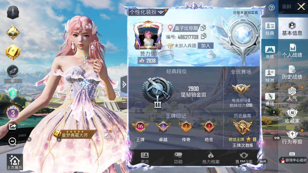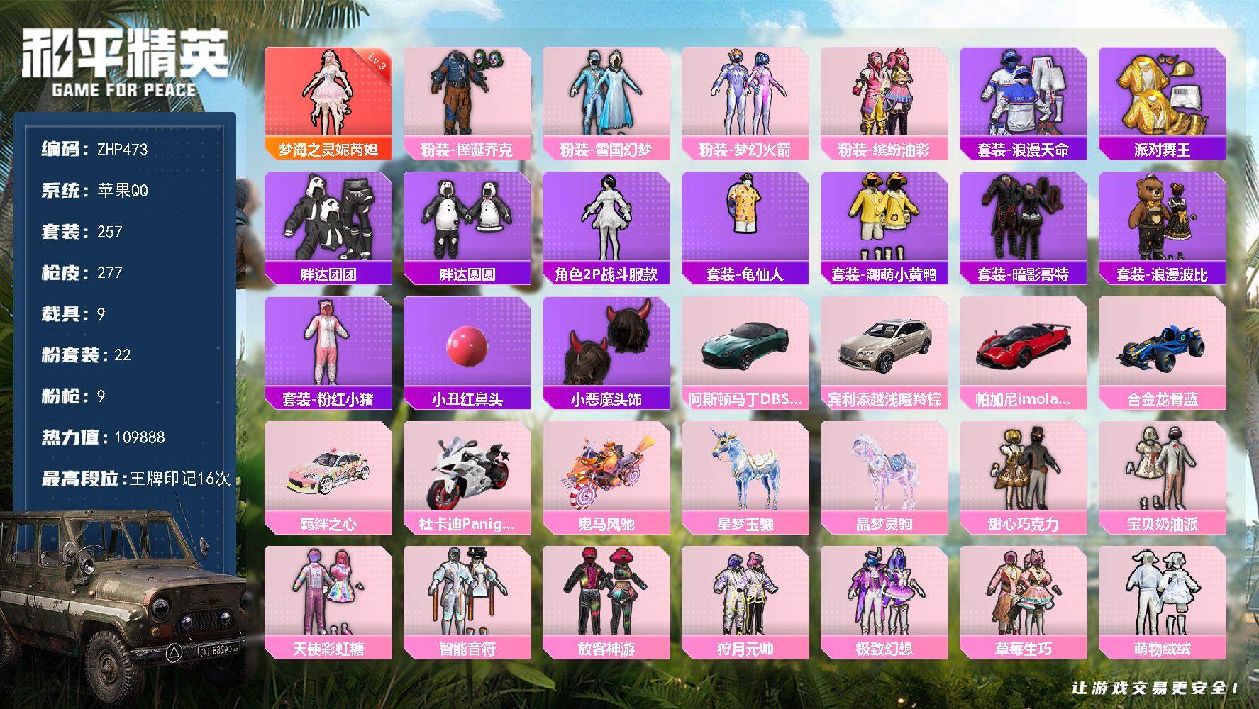 [13577308]3级妮芮妲!雪国幻梦怪诞乔克!巧克力三姐妹!苹果 手Q-1神装-22粉装-9特效枪-9载具-8粉色飞行器-109888热力值-16王牌印记-257套装-277枪皮