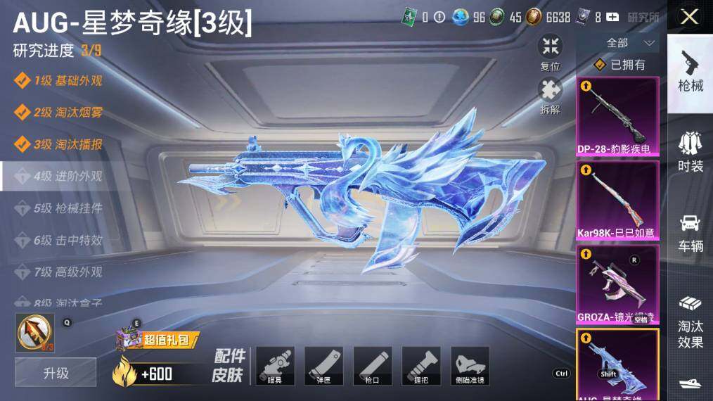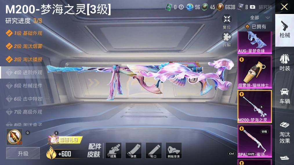 【粉色枪皮等级】:AKM-炫紫旋律(七级),M416-心之恋语(七级),GROZA-镜光银凌(五级),AUG-星梦奇缘(三级),Kar98K-巳巳如意(五级),M200-梦海之灵(三级),SPAS-12-蜜语绒猫(二级),DP-28-豹影疾电(四级)