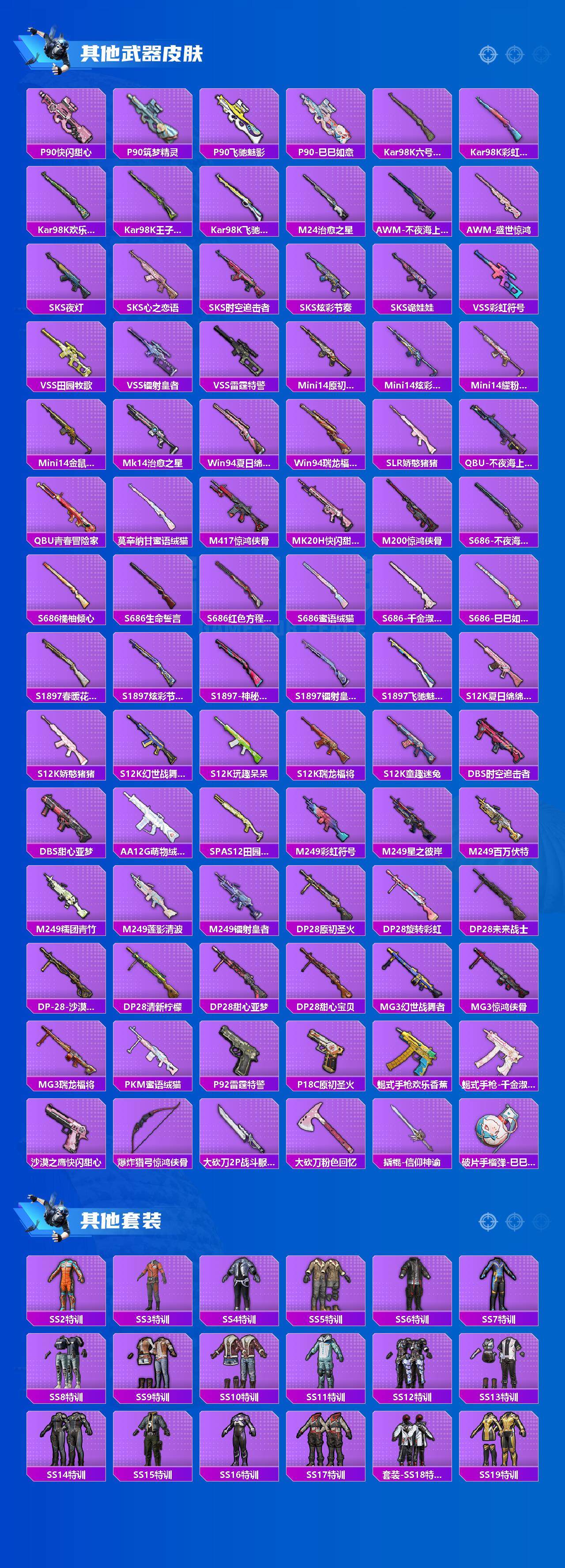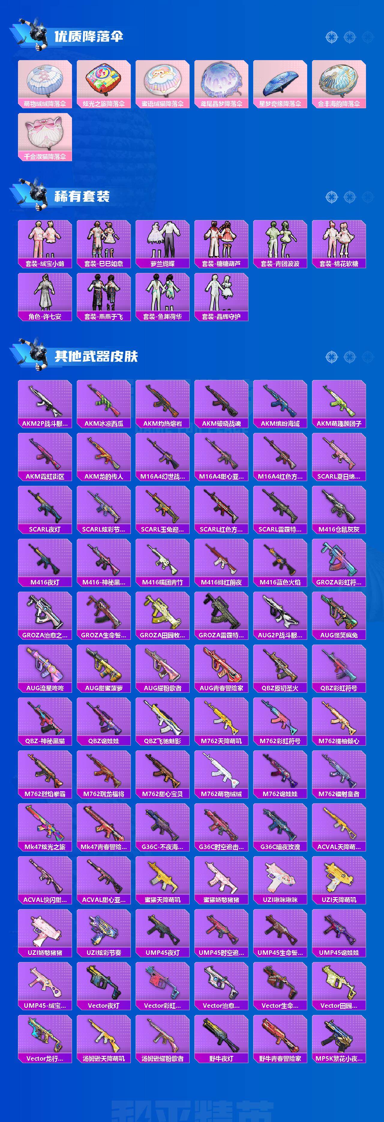 AKM-炫紫旋律,M416-心之恋语,GROZA-镜光银凌,AUG-星梦奇缘,Kar98K-巳巳如意,M200-梦海之灵,SPAS-12-蜜语绒猫,烟雾弹-猫咪绅士